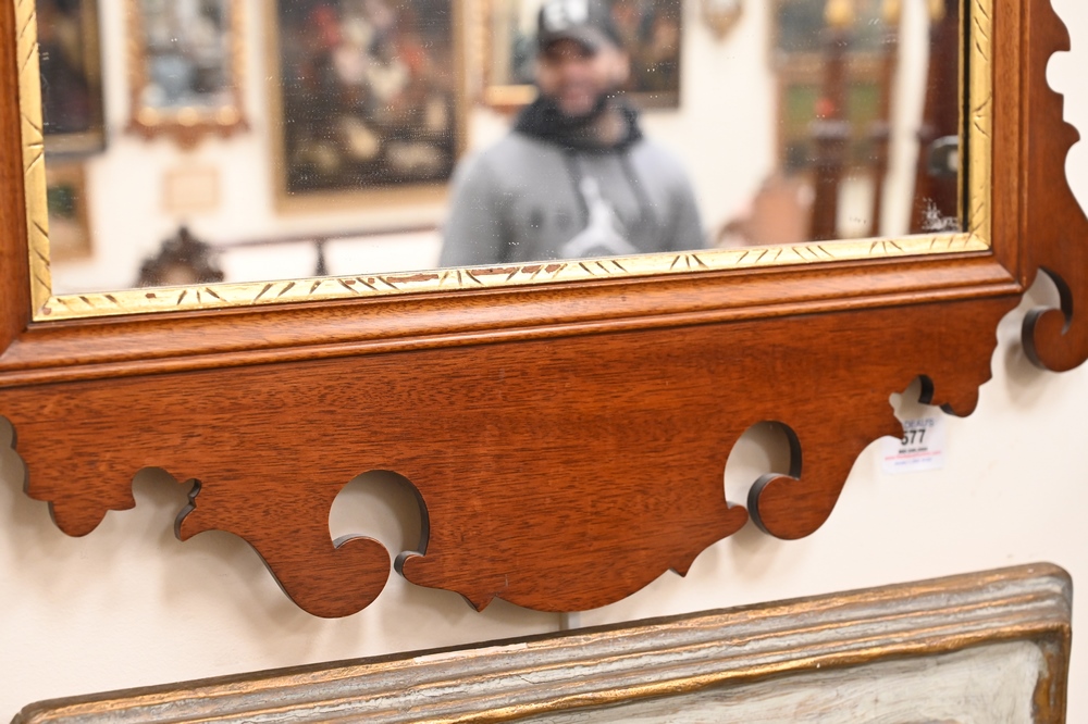 Lot 577: Margolis Custom Mahogany Chippendale Style Mirror, having gilt plume top, height 44 inches, width 23 inches.