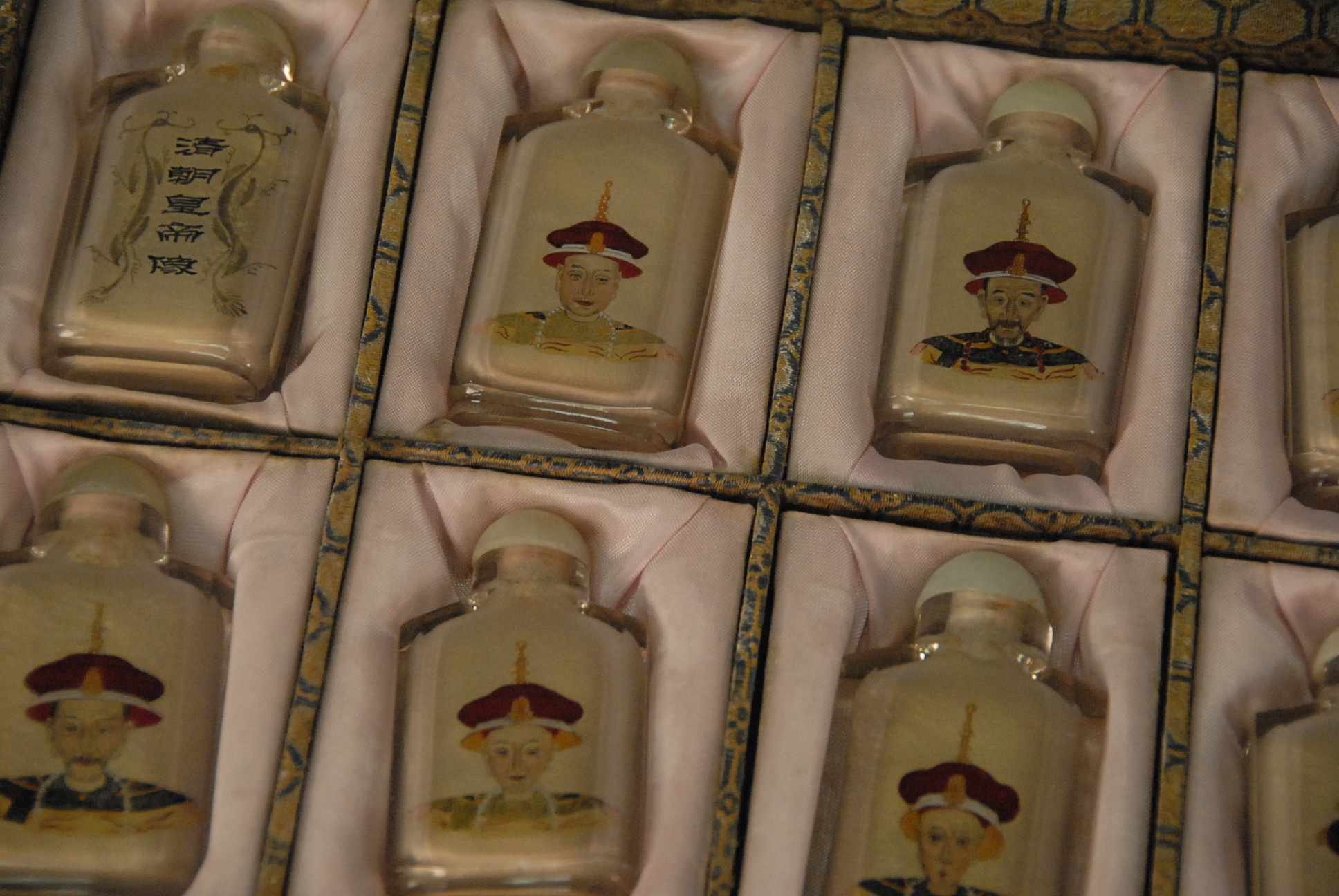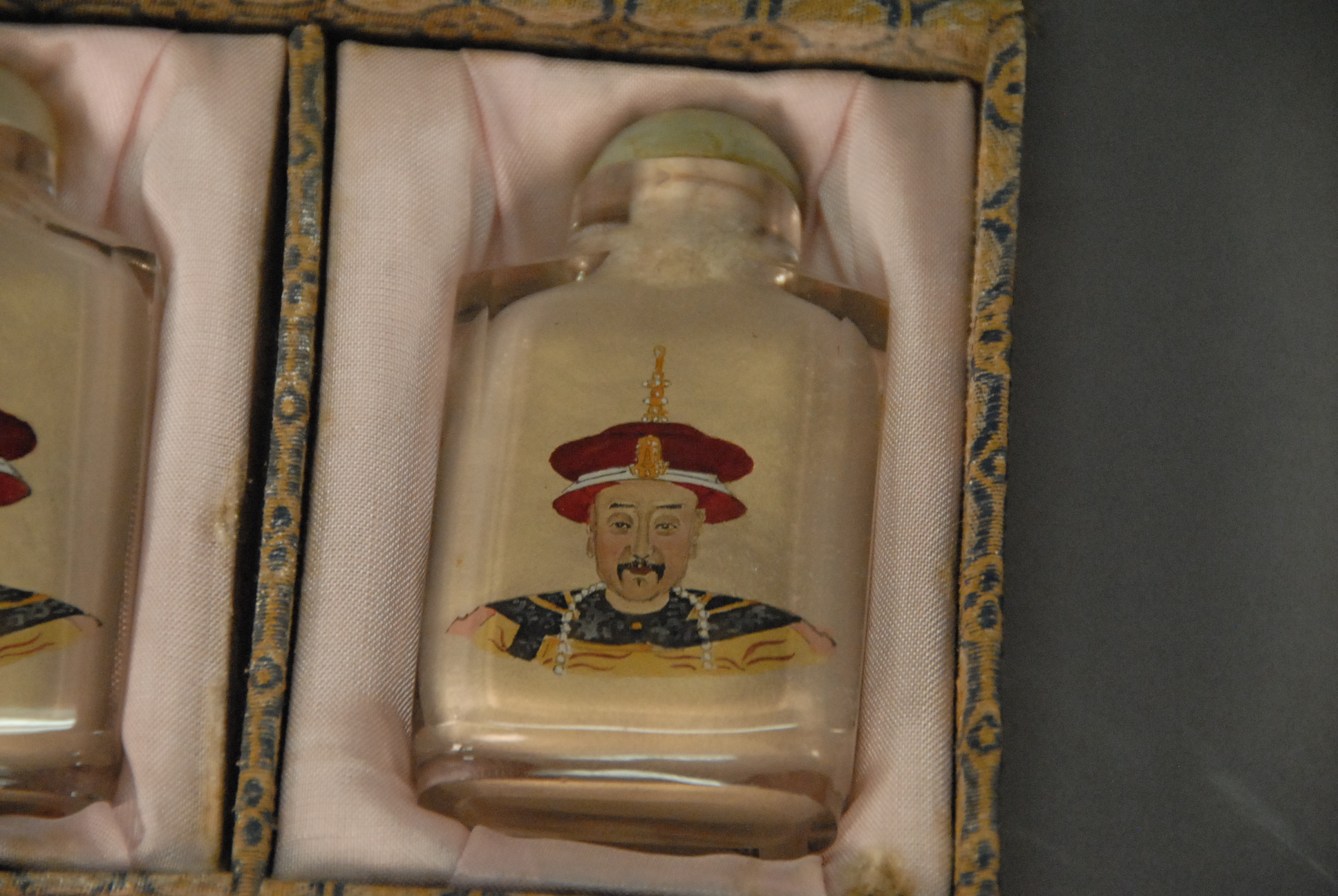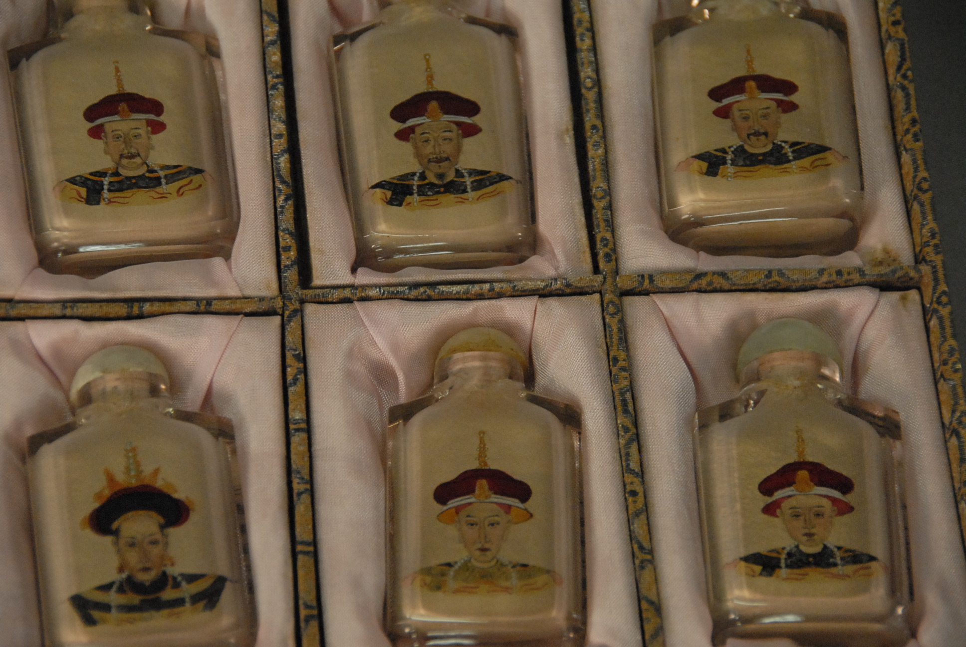 Set of twelve crystal reverse painted emperor and empress snuff bottles. hts. 3in. – 3 1/4in.
