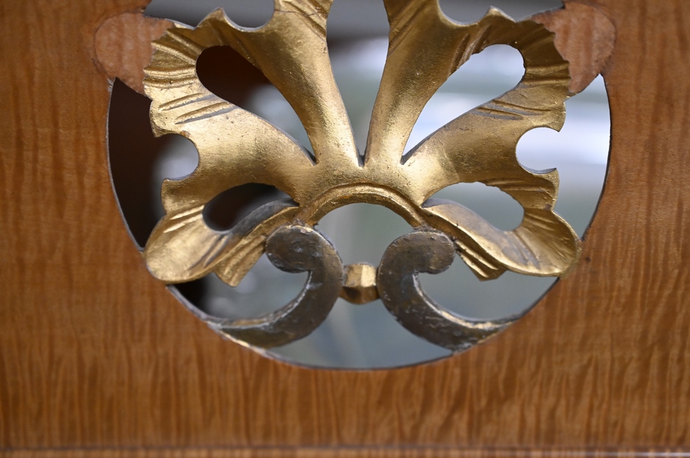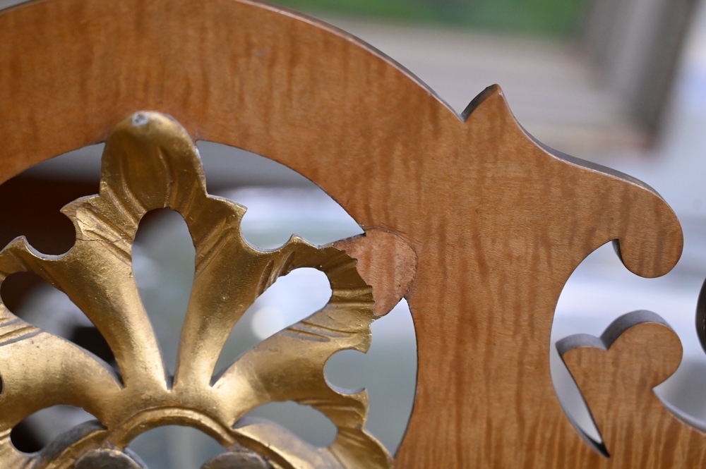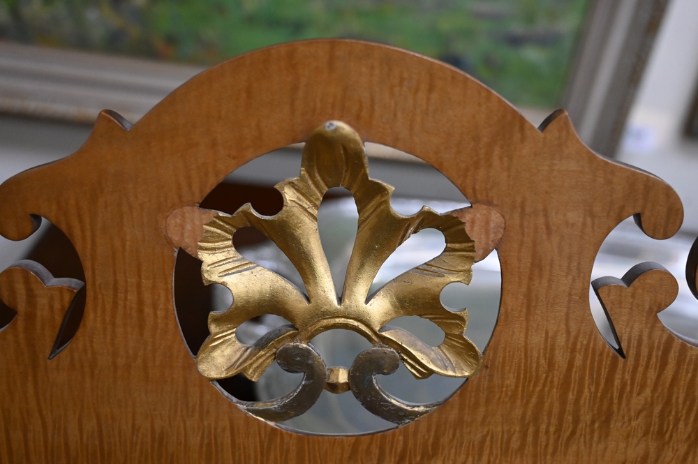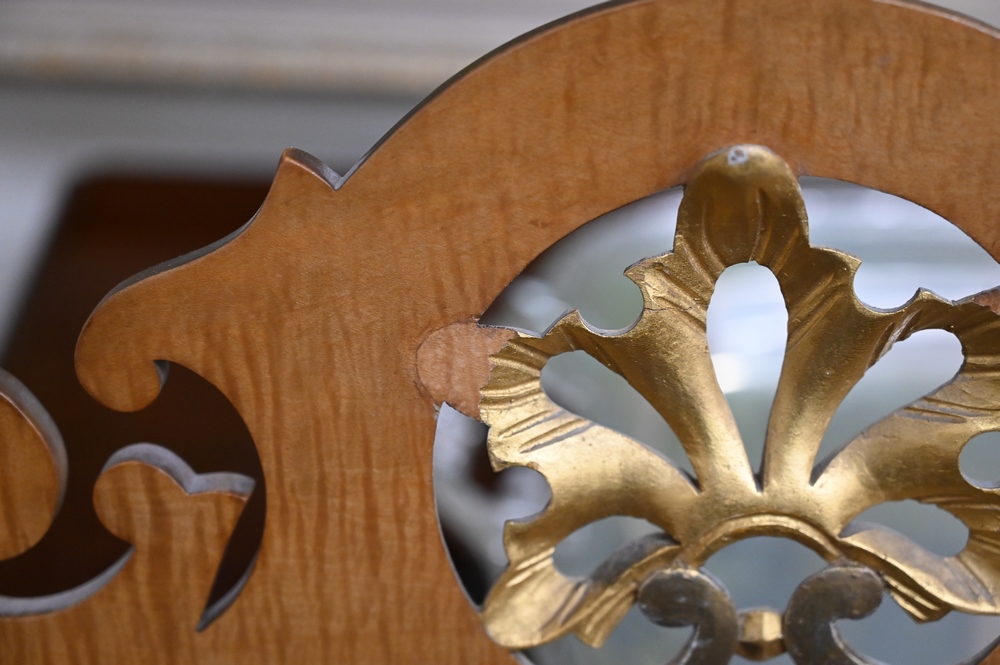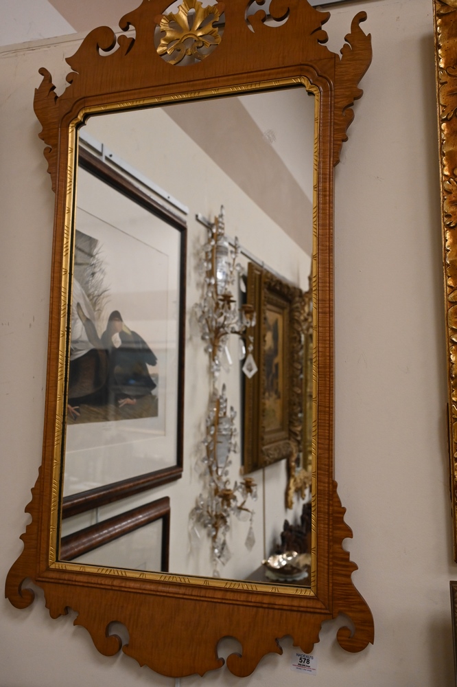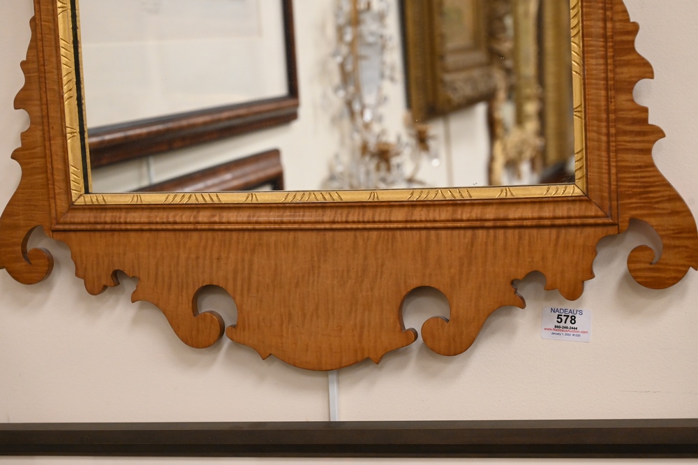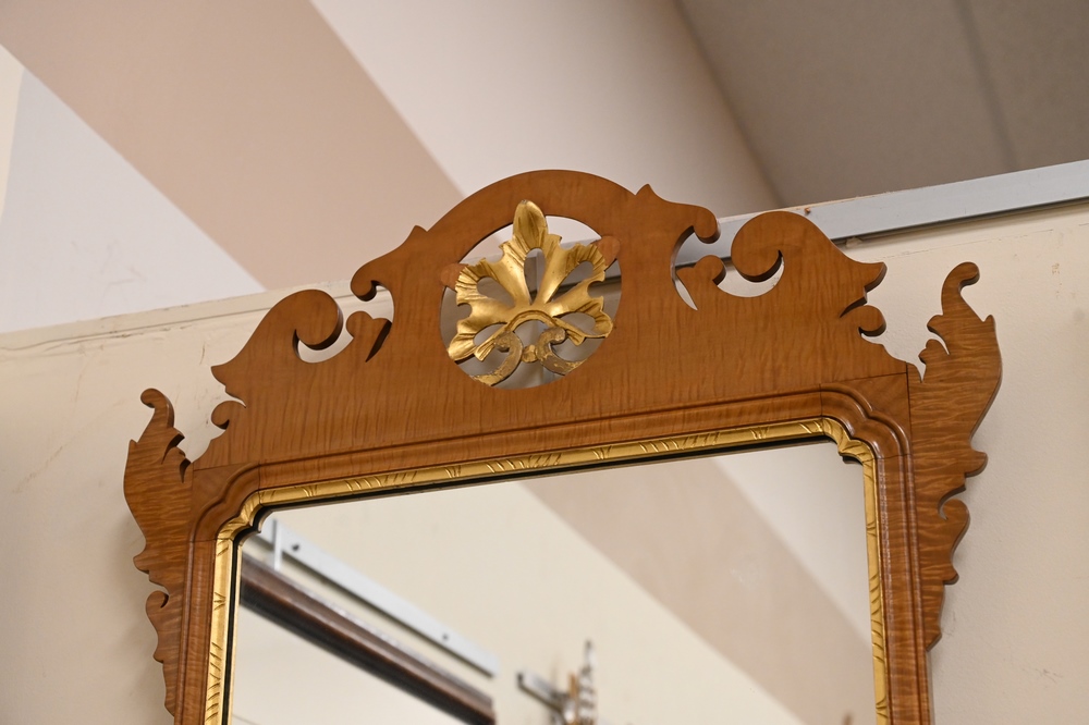 Lot 578: Custom Tiger Maple Chippendale Style Mirror, having pierced carved shell, height 43 1/2 inches, (two chips on shell).