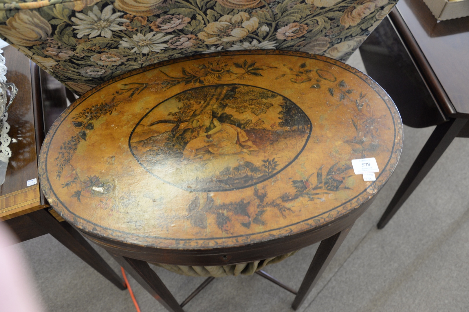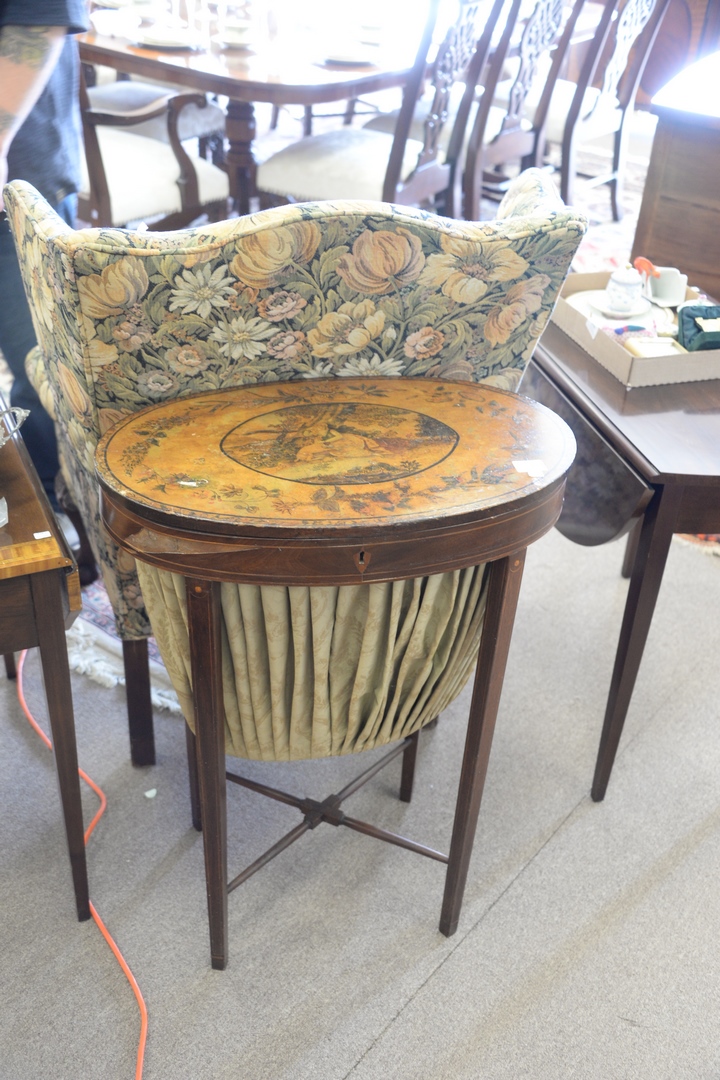 Lot 578: Federal Mahogany Sewing Table having painted paper applied top, over cloth bag, set on square, tapered legs height 32 inches, top 15…