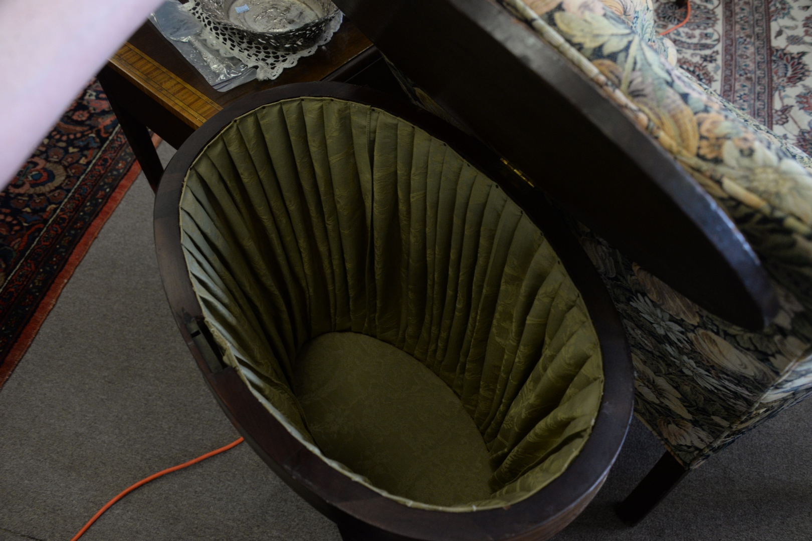 having painted paper applied top, over cloth bag, set on square, tapered legs