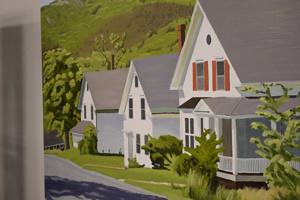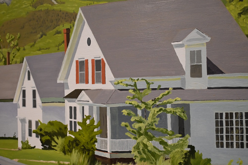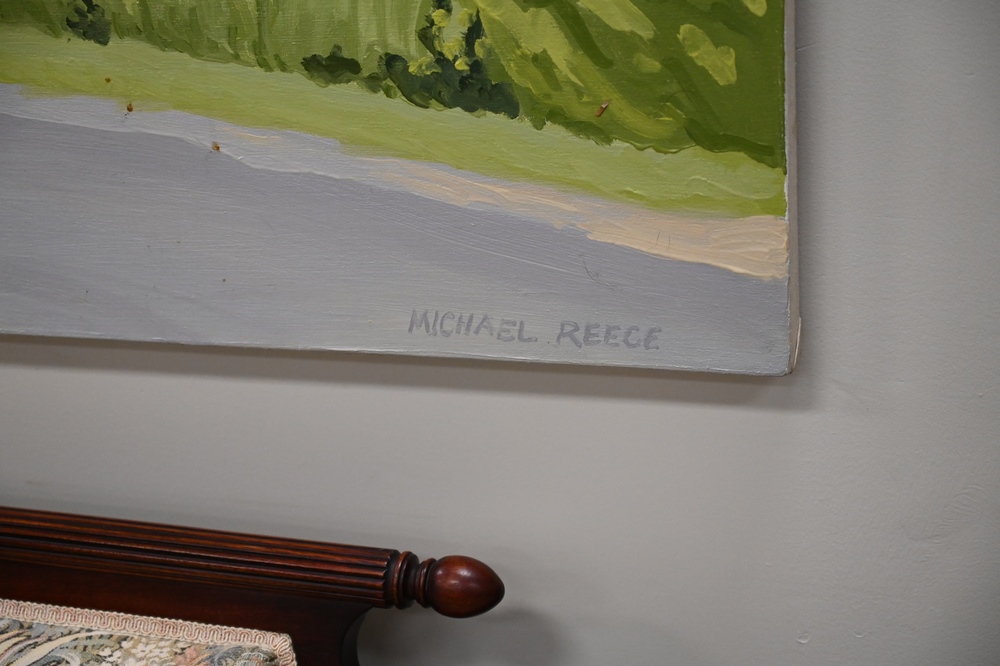 Michael Reece, landscape with three white houses, oil on canvas, 60 x 72 inches, gallery price over $16,000.