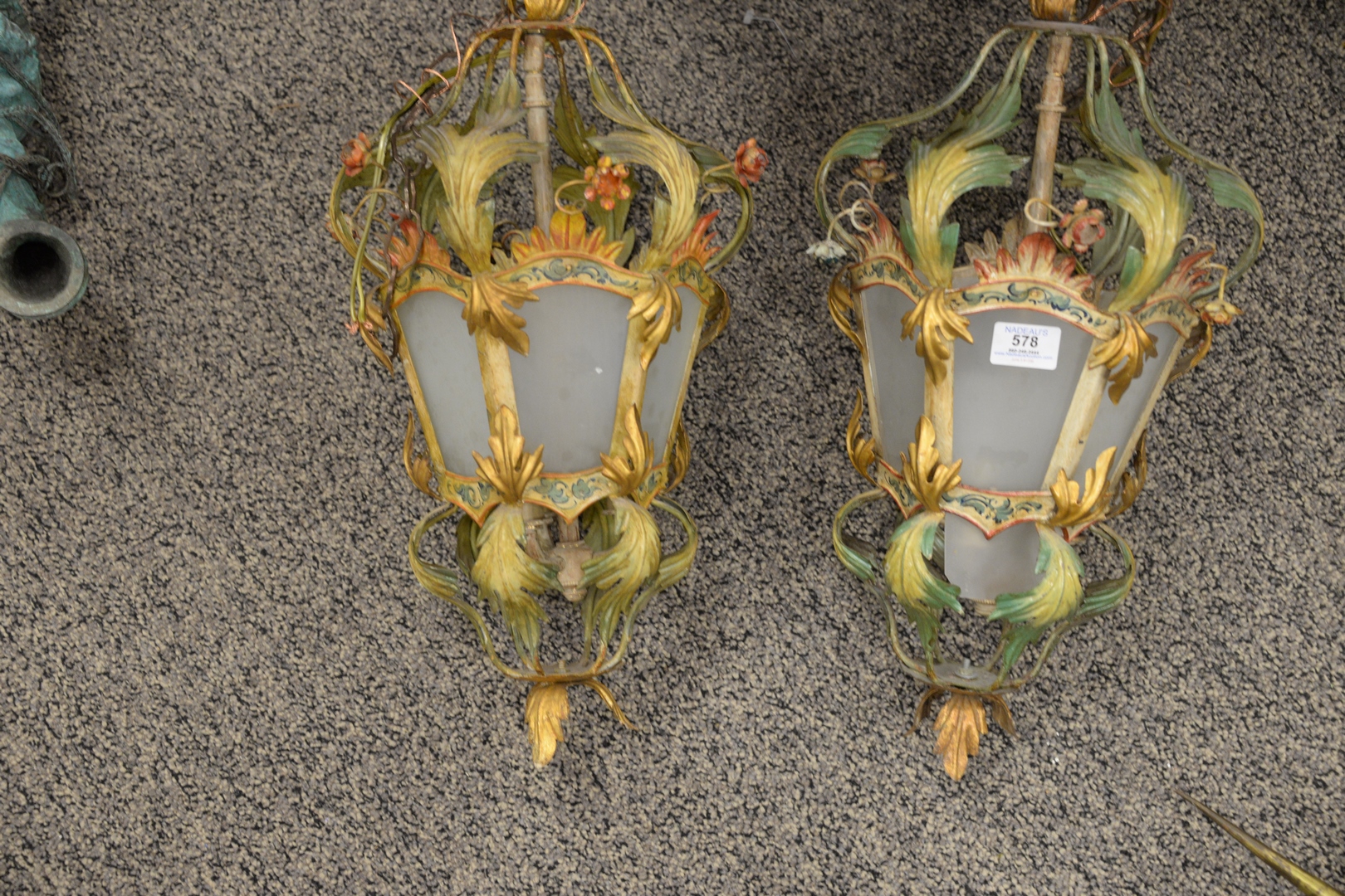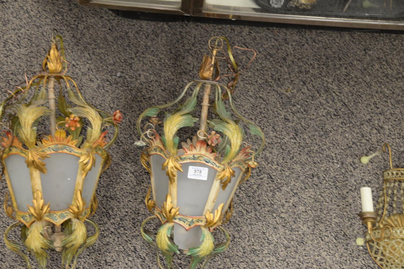 Lot 578: Pair of Italian Painted Tole and Glass Lanterns having flower and leaf decorations, height 22 inches, width 9 inches.
