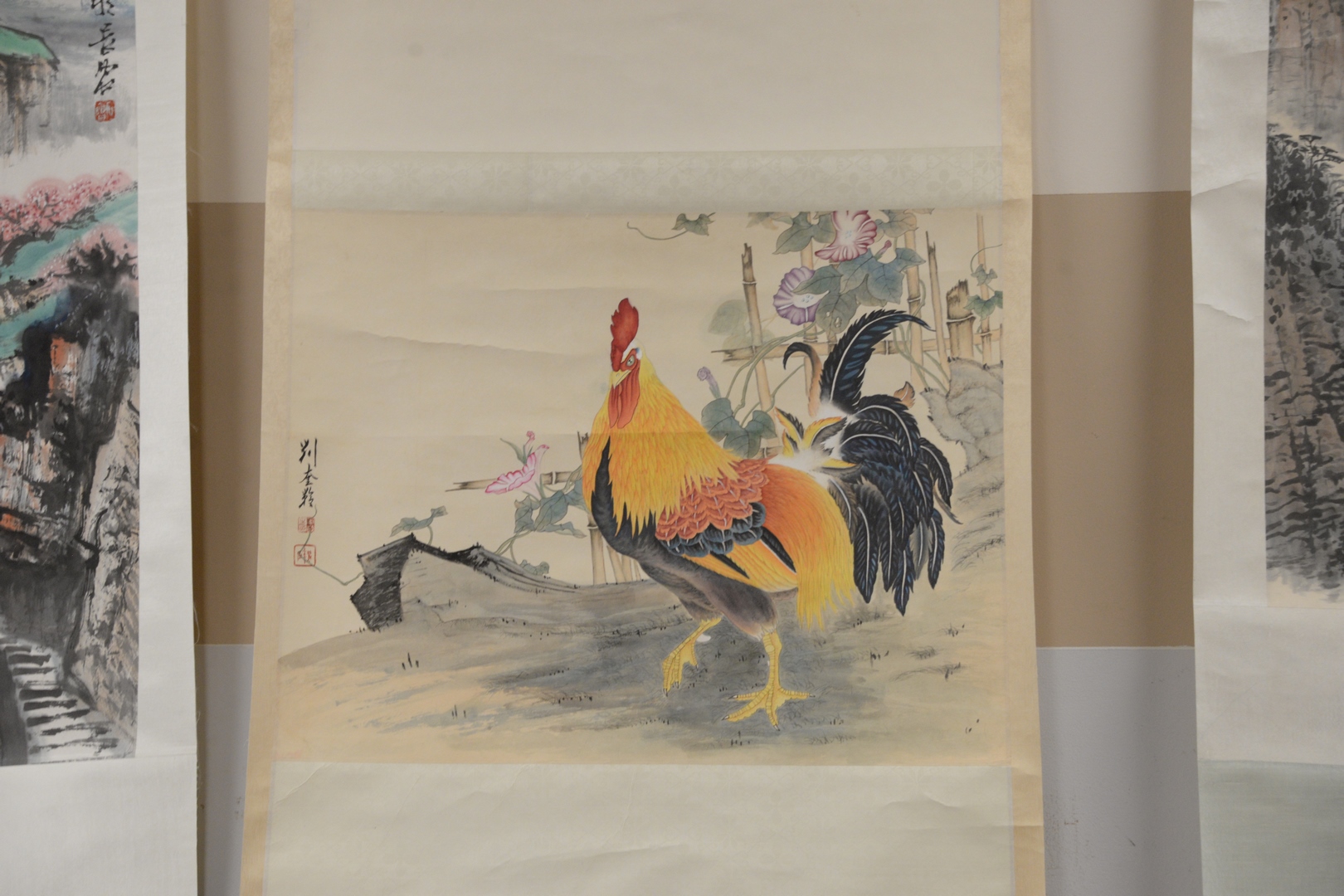 Lot 578: Three Oriental scrolls, watercolor rooster on paper 20 x 25, watercolor landscape of canyon 26 x 17, watercolor girl with goat 27 x 18.