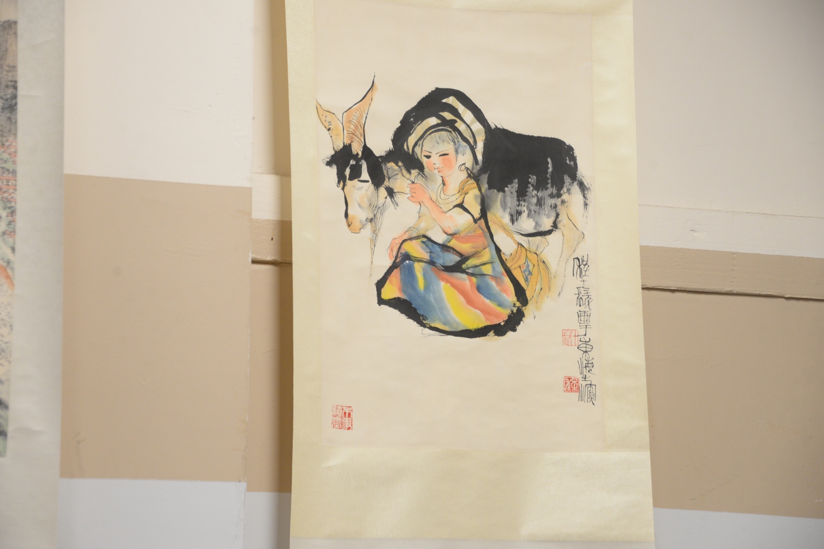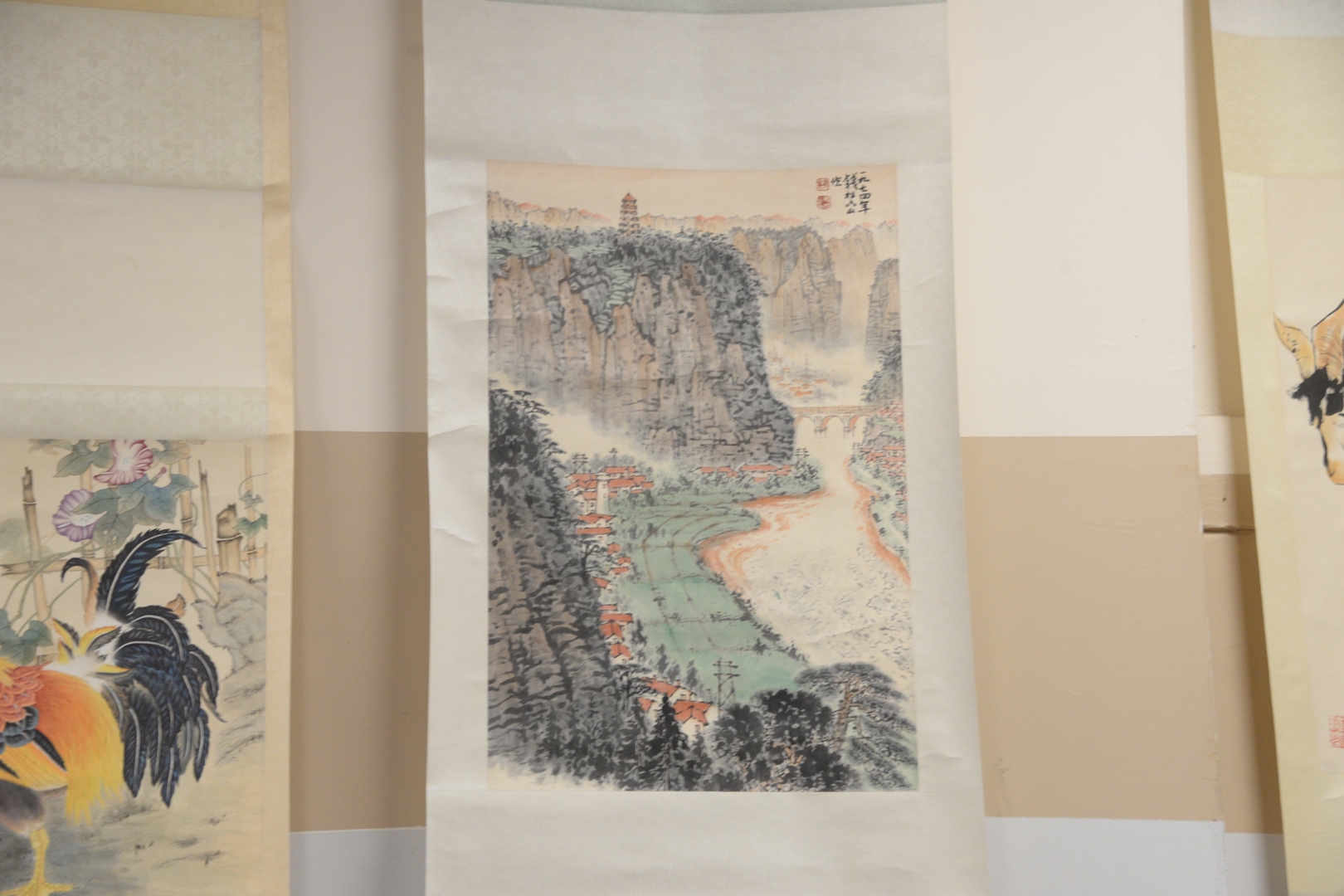 Three Oriental scrolls, watercolor rooster on paper 20 x 25, watercolor landscape of canyon 26 x 17, watercolor girl with goat 27 x 18.