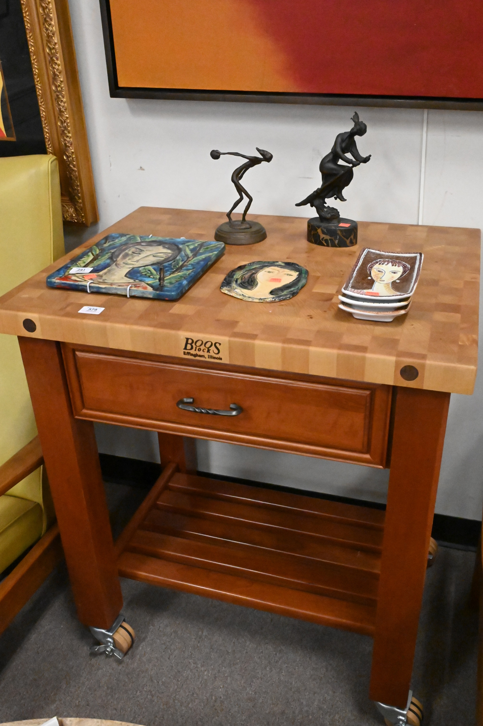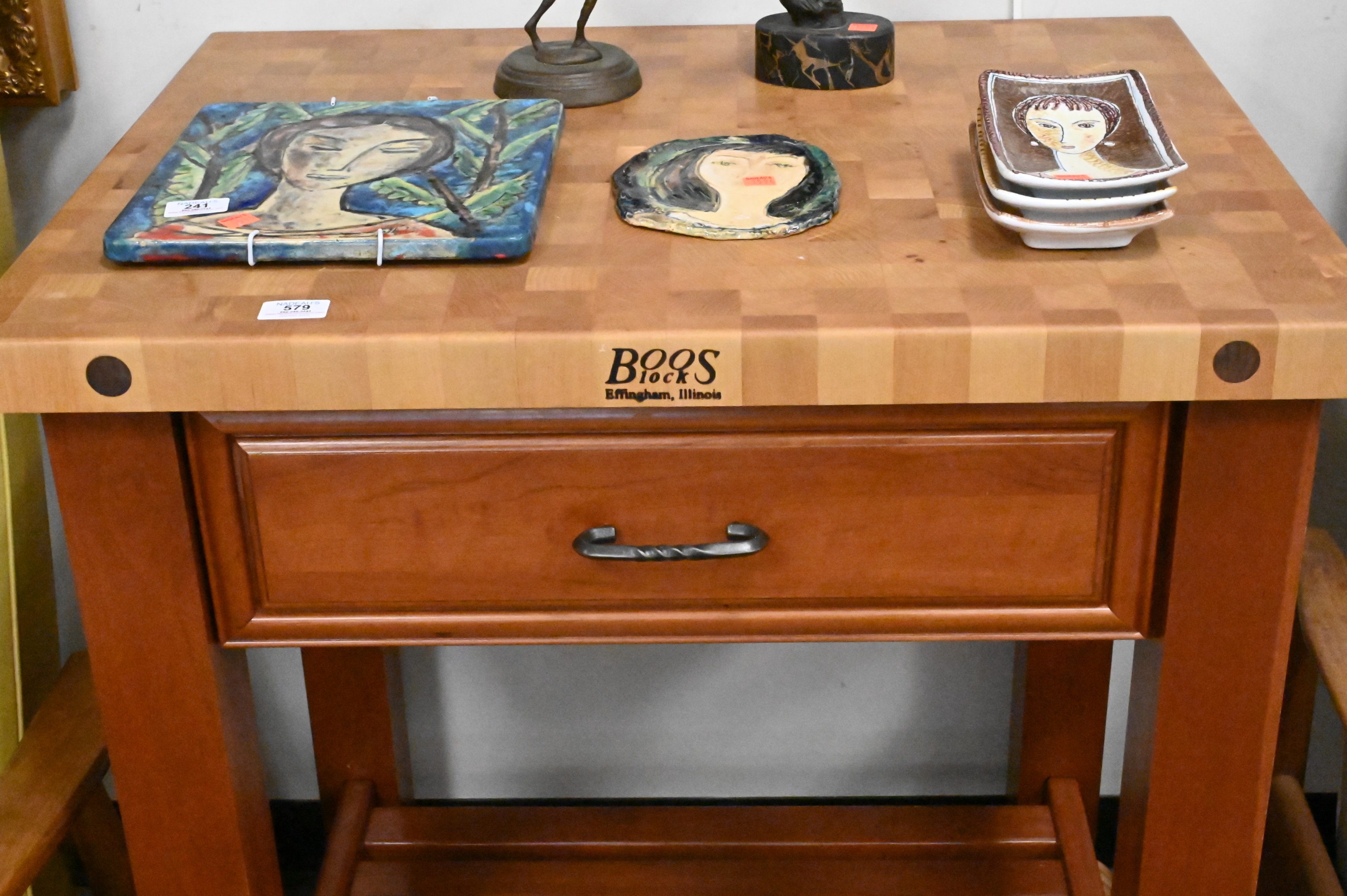 Boos Block Butcher Block, on cherry base with one drawer, all set on wheels, height 35 1/2 inches, top 24 1/2″ x 31 1/2″, Provenance: Julius H Jacobson II a Fifth Avenue Estate.