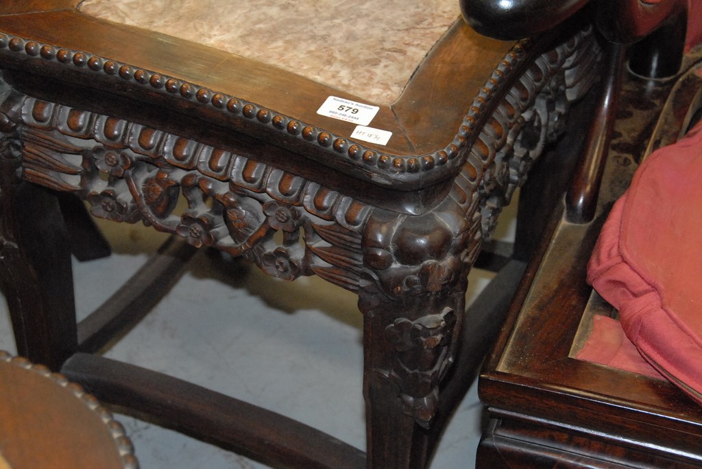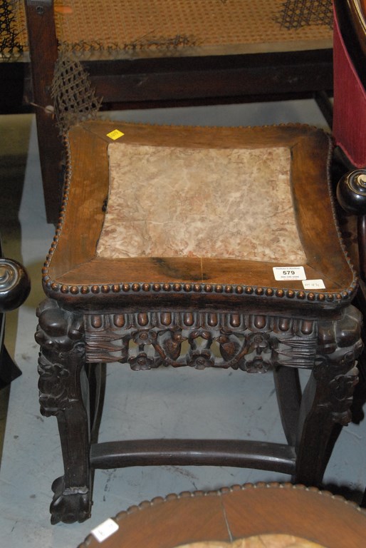 Lot 579: Chinese teakwood low stand with modified square top and inset marble set on ball and claw feet. ht. 18 1/2in. top: 15 x 15