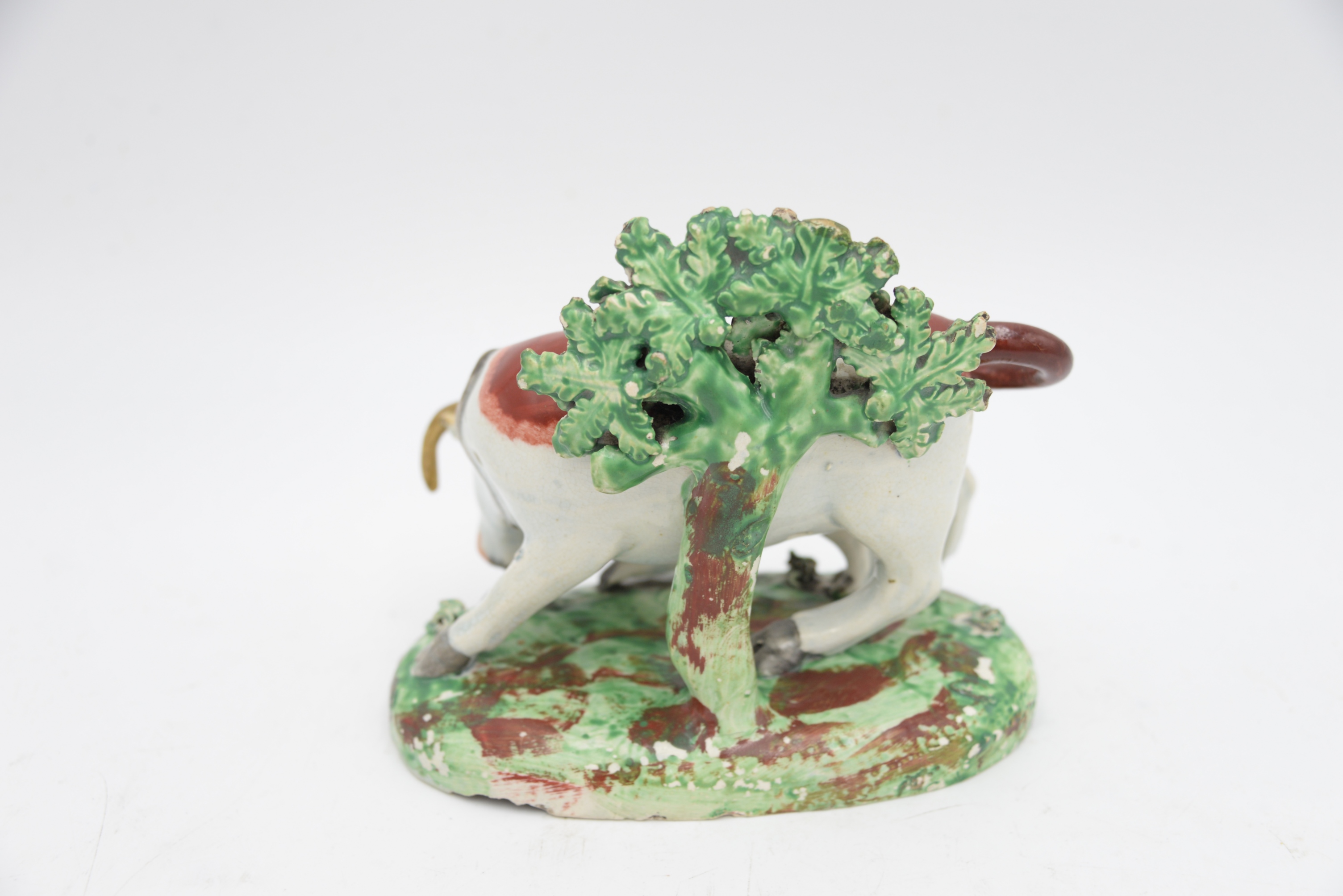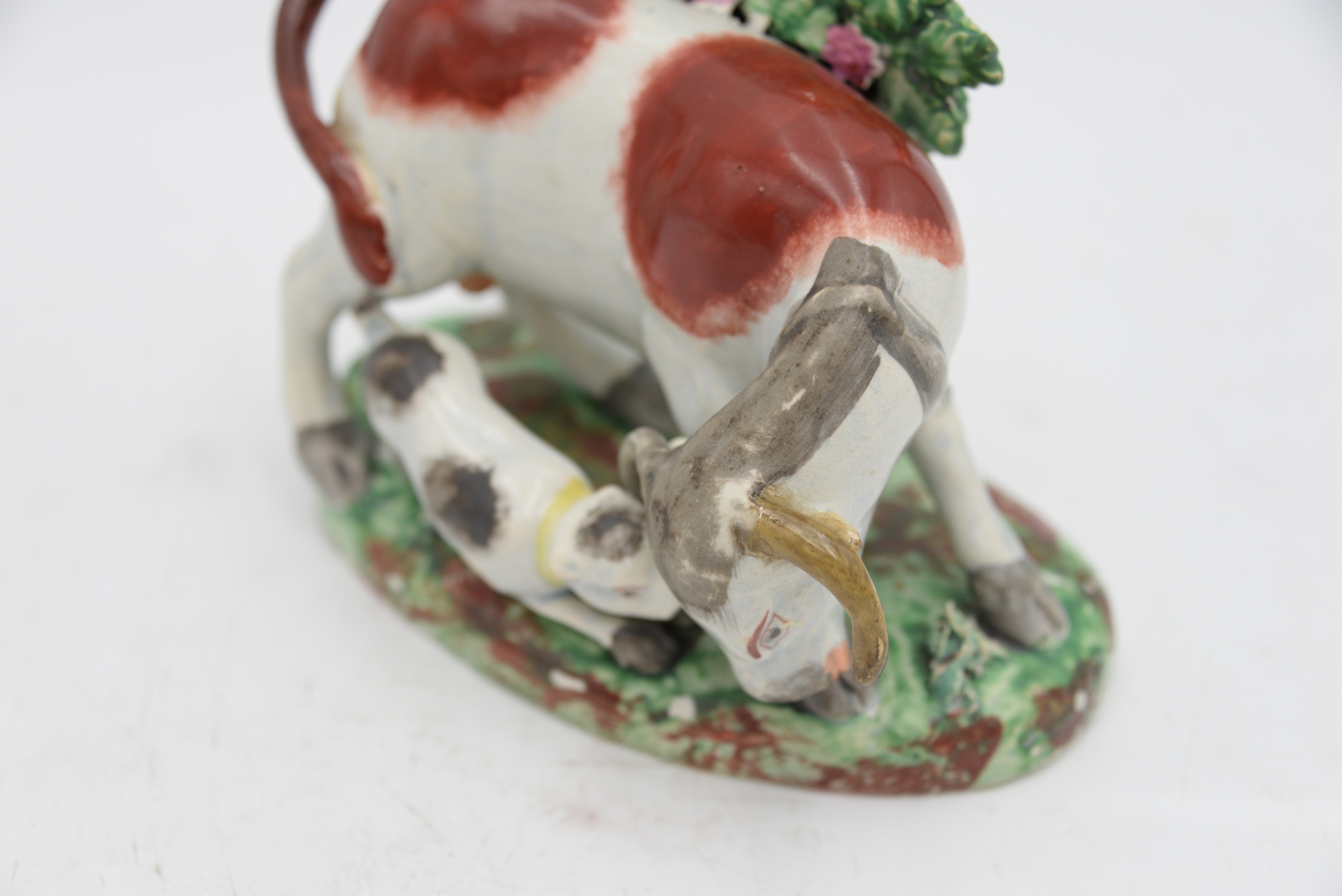 English Staffordshire Bull Baiting Figural Group, depicting a bull being baited by a spotted dog, bocage background, circa 1815, (repaired on horn, tail and bocage), height 5 3/4 inches.