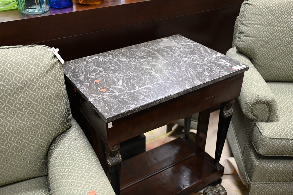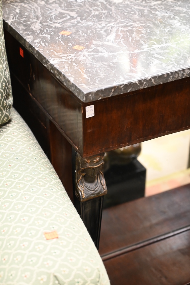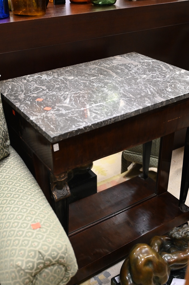 Lot 579: French Empire Mahogany Pier Table, having marble top, ends having drawers and doors with metal figural form over ball feet, including lower mirror, 19th century, Egyptian faces, height 33 inches, top 19 1/2″ x 27 1/2″.