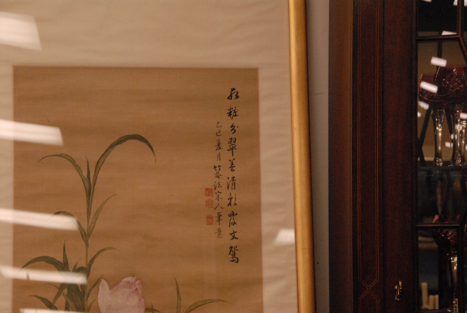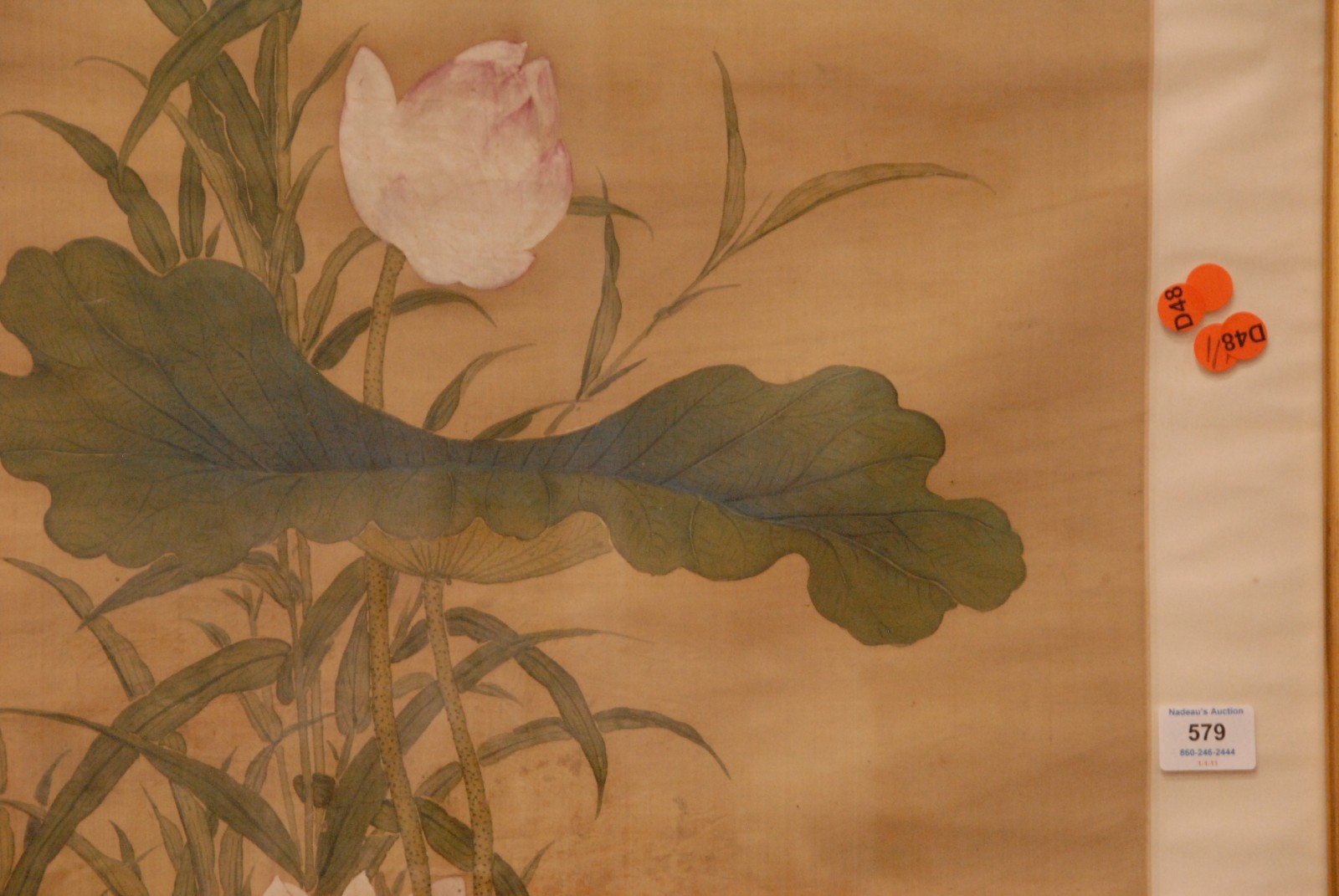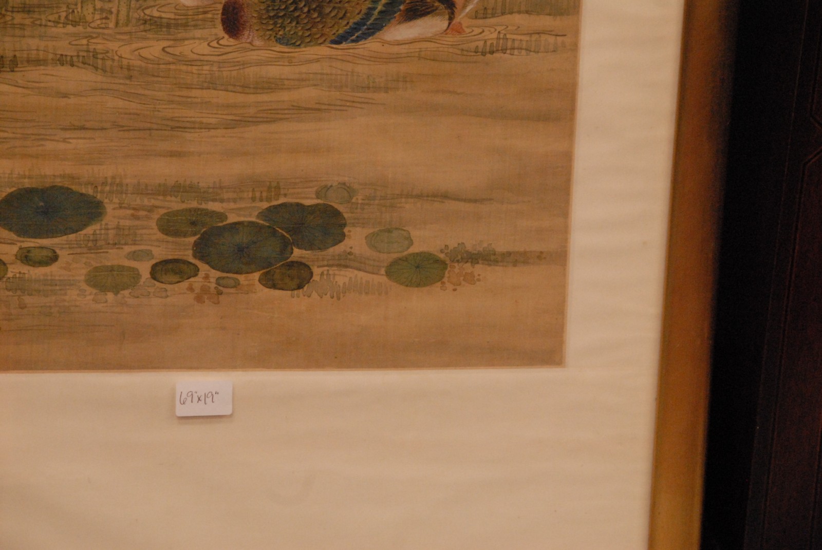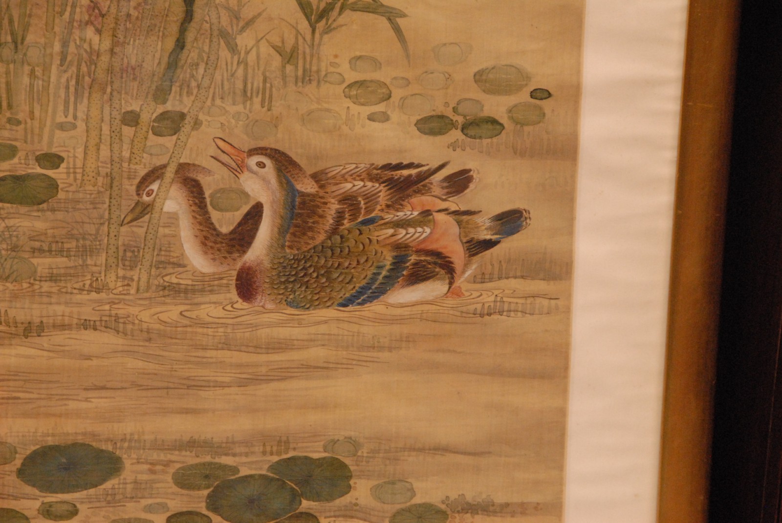 Large framed Chinese painting depicting mandarin ducks among lotus flowers artist’s inscription and collectors seal marks 19th century possibly older.