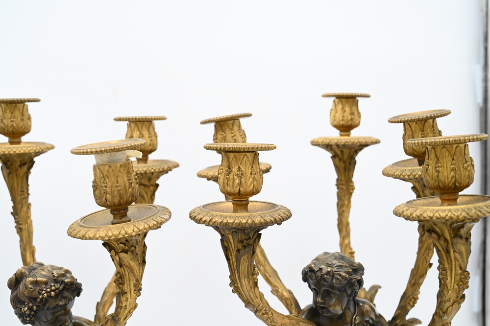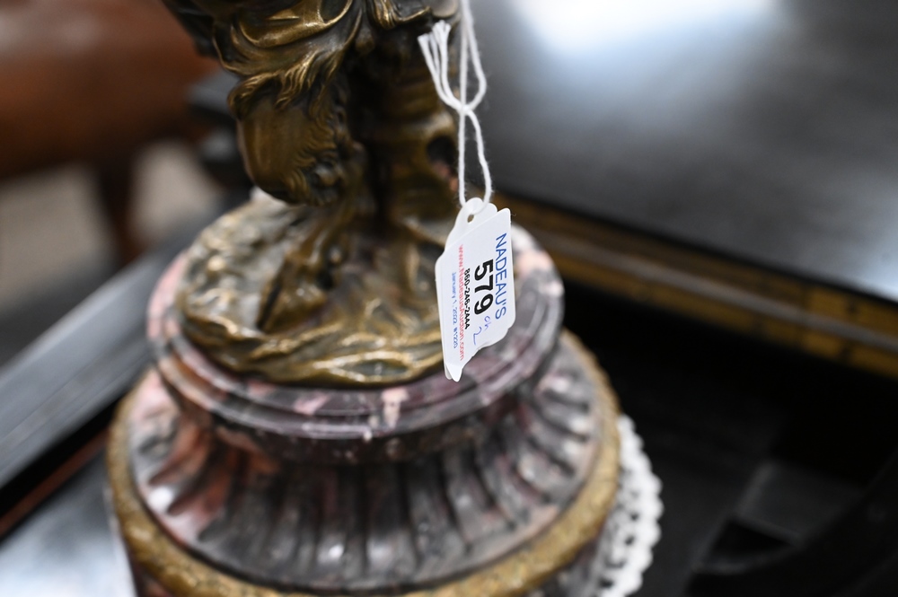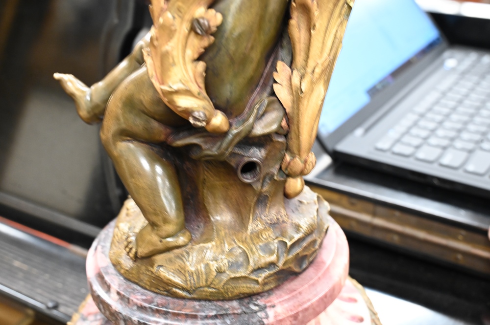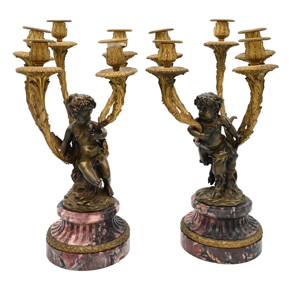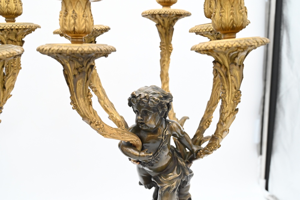 Lot 579: Pair of French Patinated Bronze Figural Candelabras, modeled as a putti holding four gilt bronze swag-form arms, on round rouge marb…