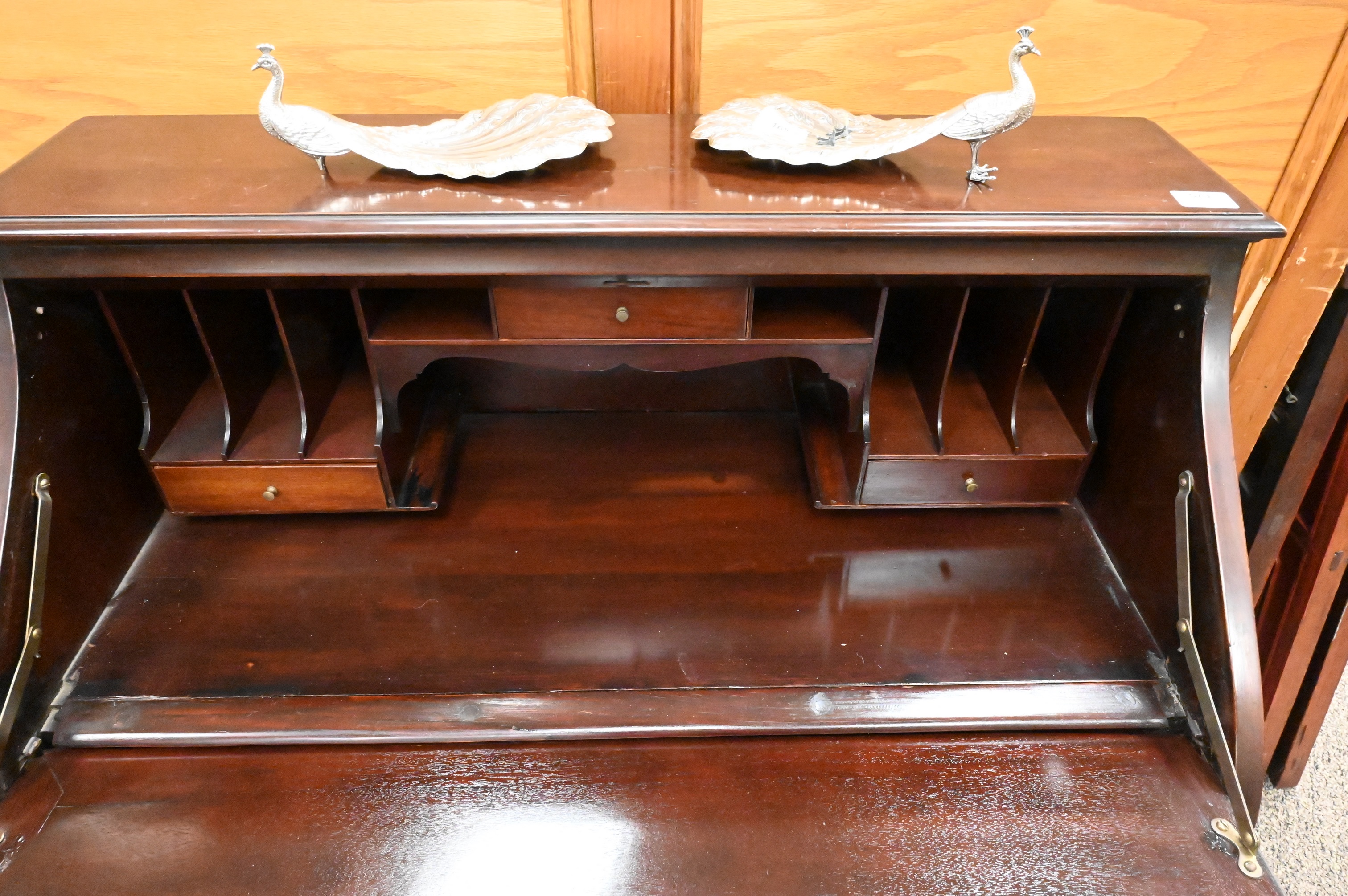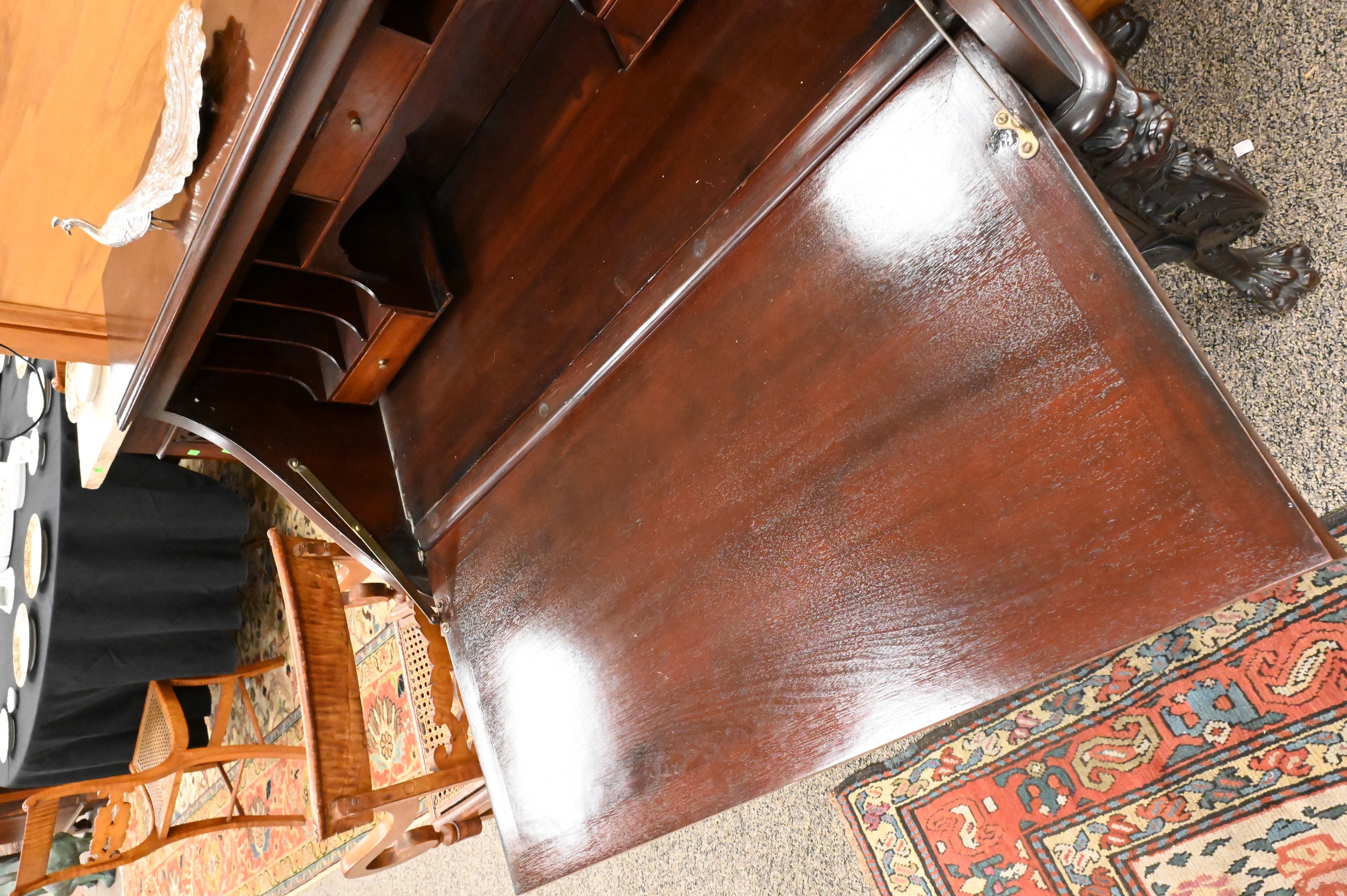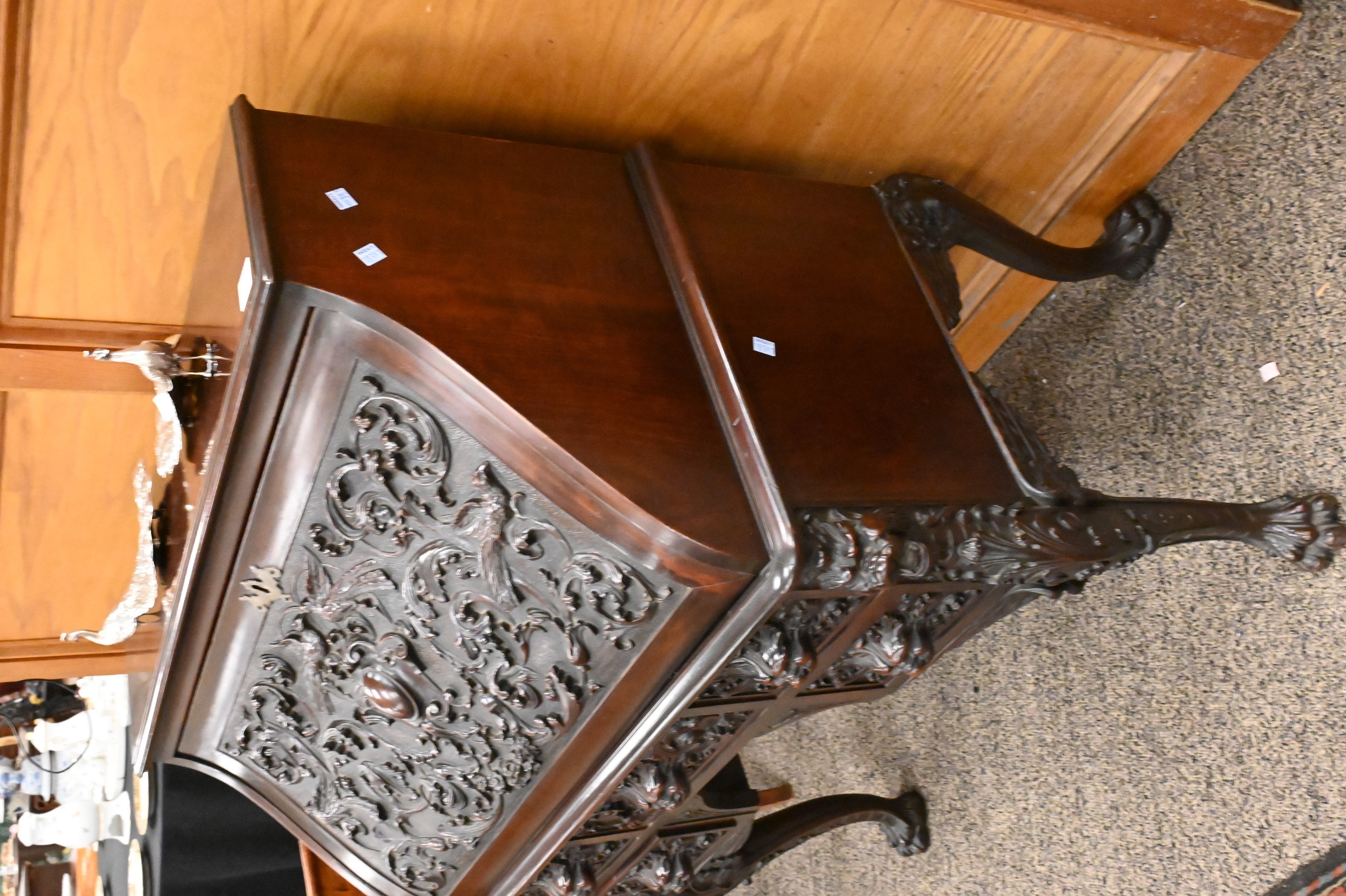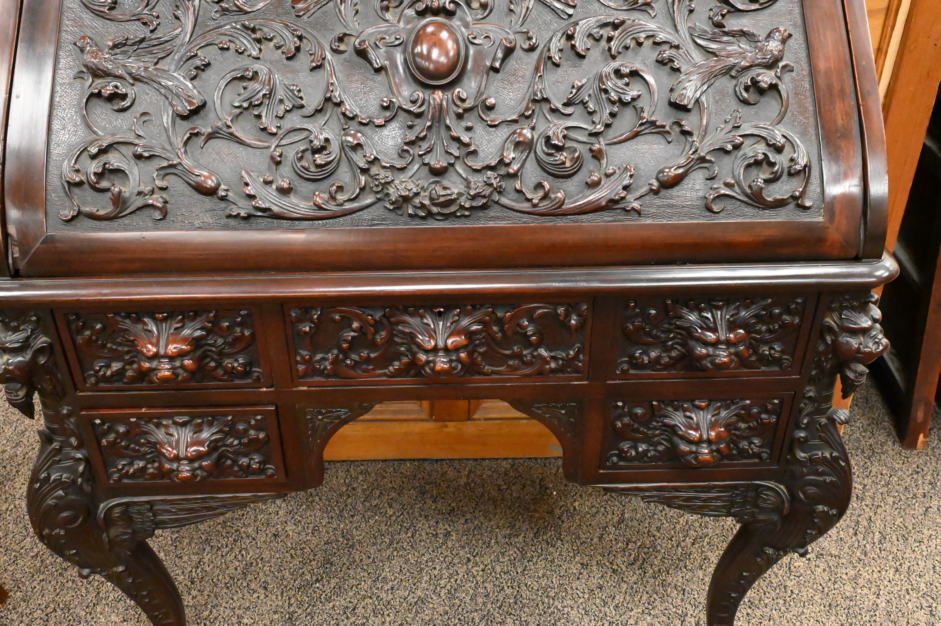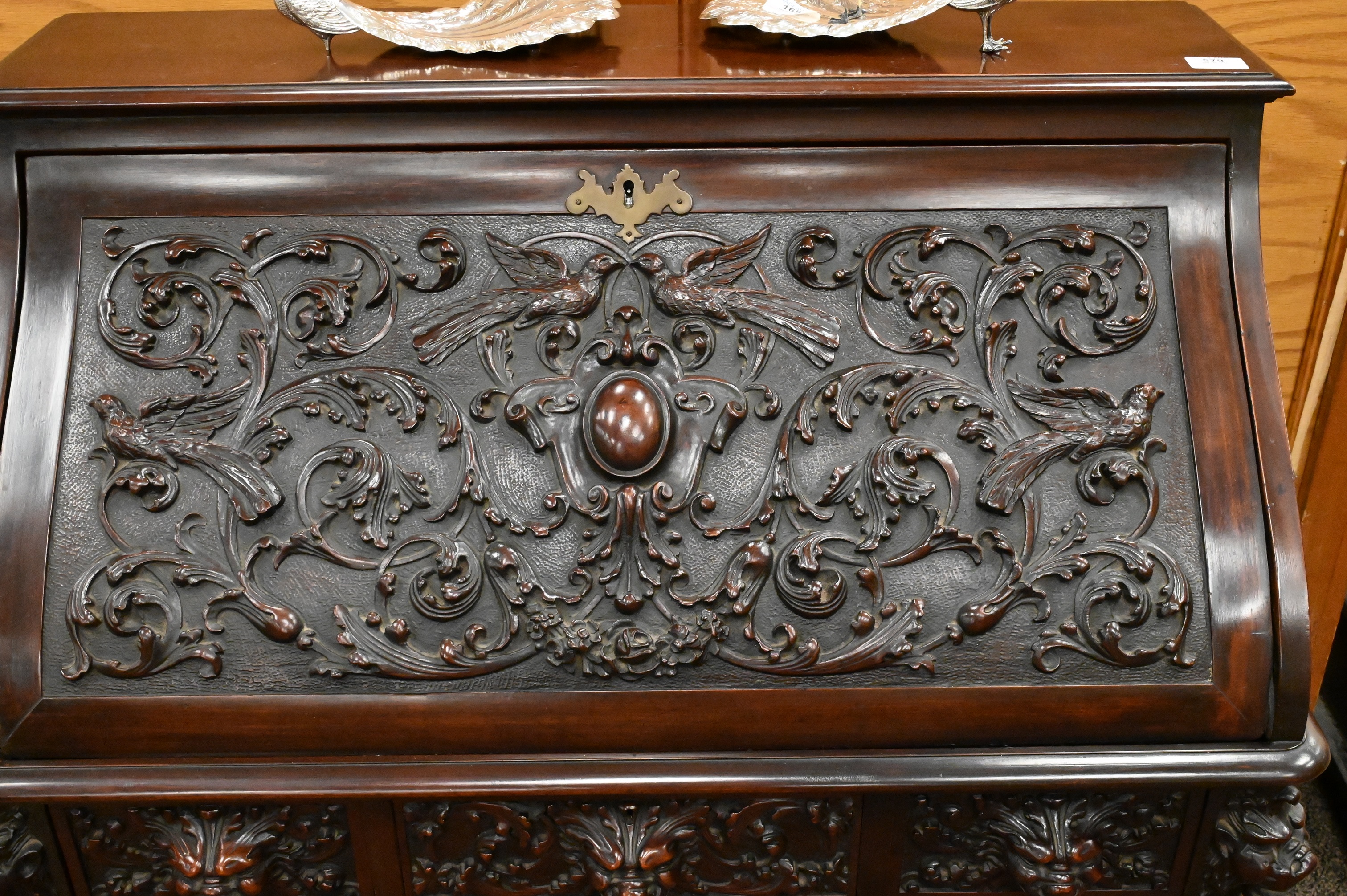 having bird and floral carved drop front over lion mask pulls on drawers flanked by dragon heads and carved paw feet, small chip to side of lid, repair to interior surface