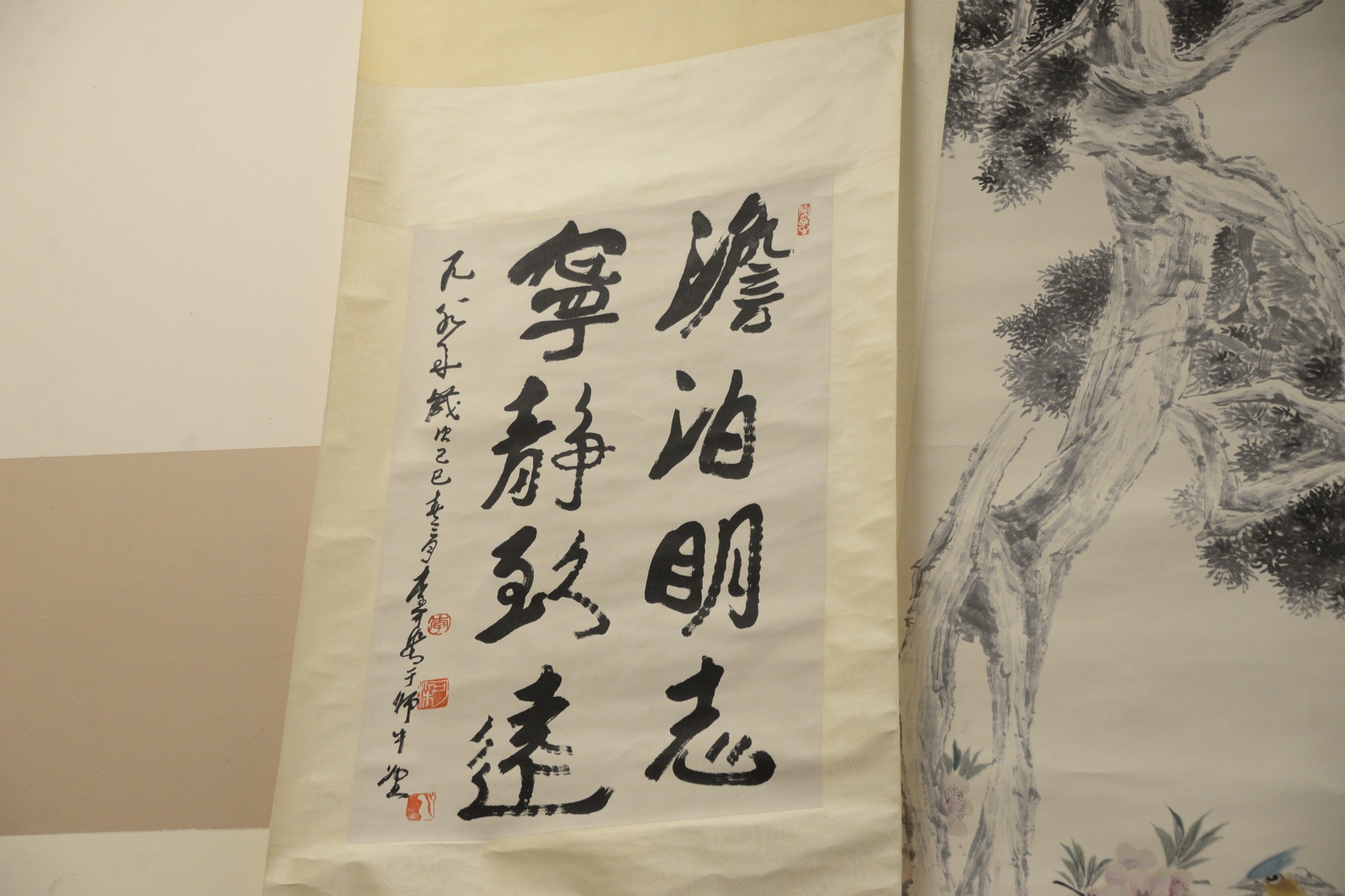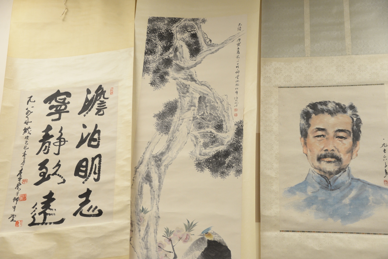 Three Oriental scrolls watercolor bust of man 27 x 17, watercolor bird under tree 70 x 19, and watercolor of characters 27 x 18.