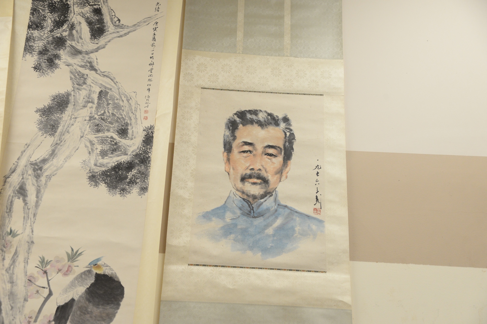Lot 579: Three Oriental scrolls watercolor bust of man 27 x 17, watercolor bird under tree 70 x 19, and watercolor of characters 27 x 18.