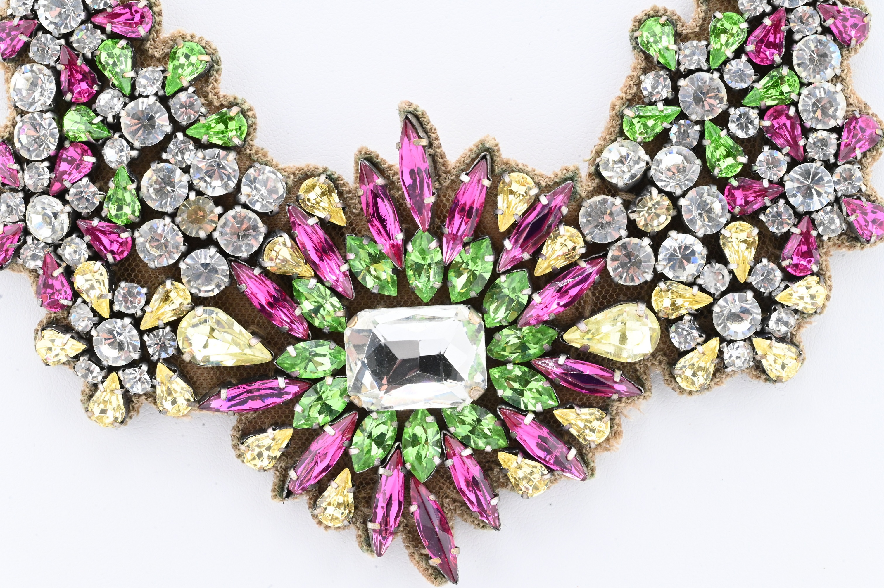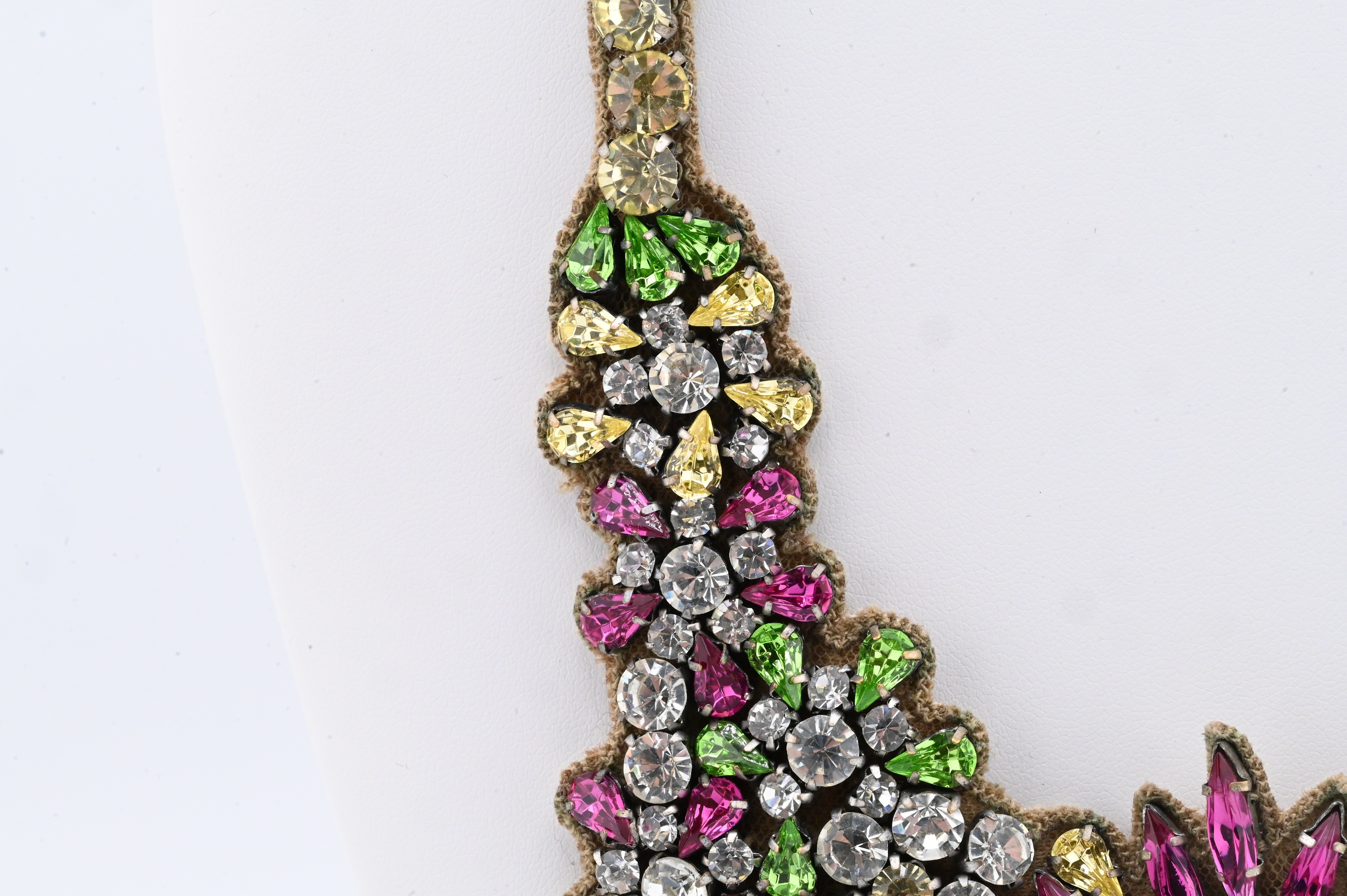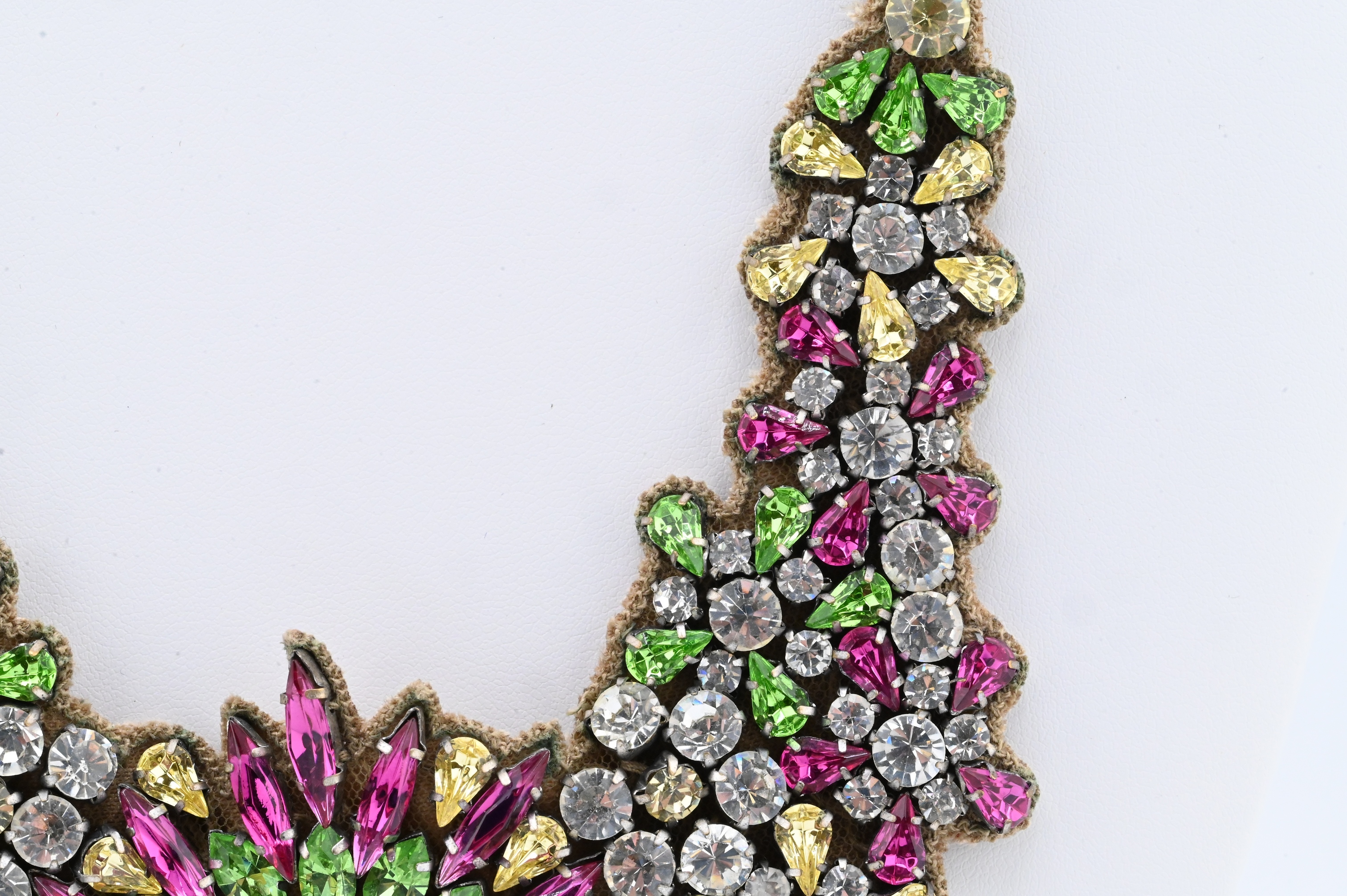 elaborate Valentino-style bib necklace composed of vibrant marquise-, pear-, and round-cut glass crystals in shades of fuchsia, chartreuse, lime green, and clear, arranged in dense floral clusters culminating in a large starburst center medallion centering a rectangular faceted clear stone, silver-tone metal mount with chain extension and lobster-claw clasp, the clasp adorned with the Valentino “V” motif