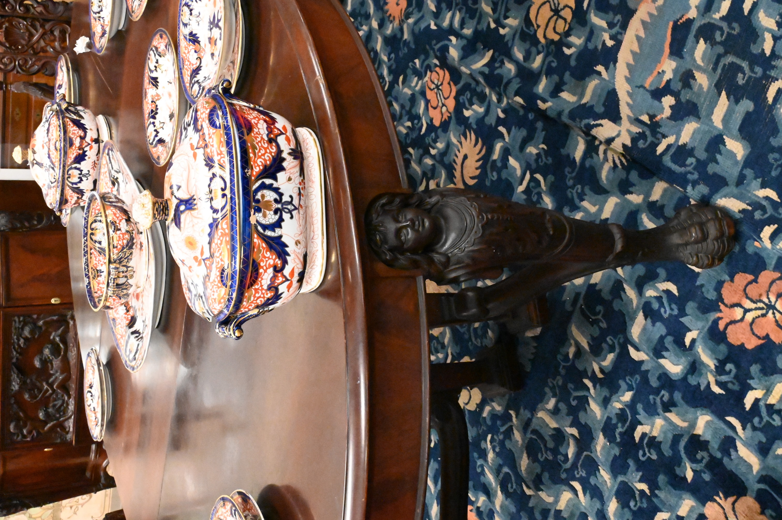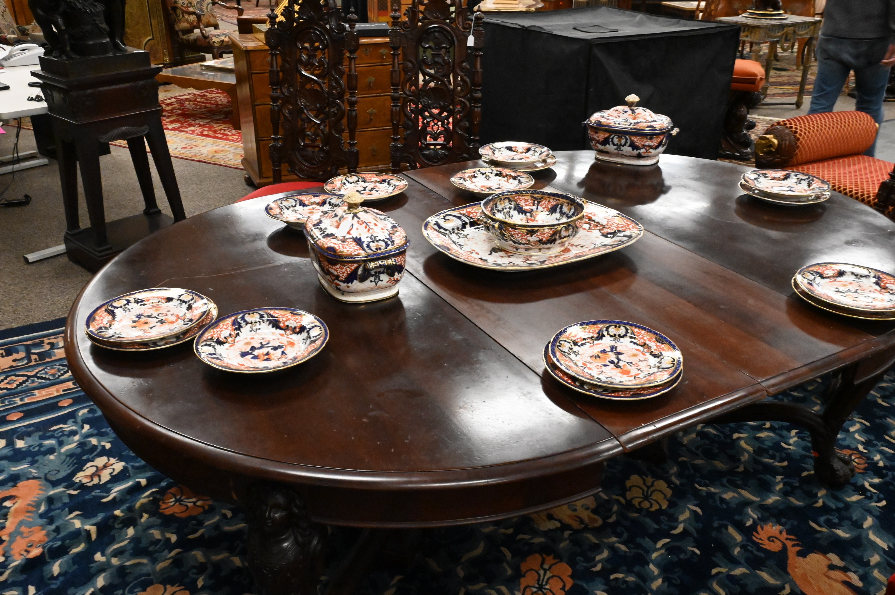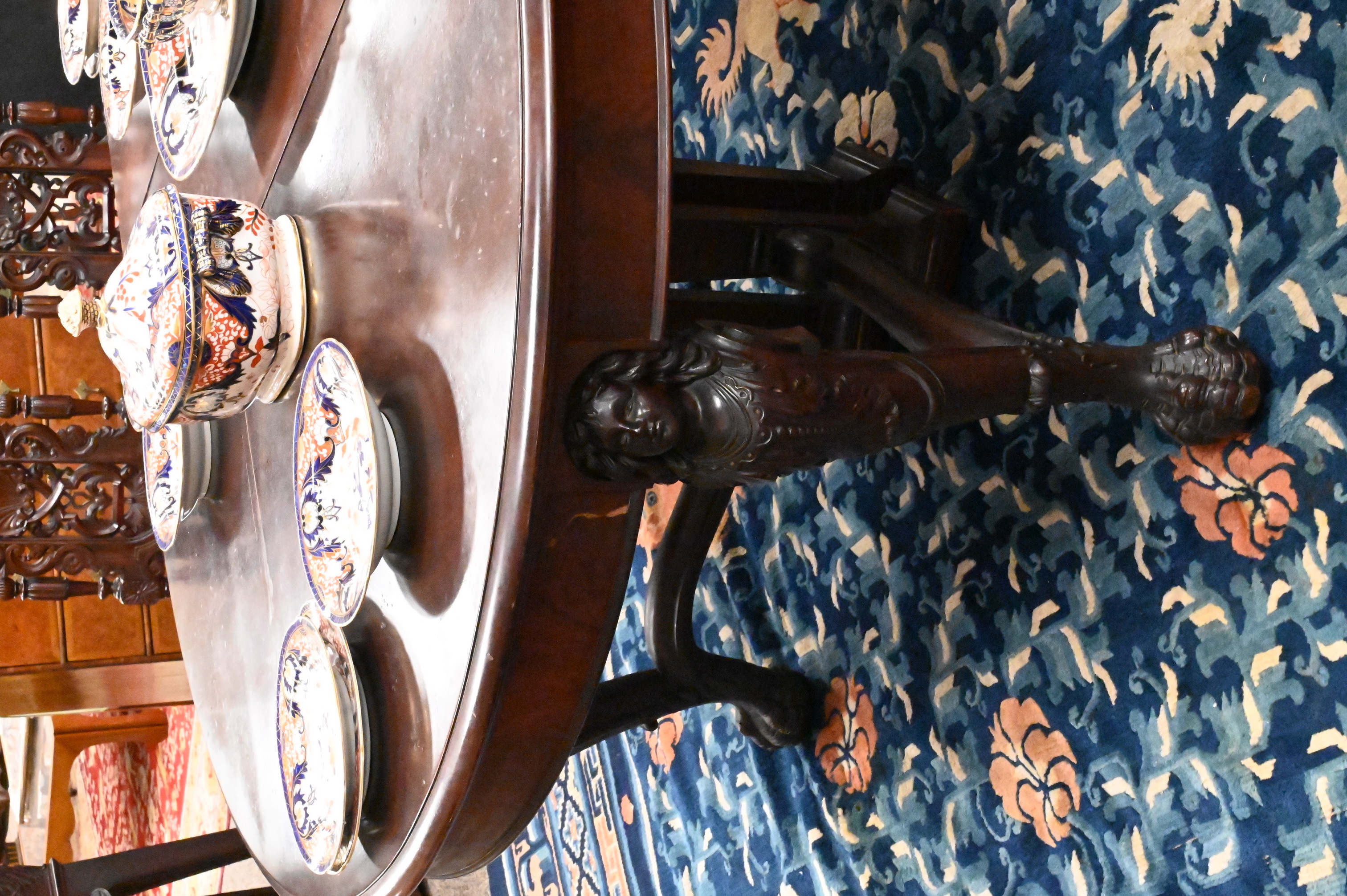 having eight extension leaves 13 1/2 inches each, set on caryatid carved legs ending in claw feet