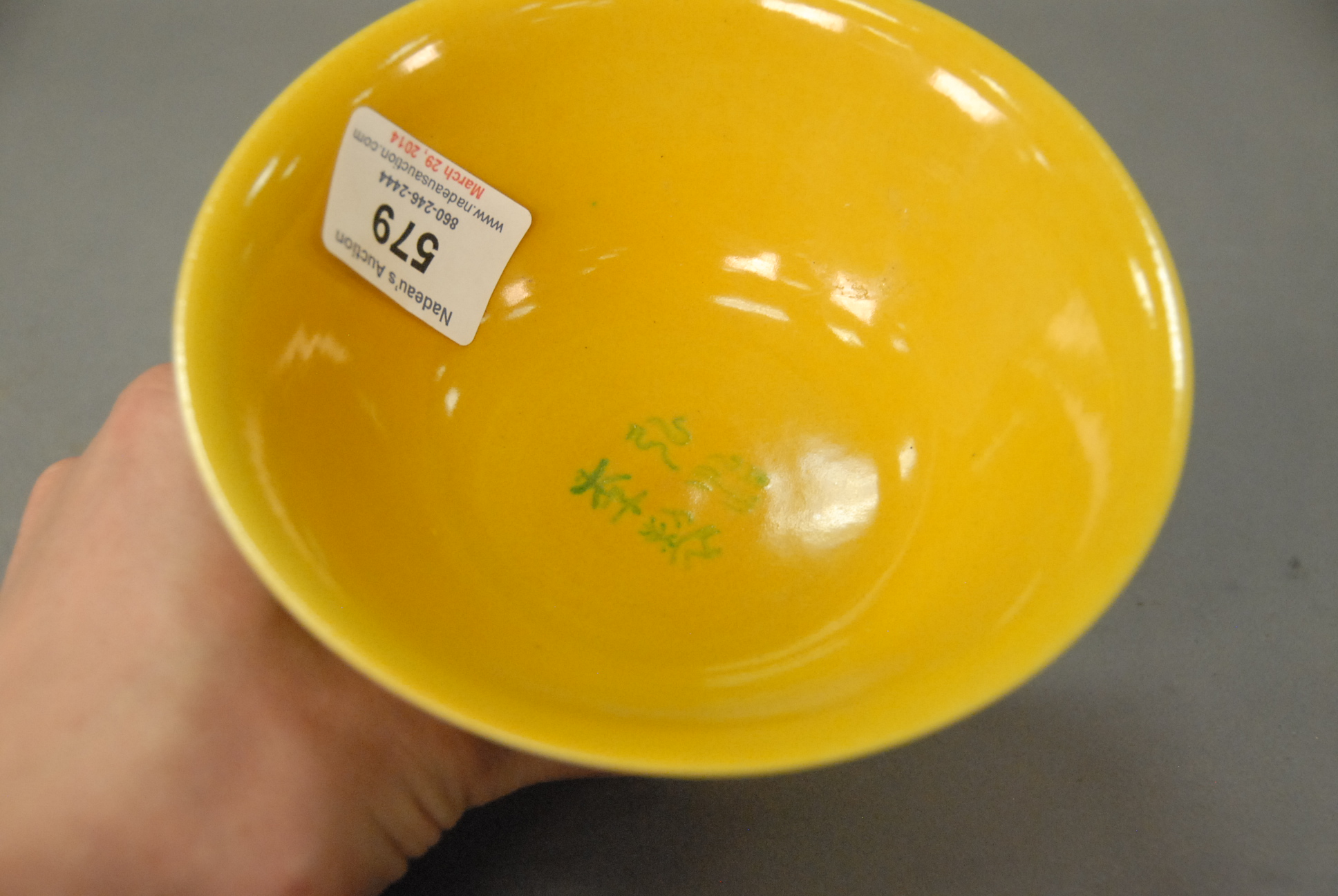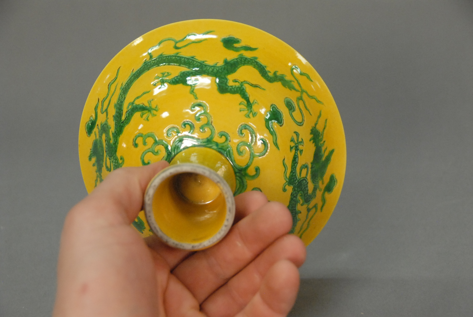 Yellow glazed stem cup with 2 five claw dragons and flaming clouds. ht. 4in. dia. 6in.