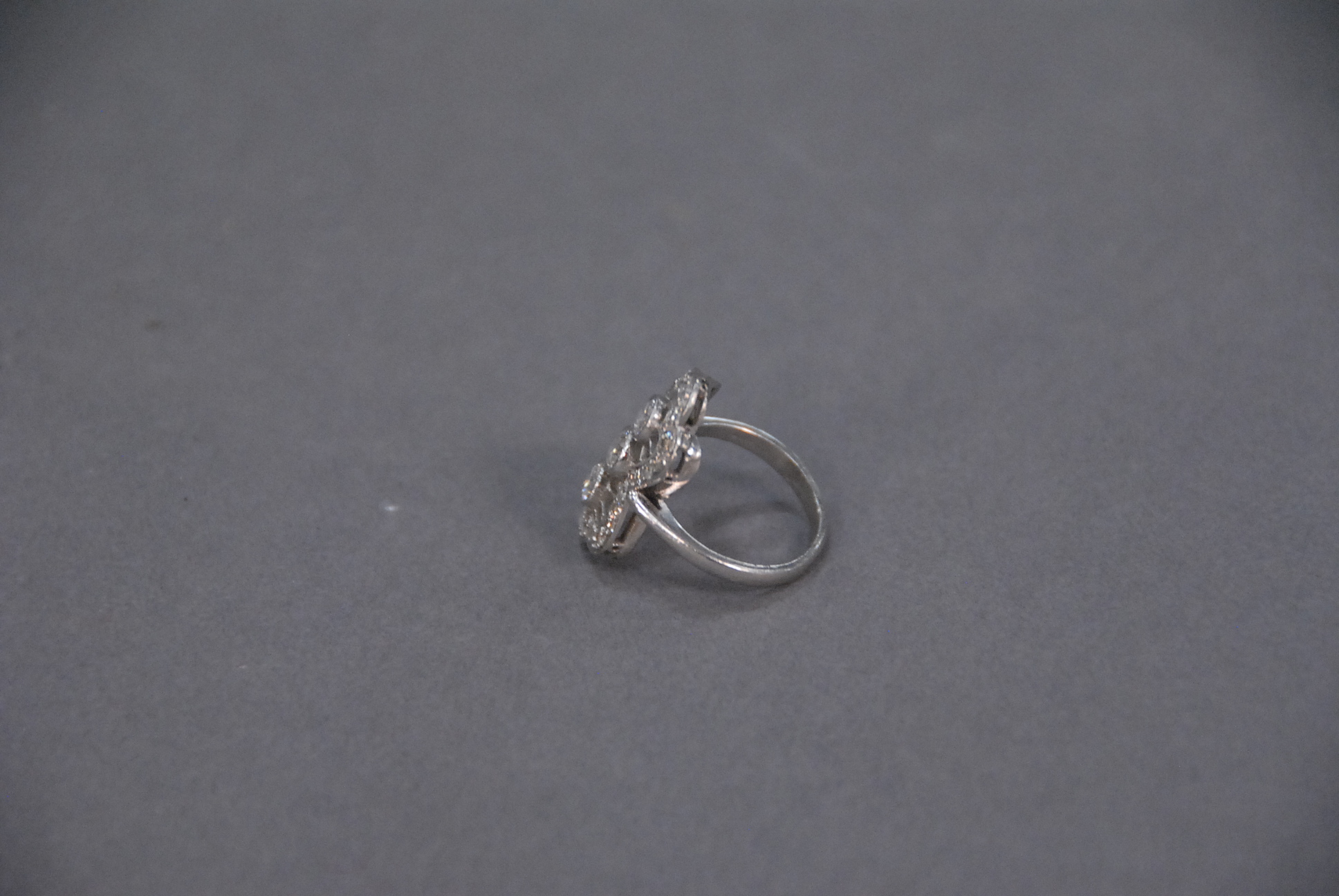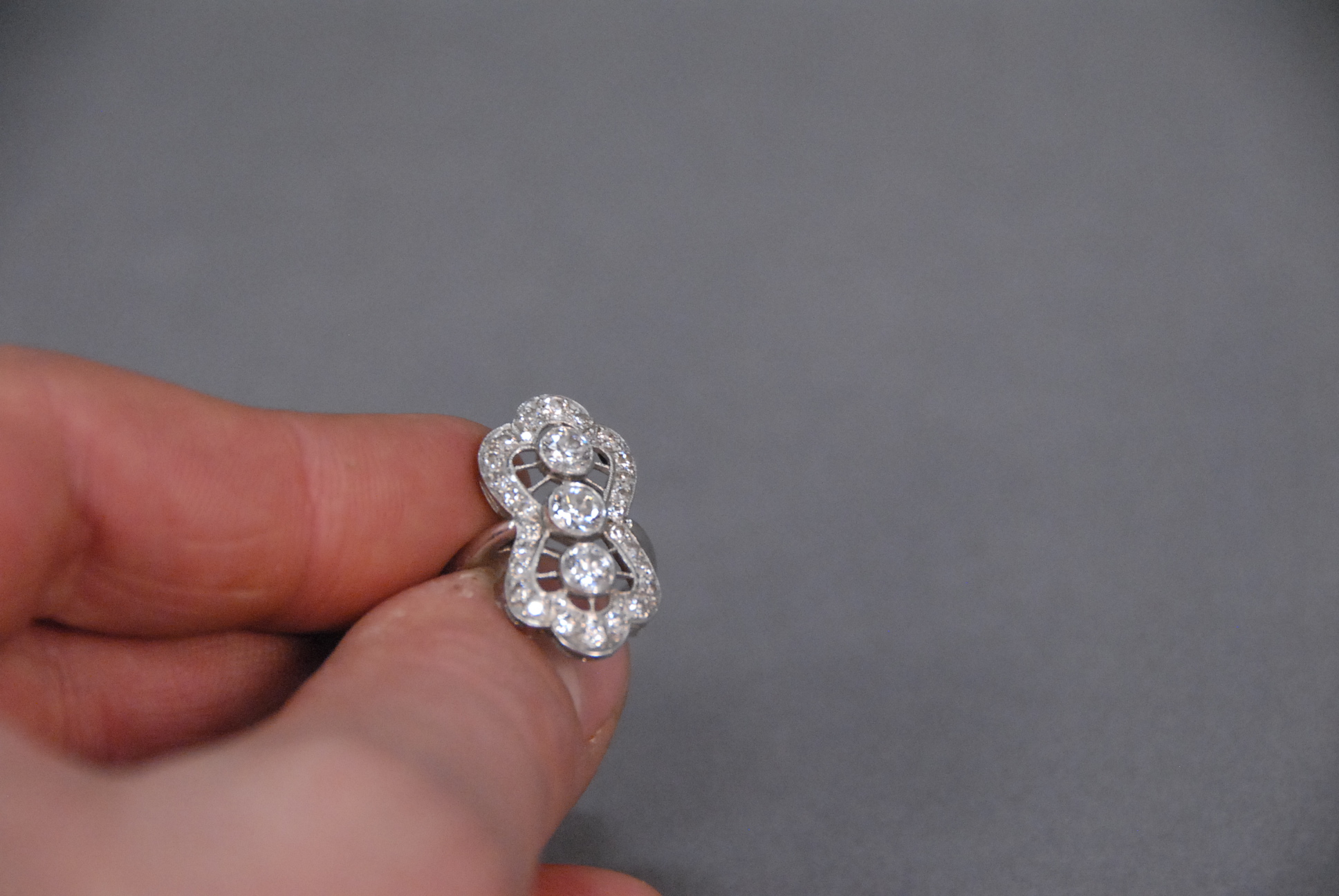 Lot 57A: Diamond and platinum cocktail ring having three center diamonds between .35 and .40 cts. surrounded by 28 diamonds. 6.8 grams