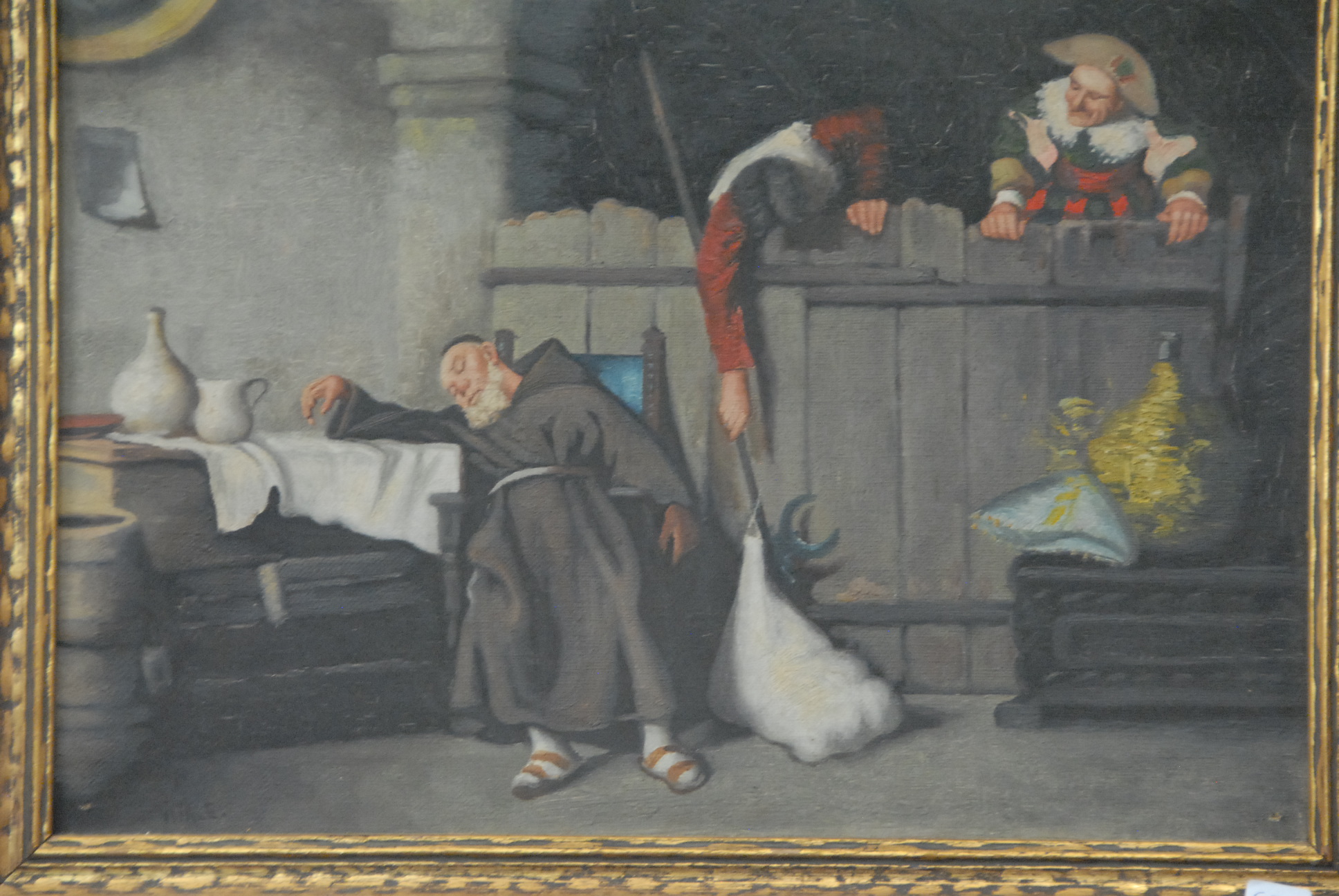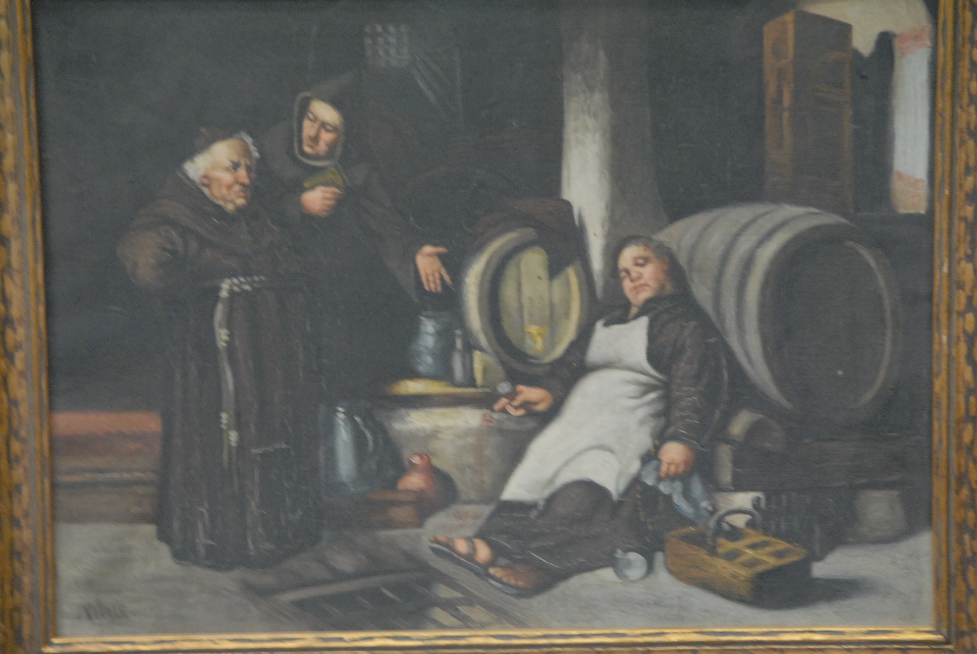 Pair of oil on canvas paintings signed lower left Vitale Drunken Wine Keeper.