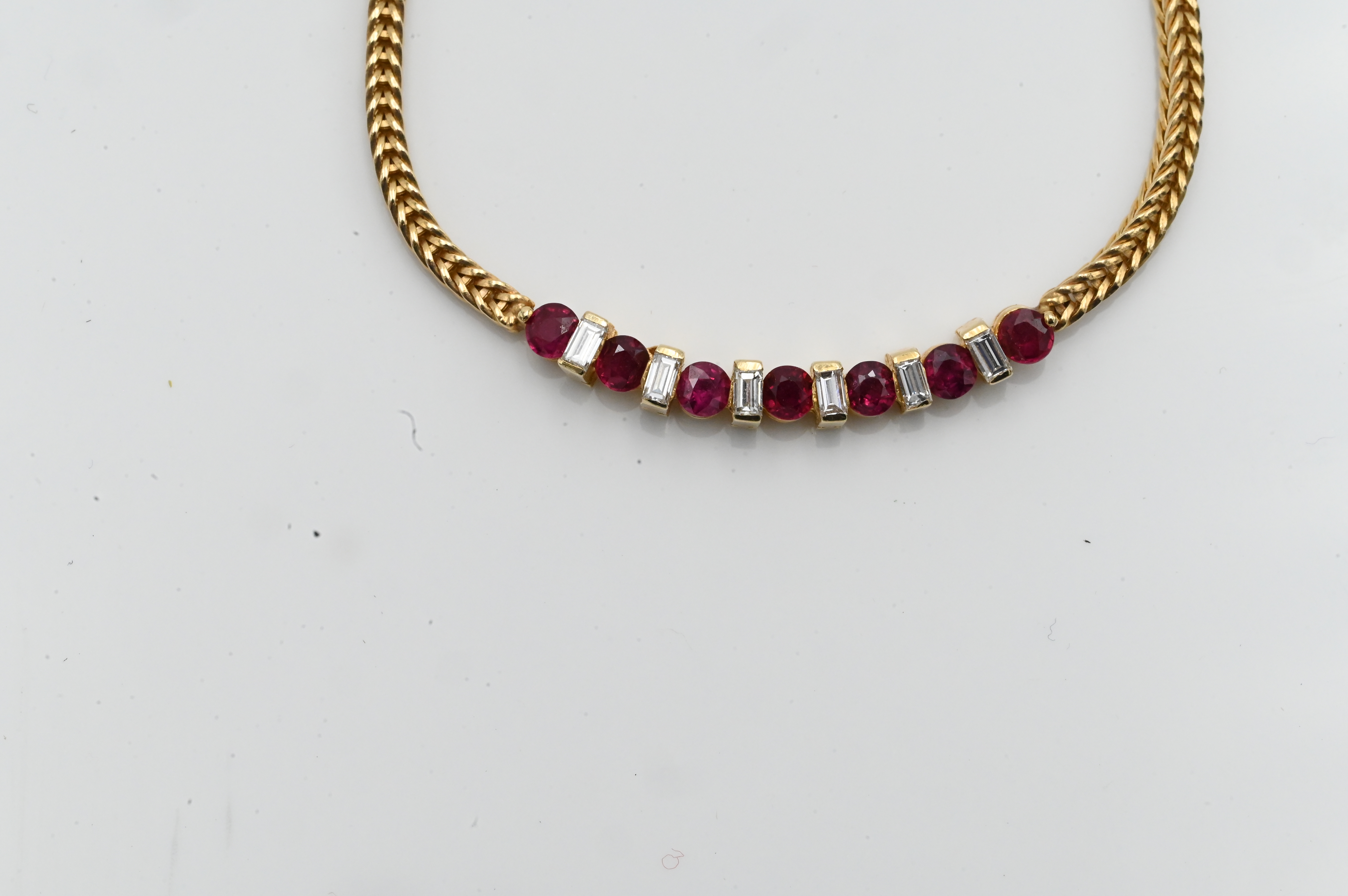 14 Karat Yellow Gold Necklace Set, having seven round rubies, six baguette diamonds, length 15 1/4 inches, 12 grams.