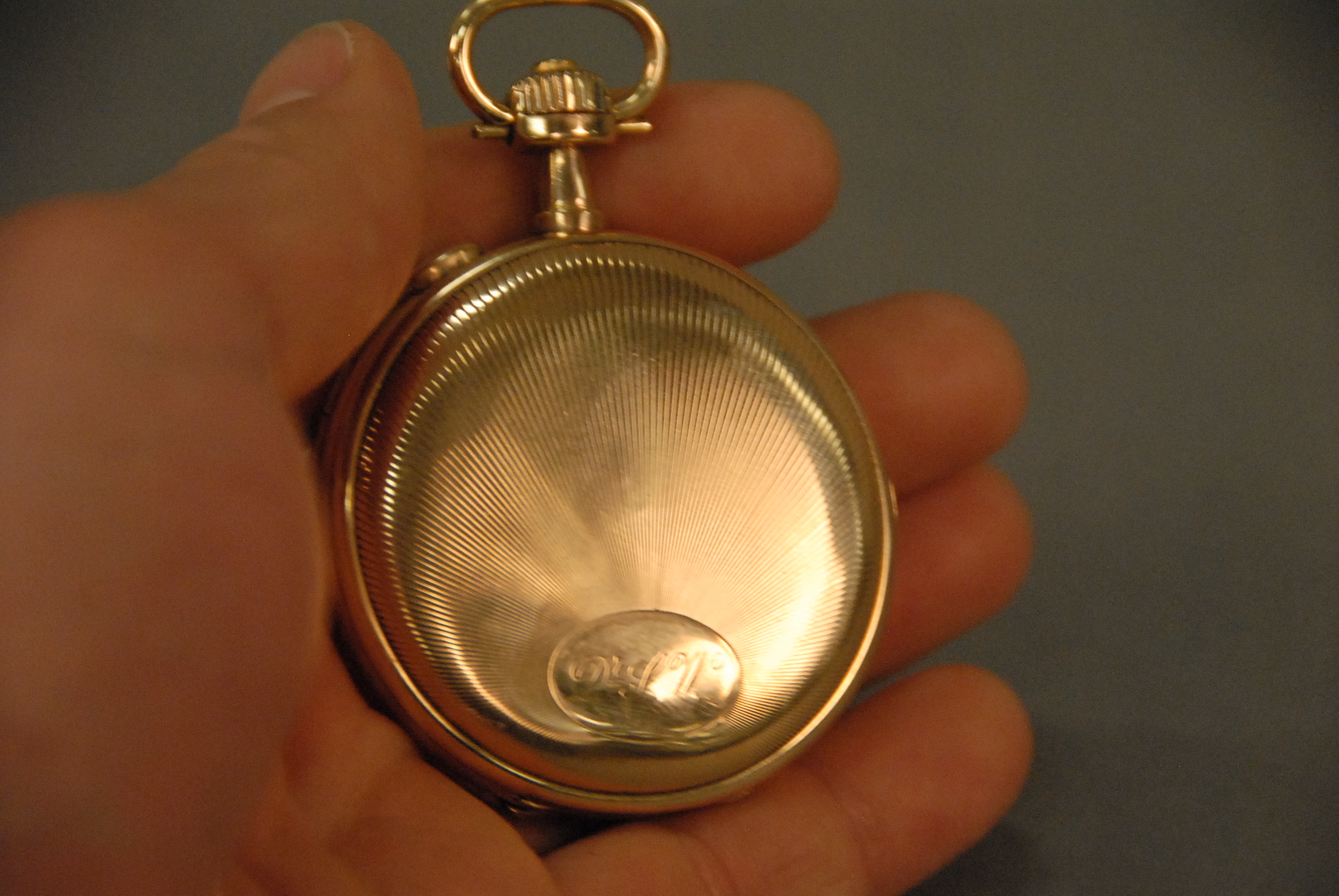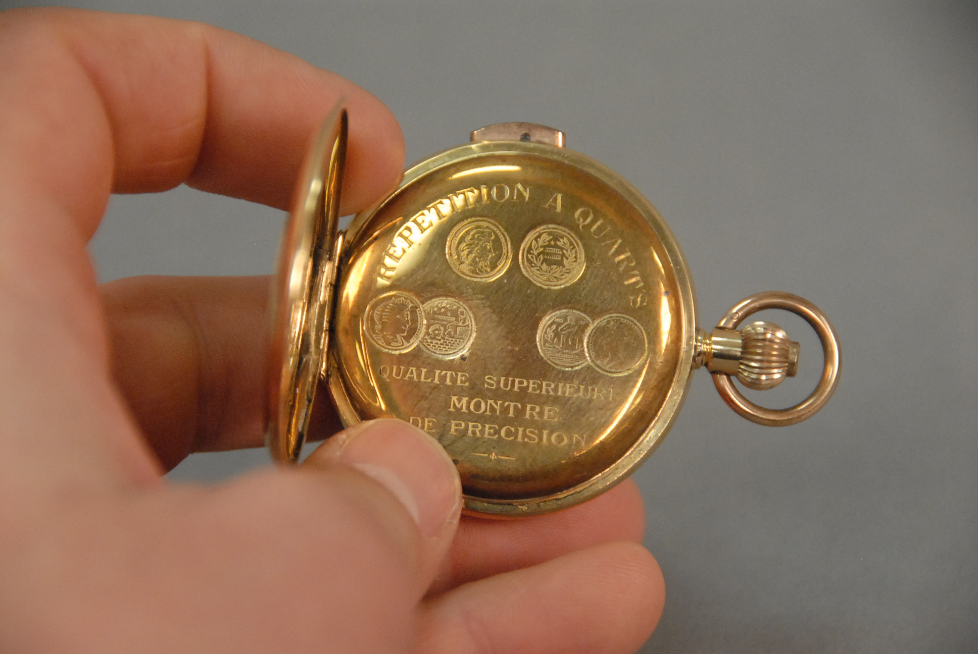 18K gold closed face pocket watch, chronometer with second hand and repeater. 117.5 grams total weight