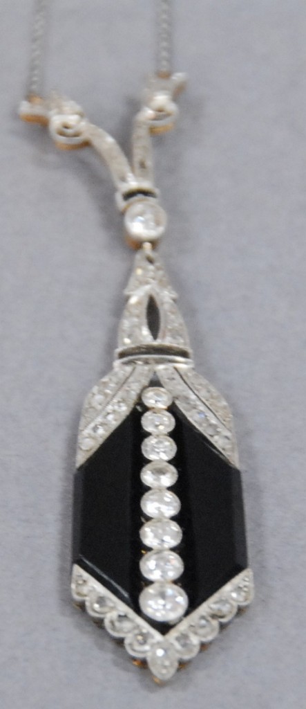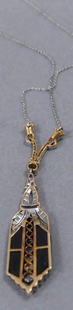 18kt gold diamond and onyx pendant on gold chain, maker mark C.B.