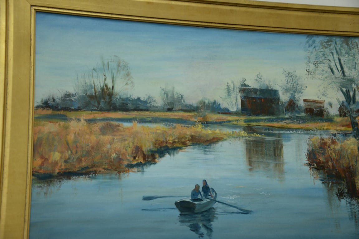 Lot 58: Bill Steeves oil on canvas, rowboat on the pond signed lower right Bill Steeves, 23 1/2 x 35 1/2.