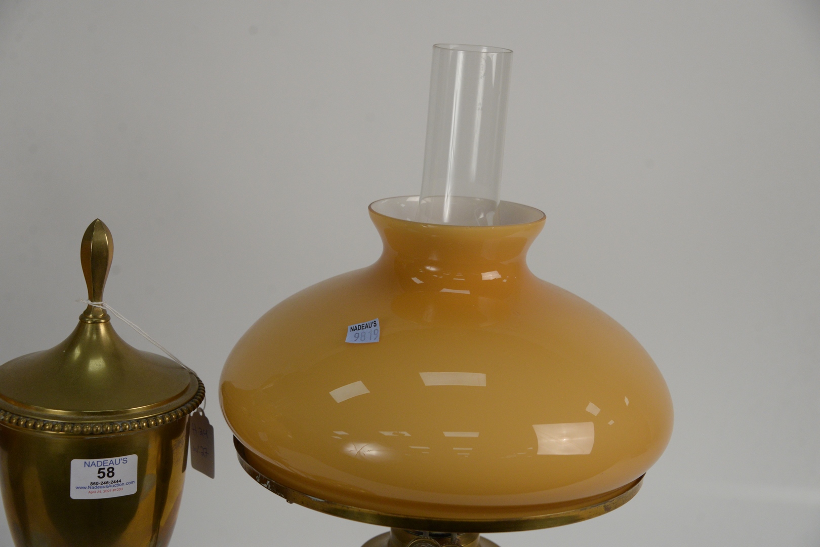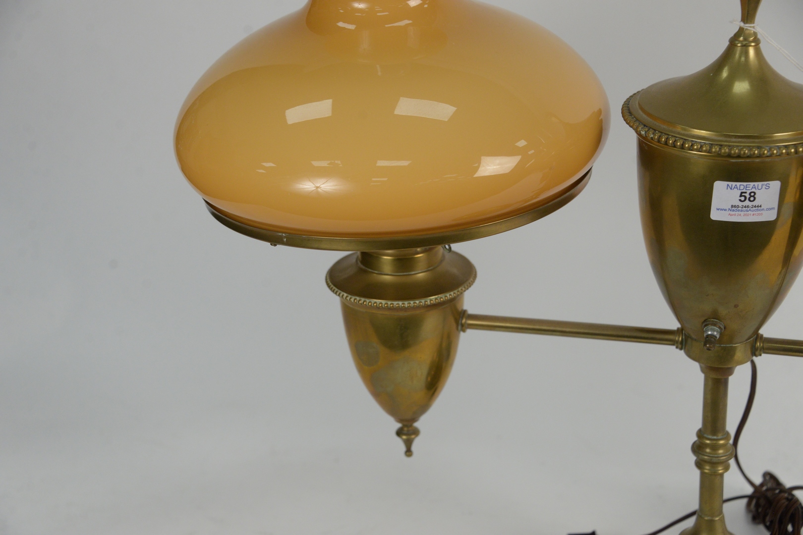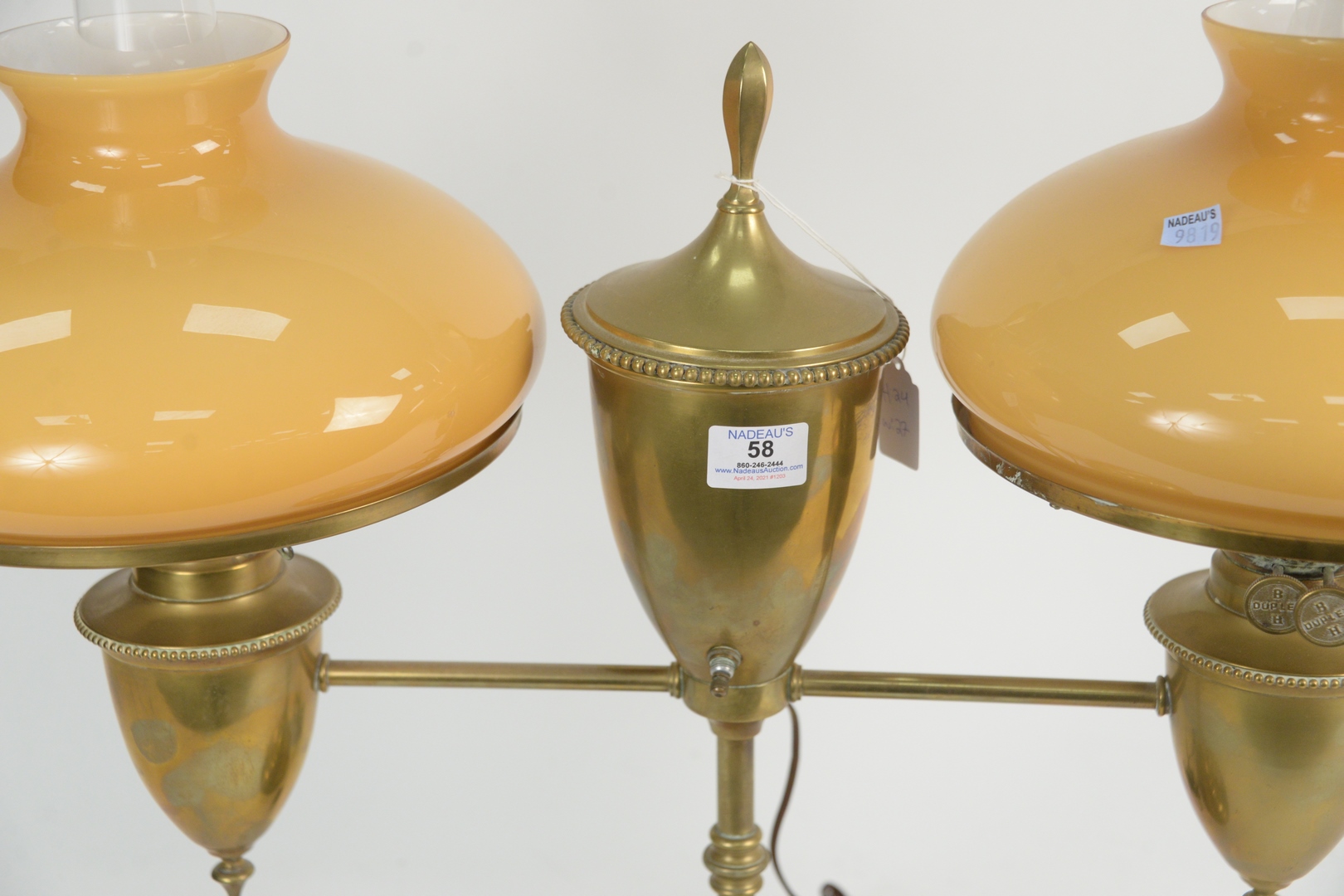 Lot 58: Bradley and Hubbard Double Brass Student Lamp having carmel glass shades, height 24 inches, width 27 inches.