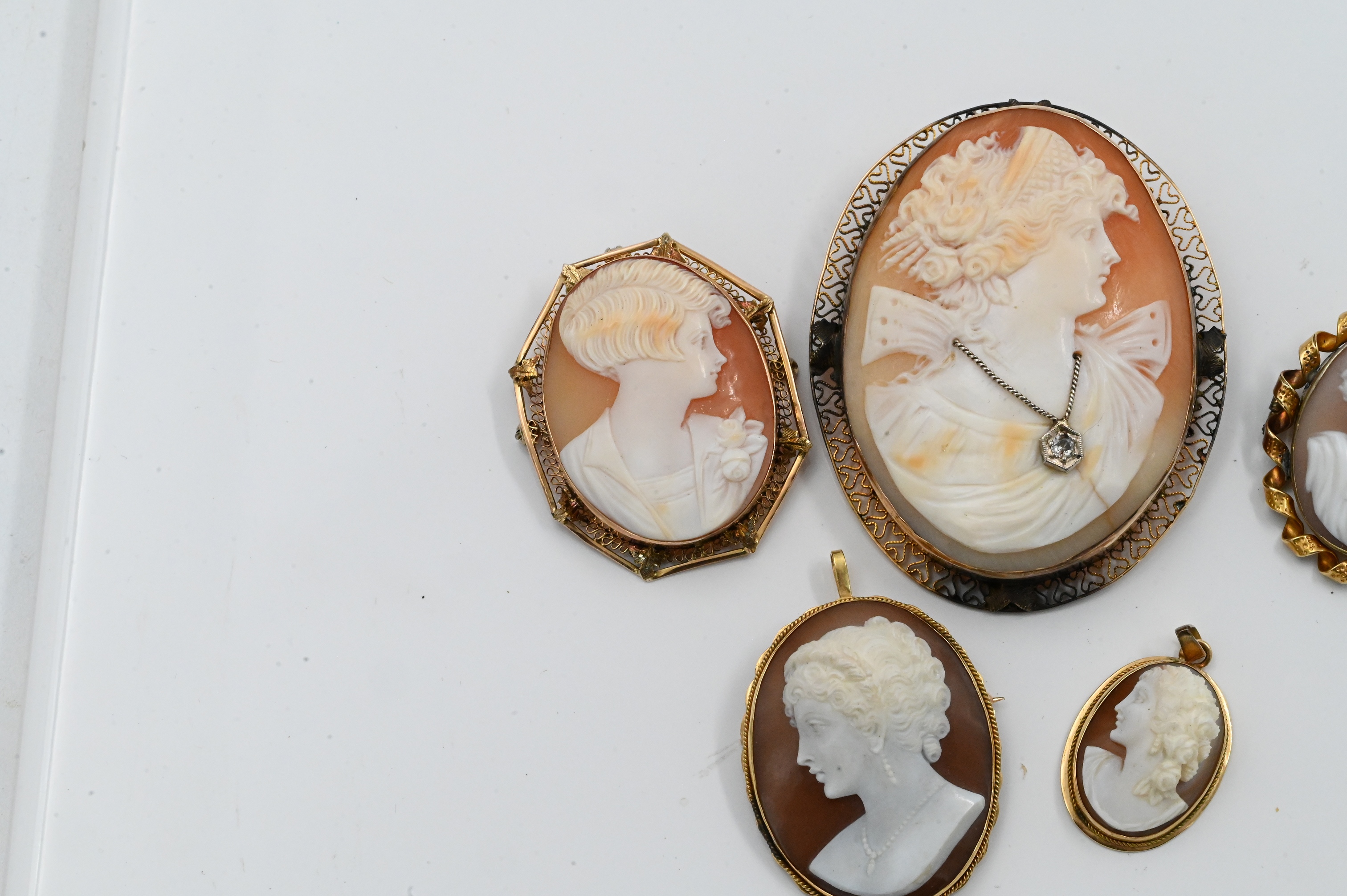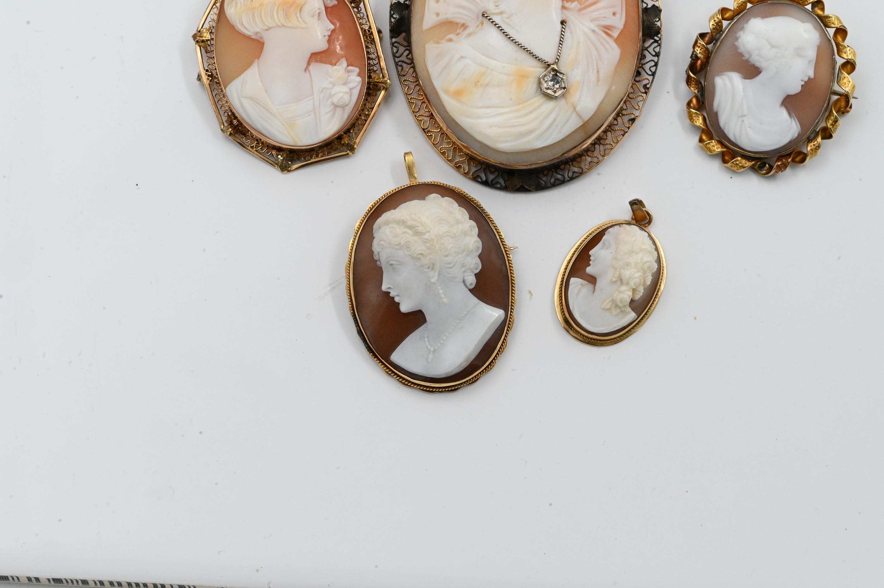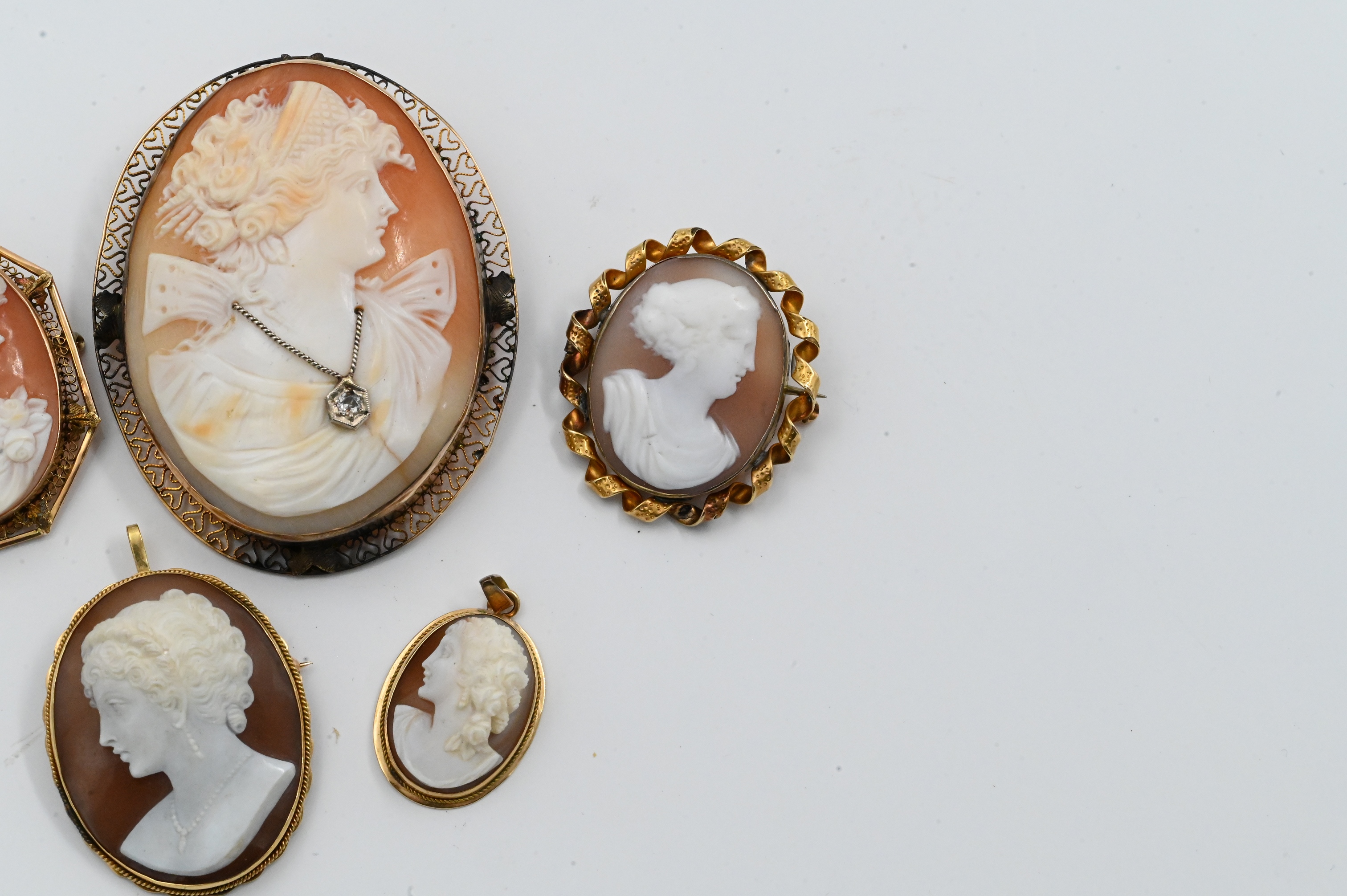 two marked 18K, two marked 14K with one having diamond, one marked 10 karat with ribbon wreath