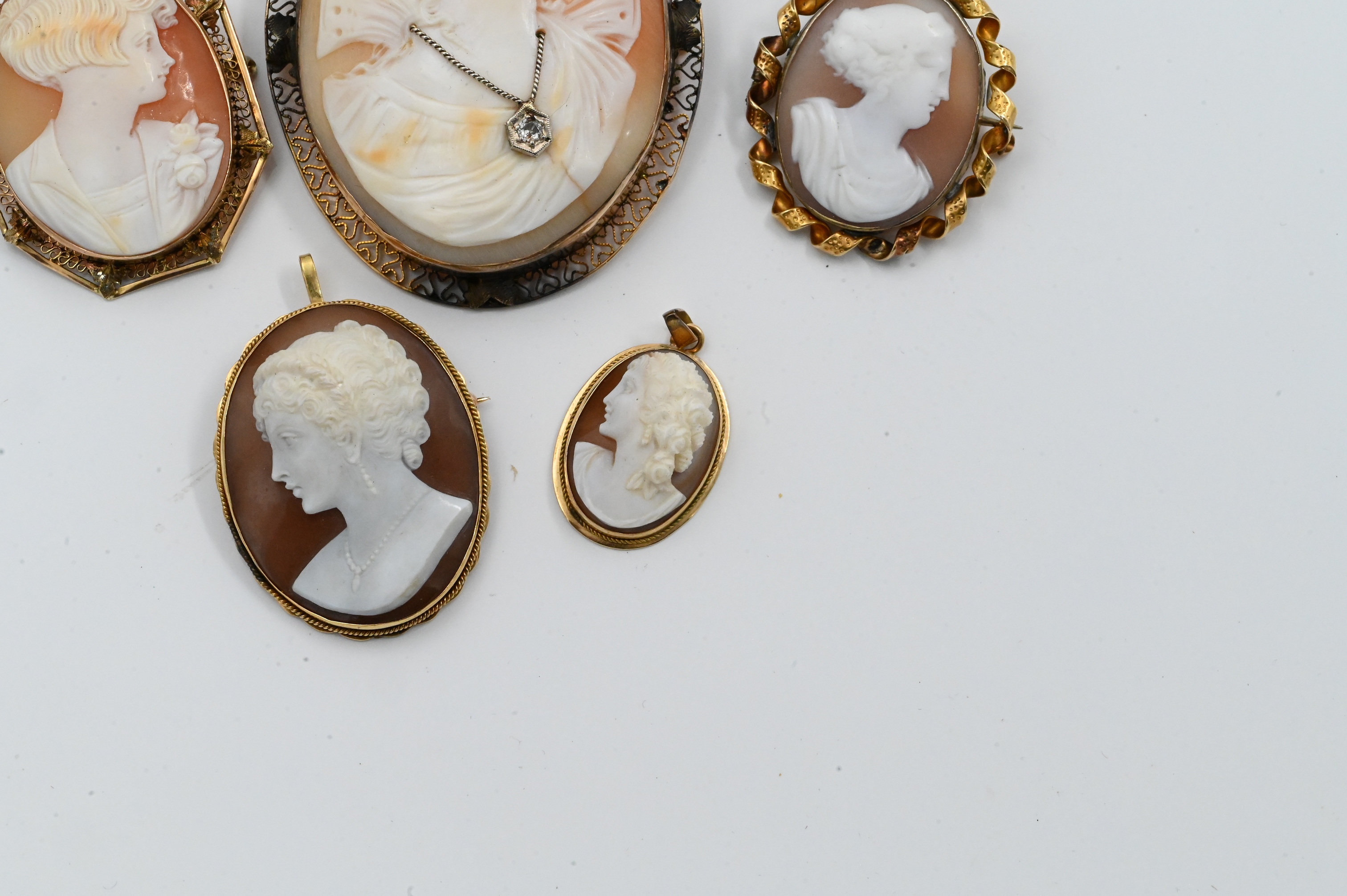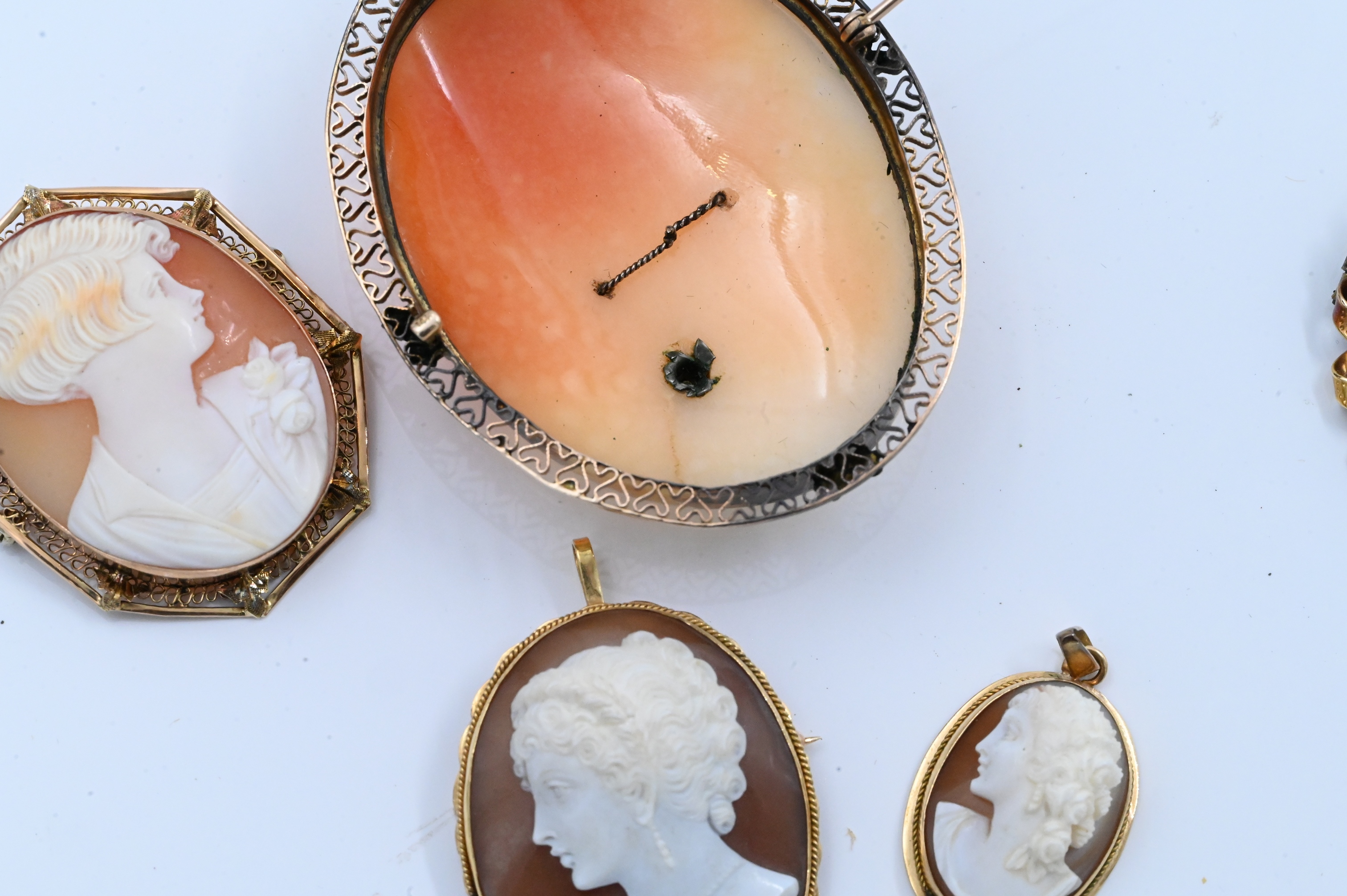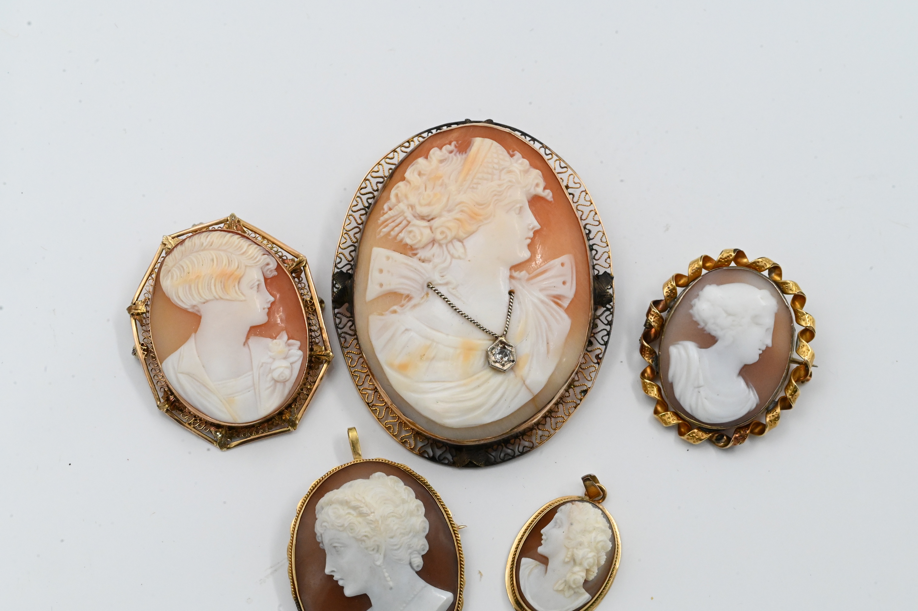 two marked 18K, two marked 14K with one having diamond, one marked 10 karat with ribbon wreath