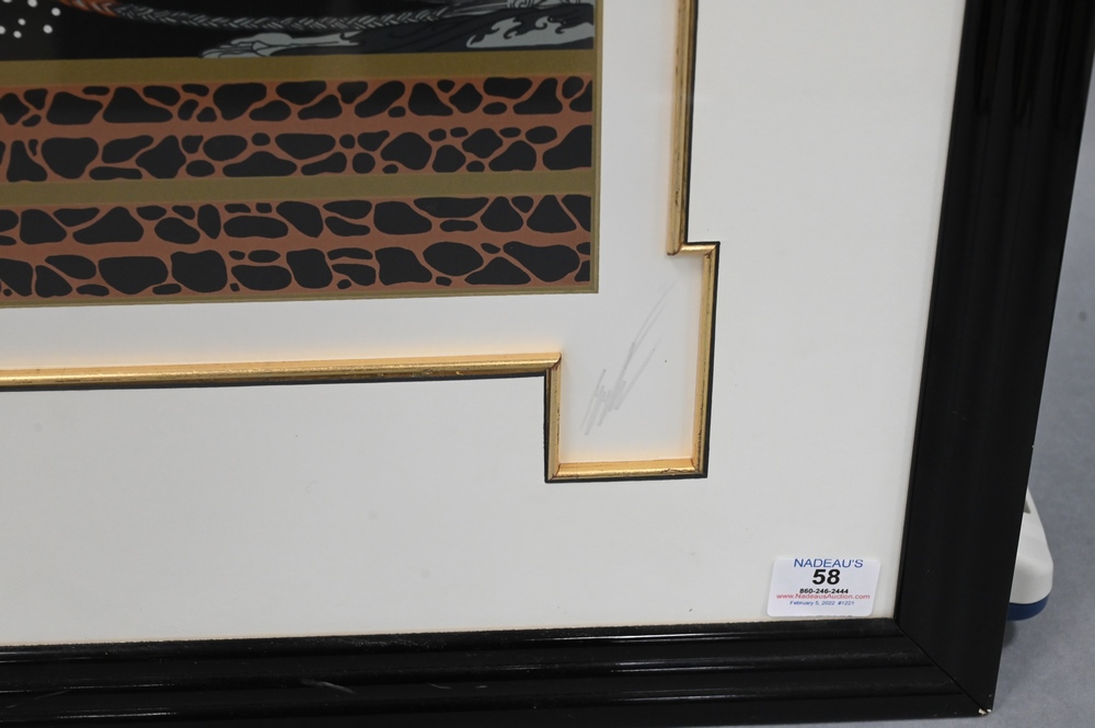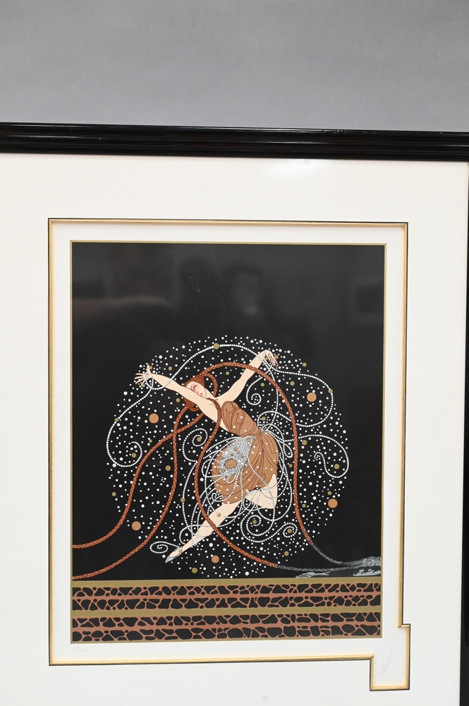 Lot 58: Framed Erte Serigraph, depicting a girl with long hair “Ondee”, numbered 58/300, pencil signed lower right Erte, 21″ x 16.5″.