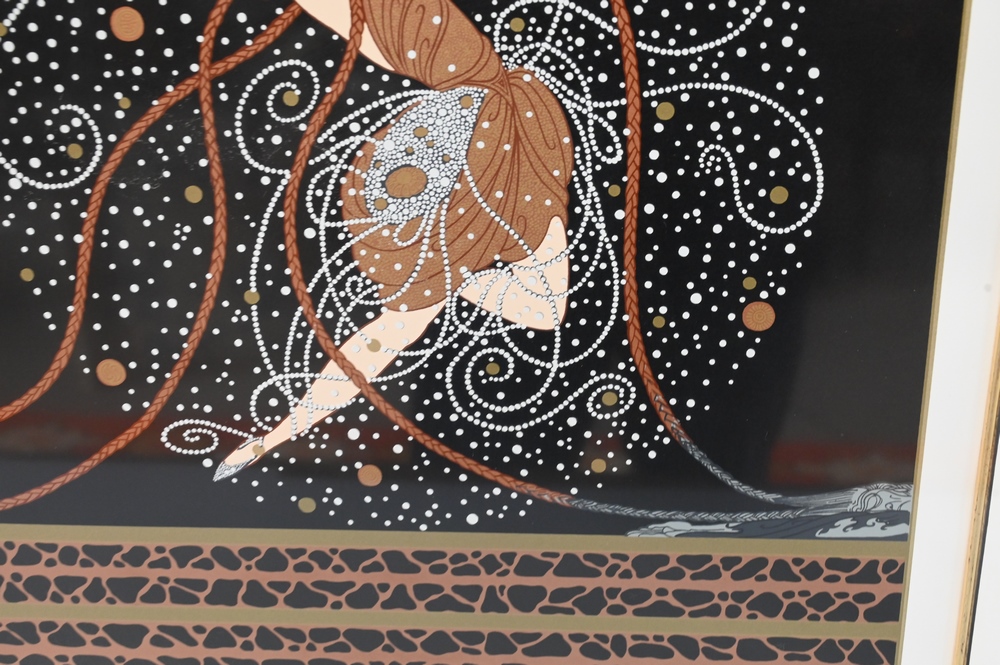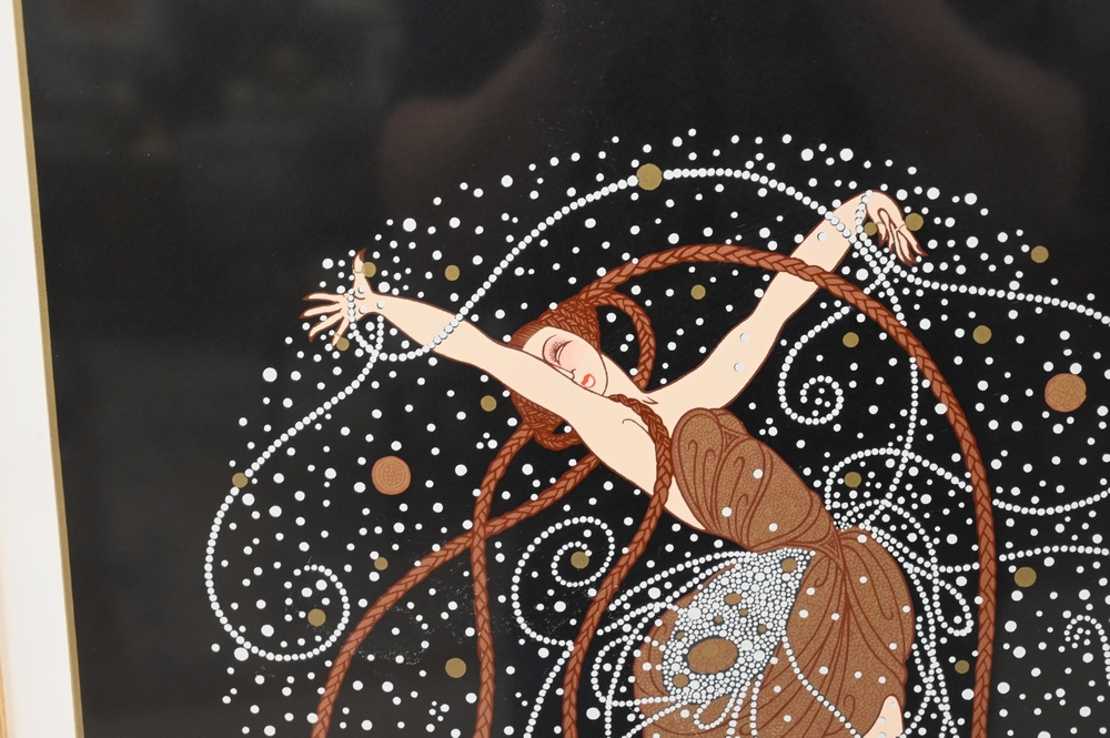 Framed Erte Serigraph, depicting a girl with long hair “Ondee”, numbered 58/300, pencil signed lower right Erte, 21″ x 16.5″.