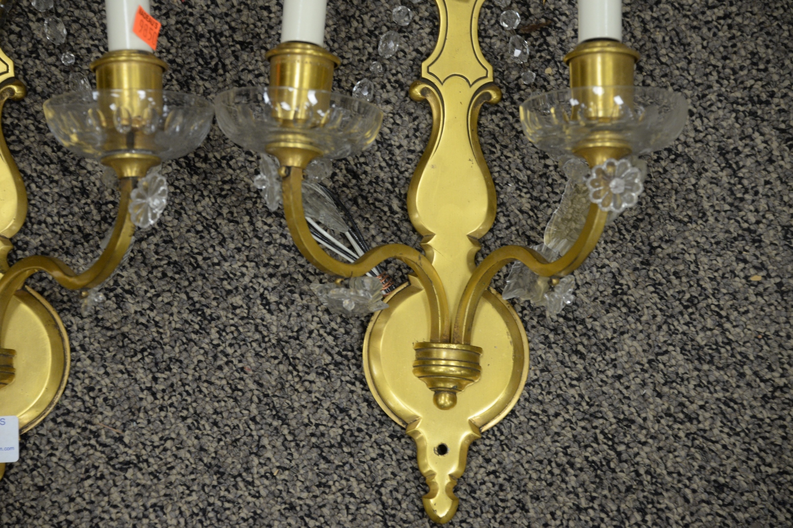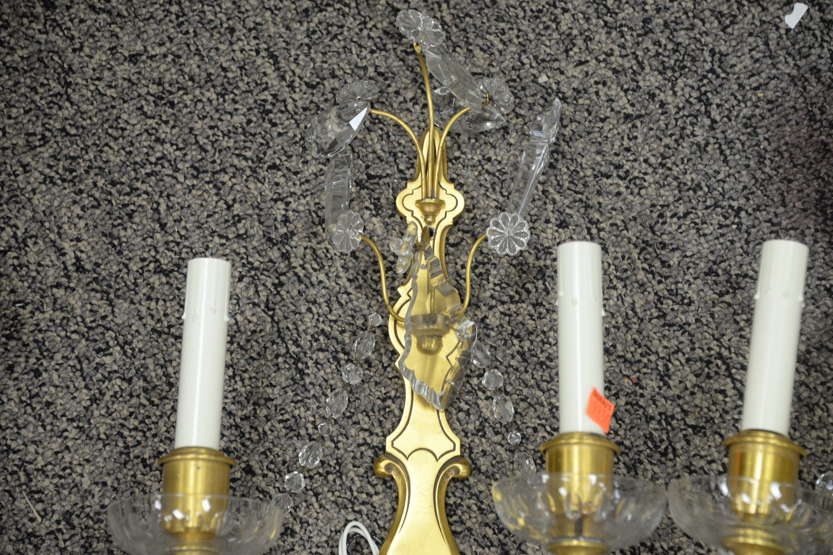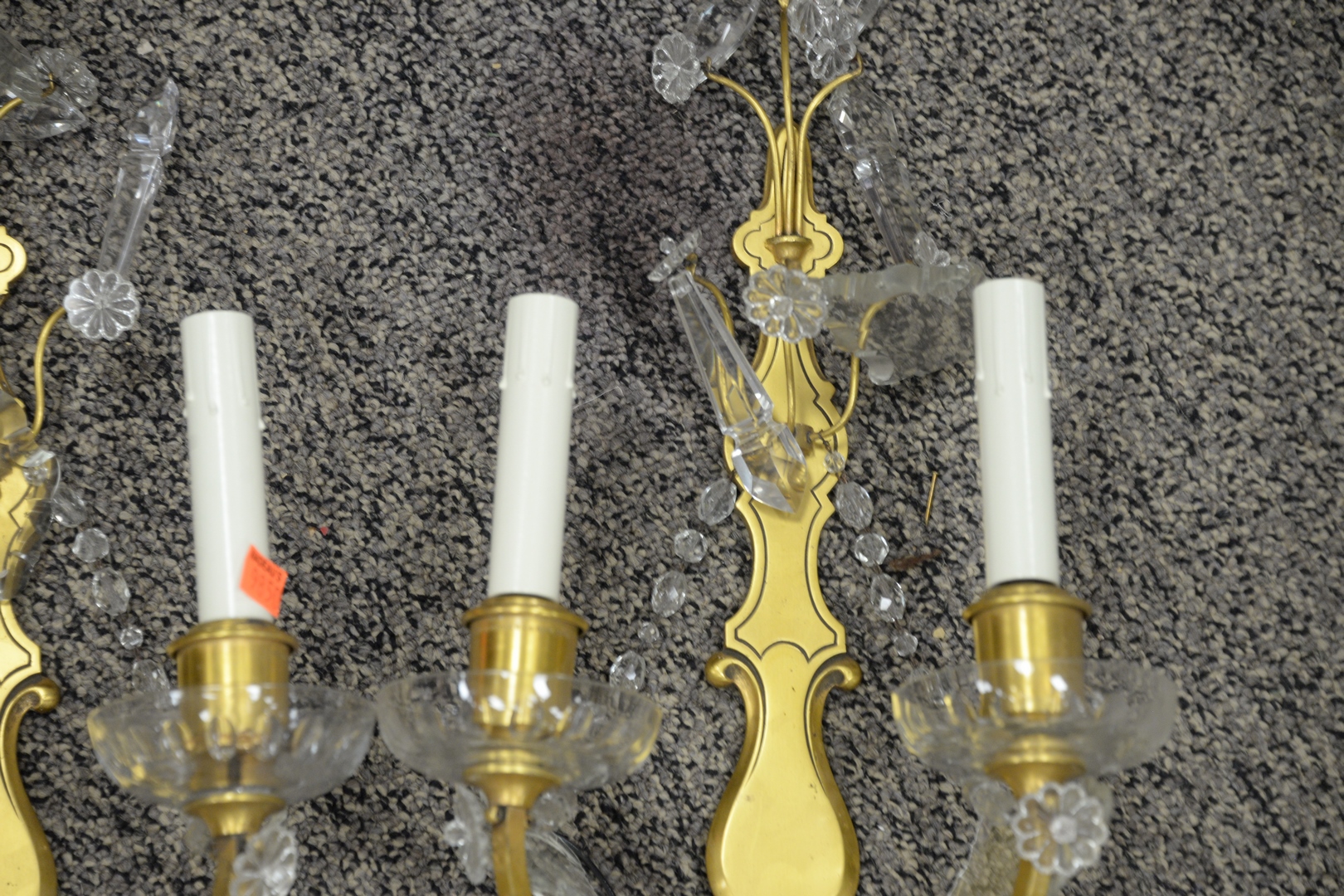 Lot 58: Pair of Brass and Rock Crystal Two Light Wall Sconces, having crystal drops and floral forms, height 11 inches, width 19 1/2 inches.