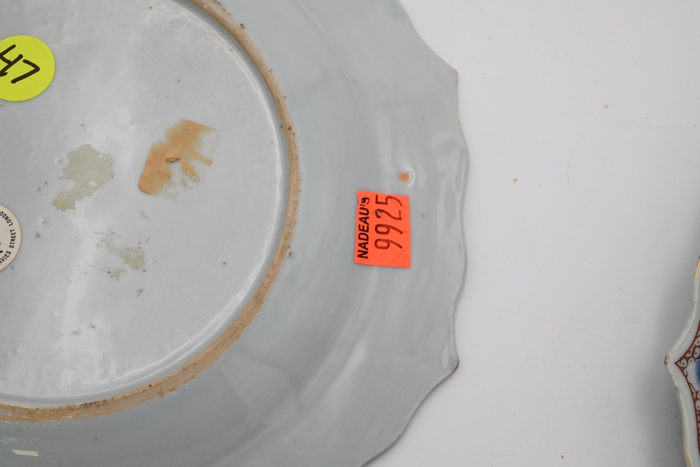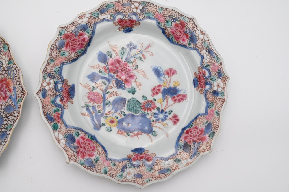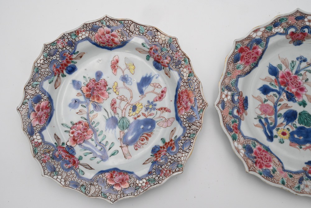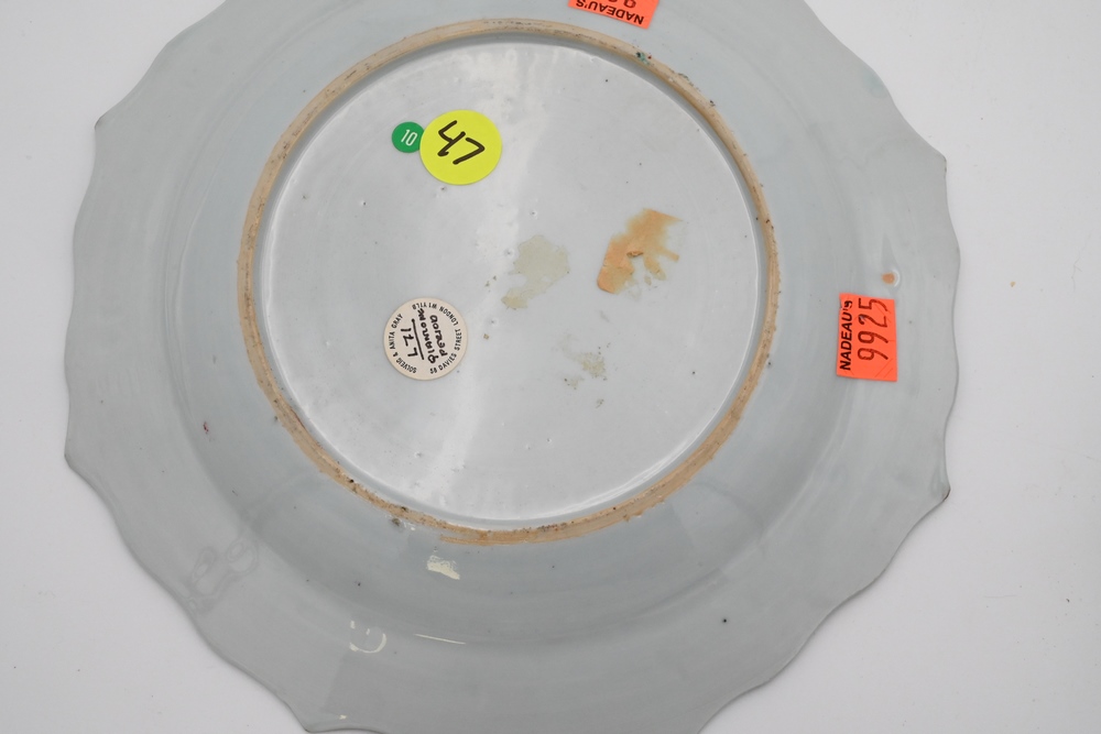 Lot 58: Pair of Chinese Qianlong Porcelain Plates having enameled flowers and decorative border 18th century or later Solveig and Anita Gray, London sticker on bottom diameter 8 7/8 inches Provenance: From a private New York City collection.