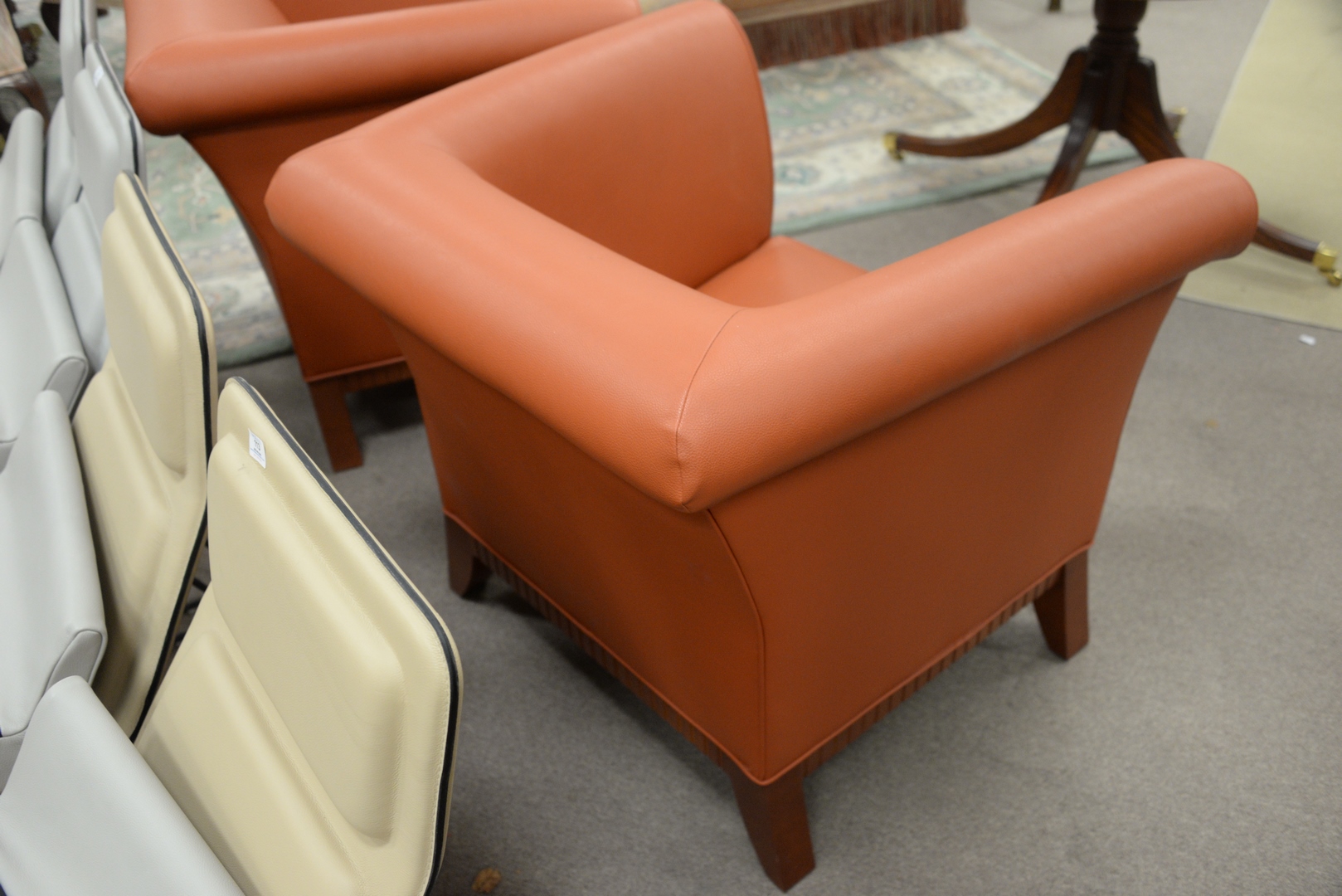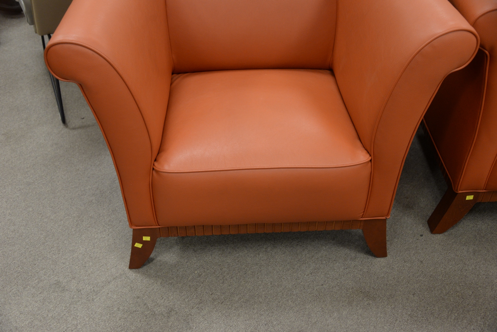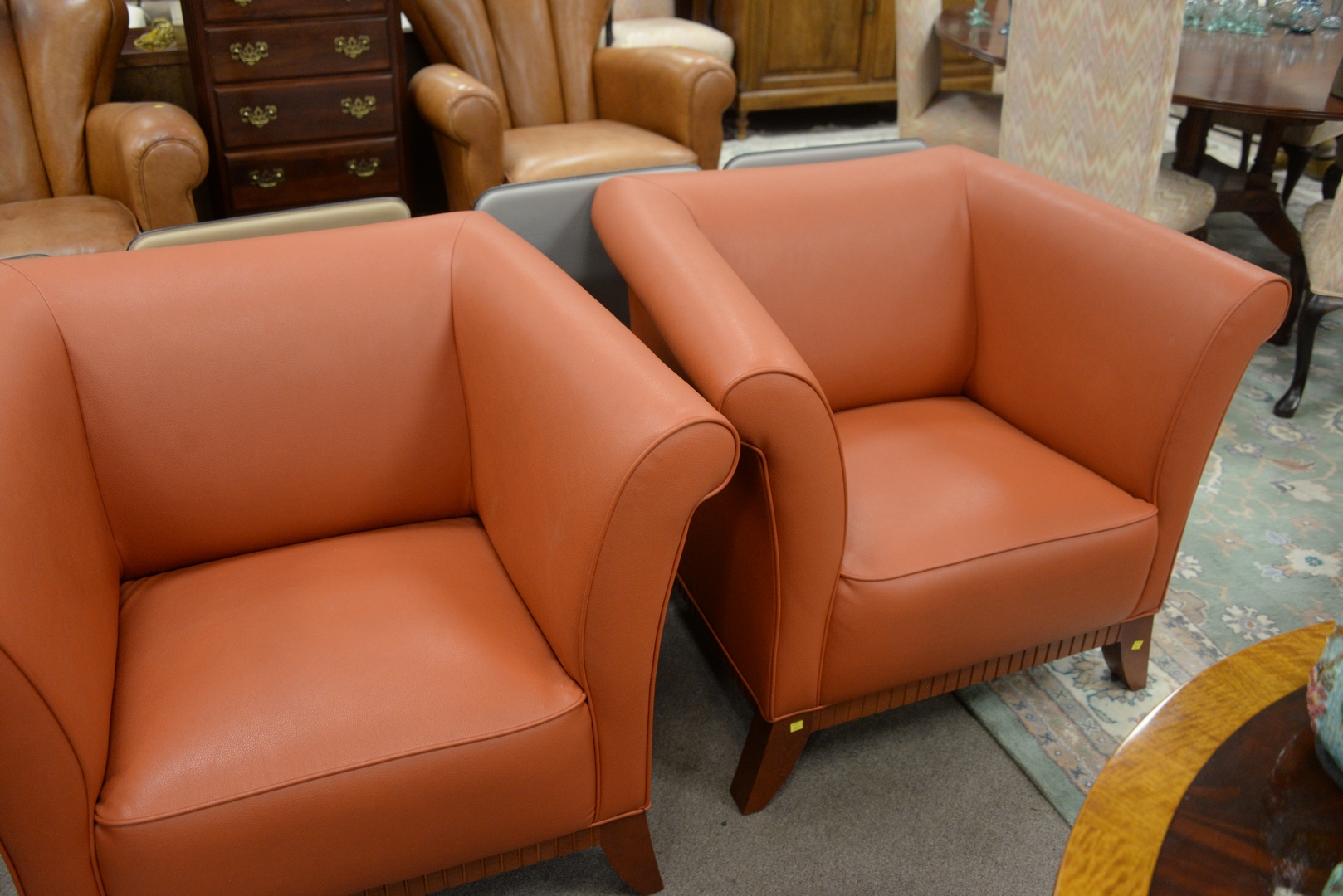 Pair of Leather Upholstered Armchairs, height 32 inches, width 37 inches.