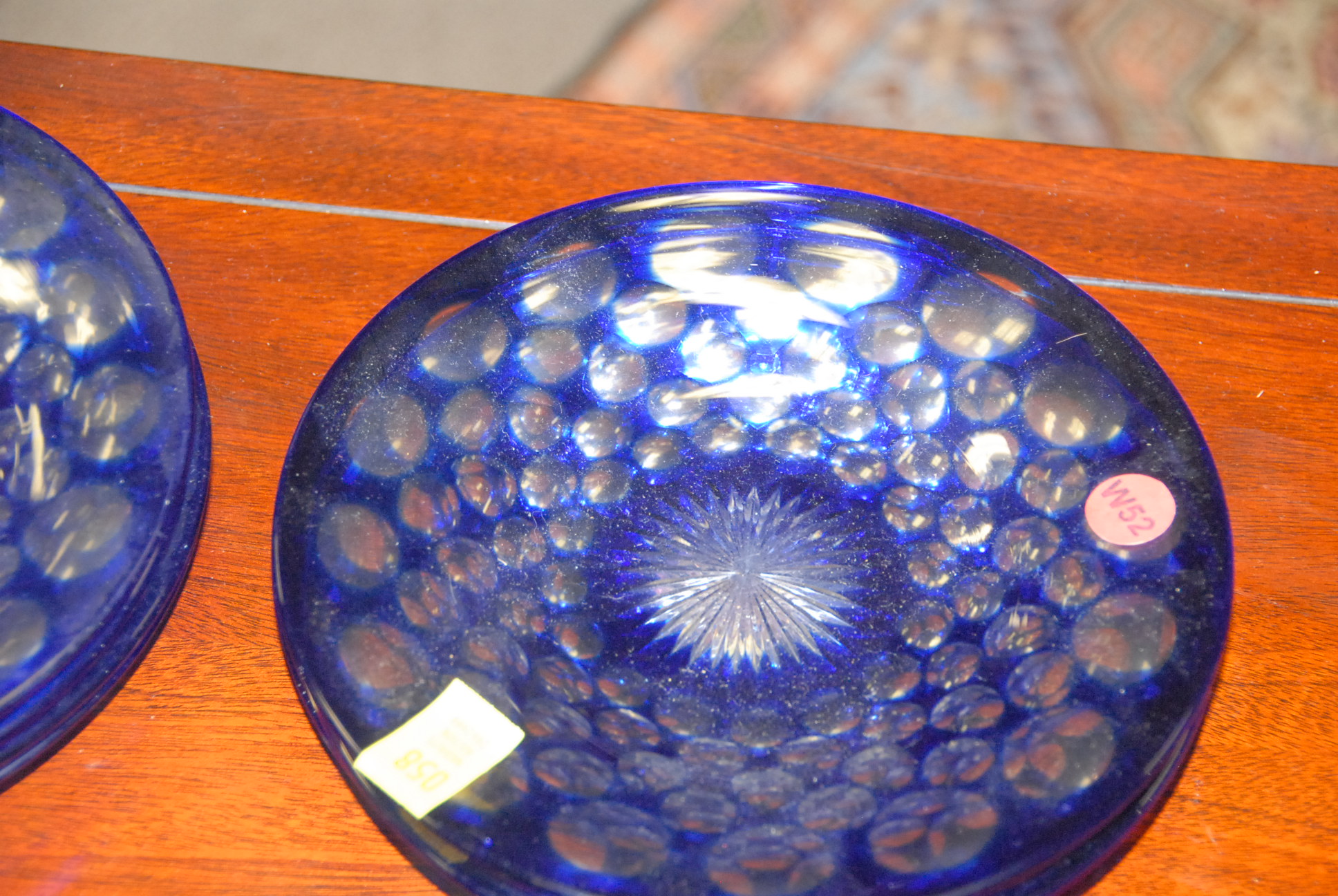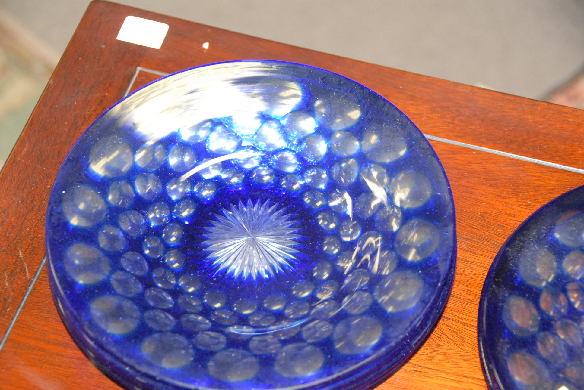 Set of twelve cobalt blue cut to clear luncheon size plates.