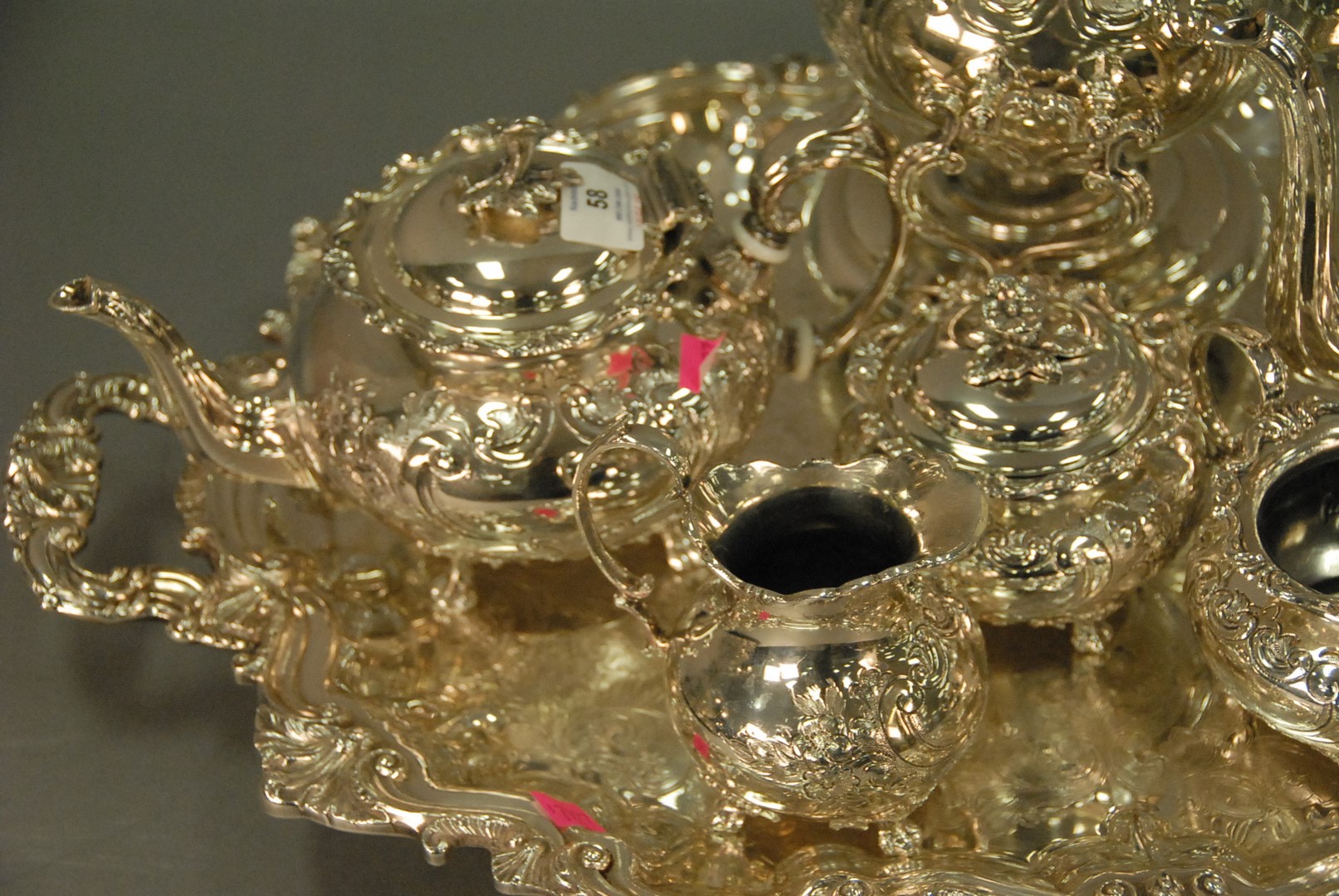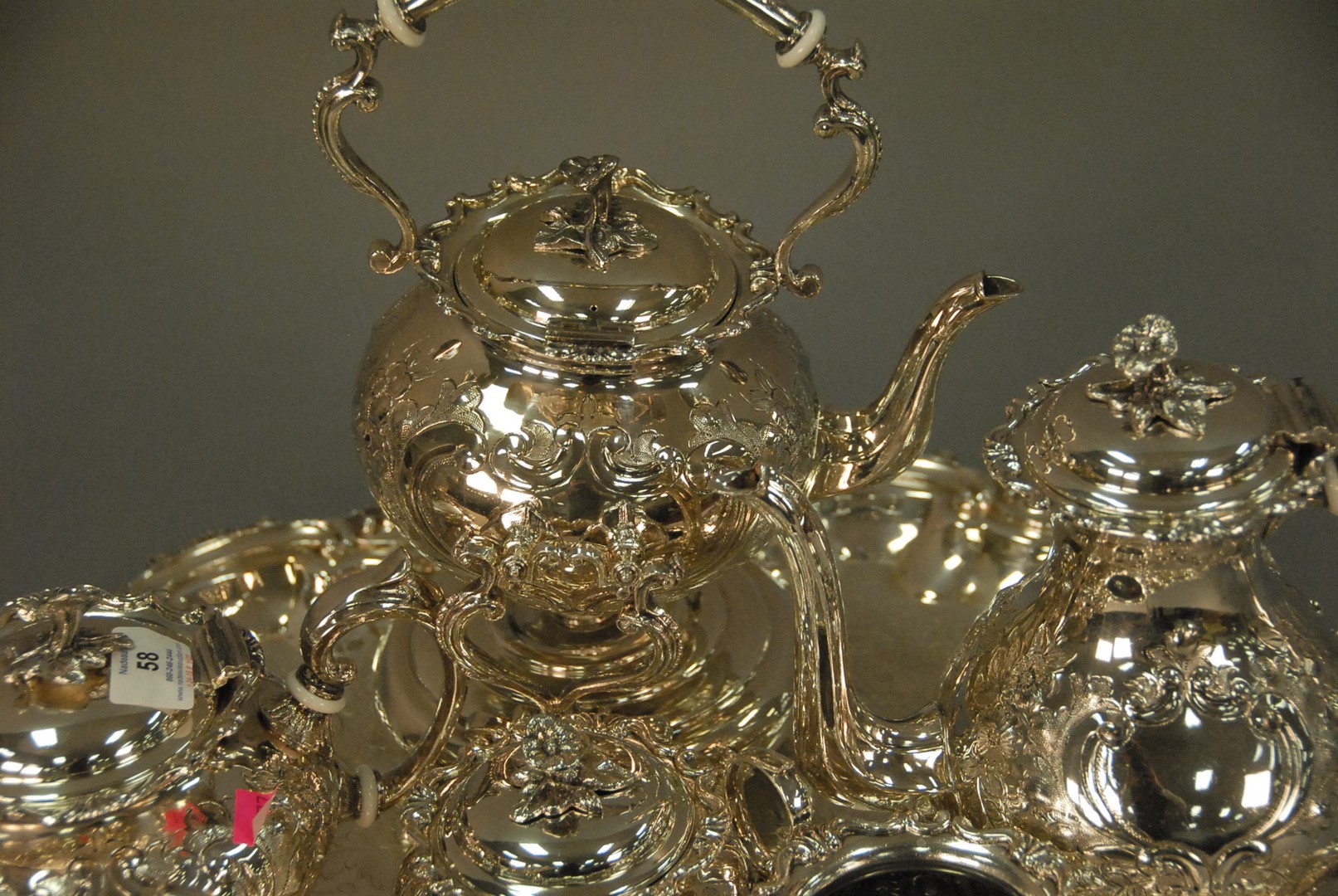 Lot 58: Seven piece silverplated tea set.