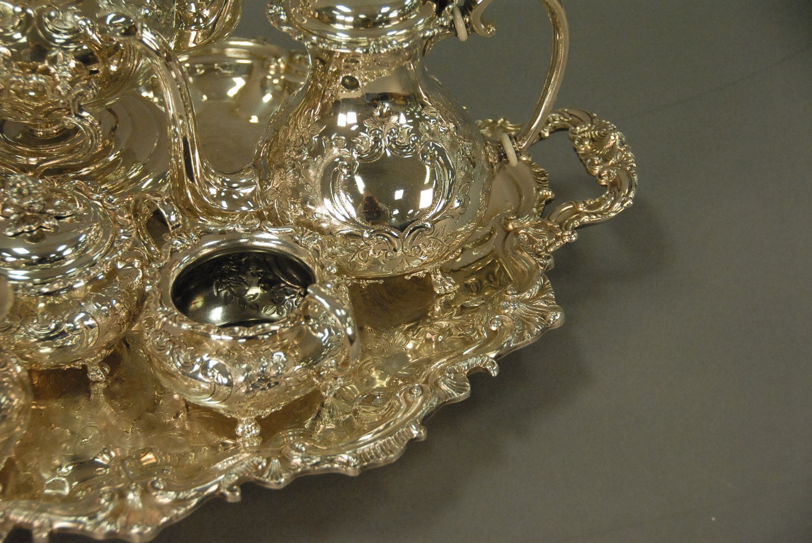 Seven piece silverplated tea set.