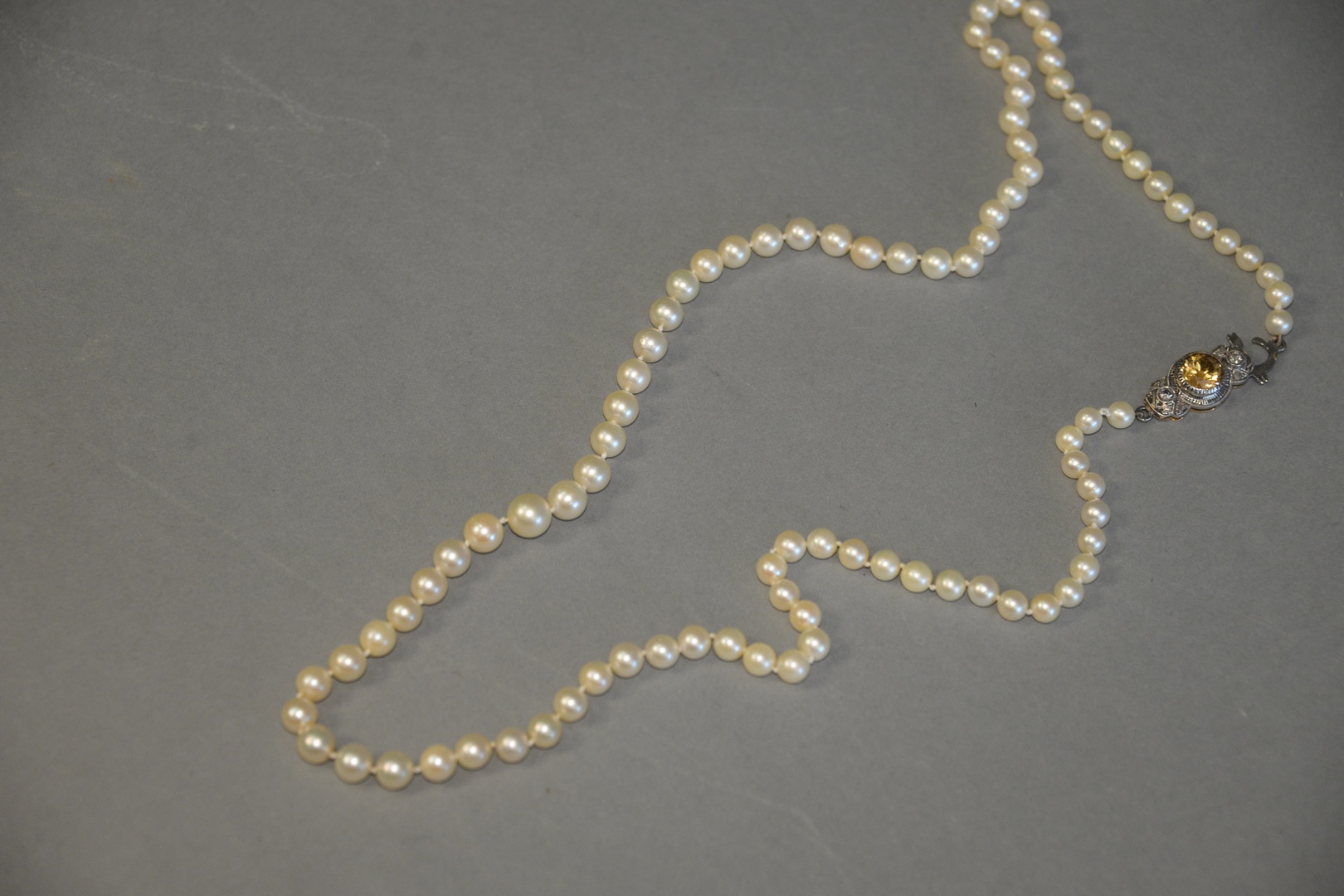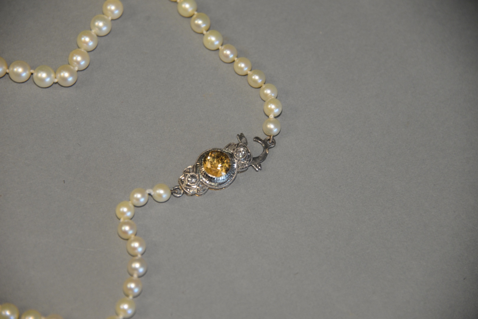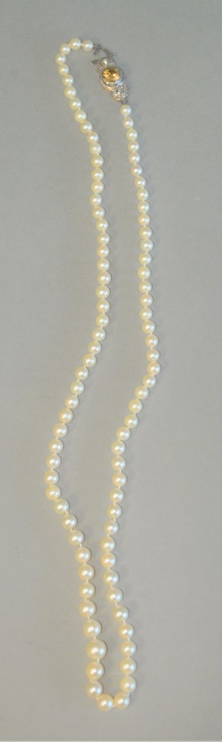 Single strand of pearls with large 18K white and yellow gold clasp set with citrine and diamonds, length 28 inches