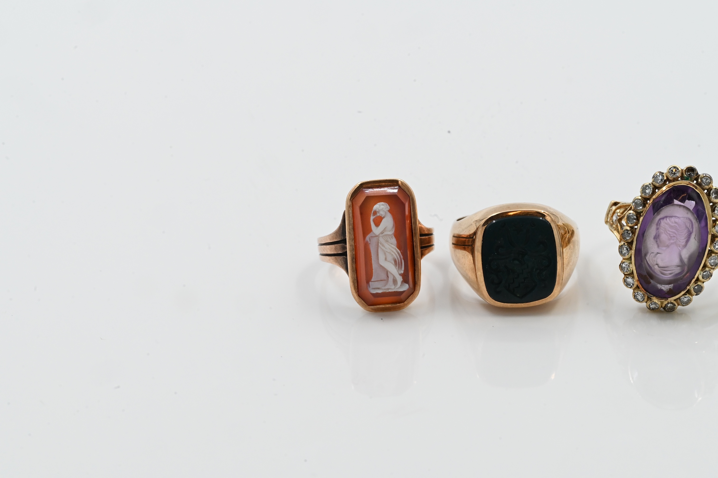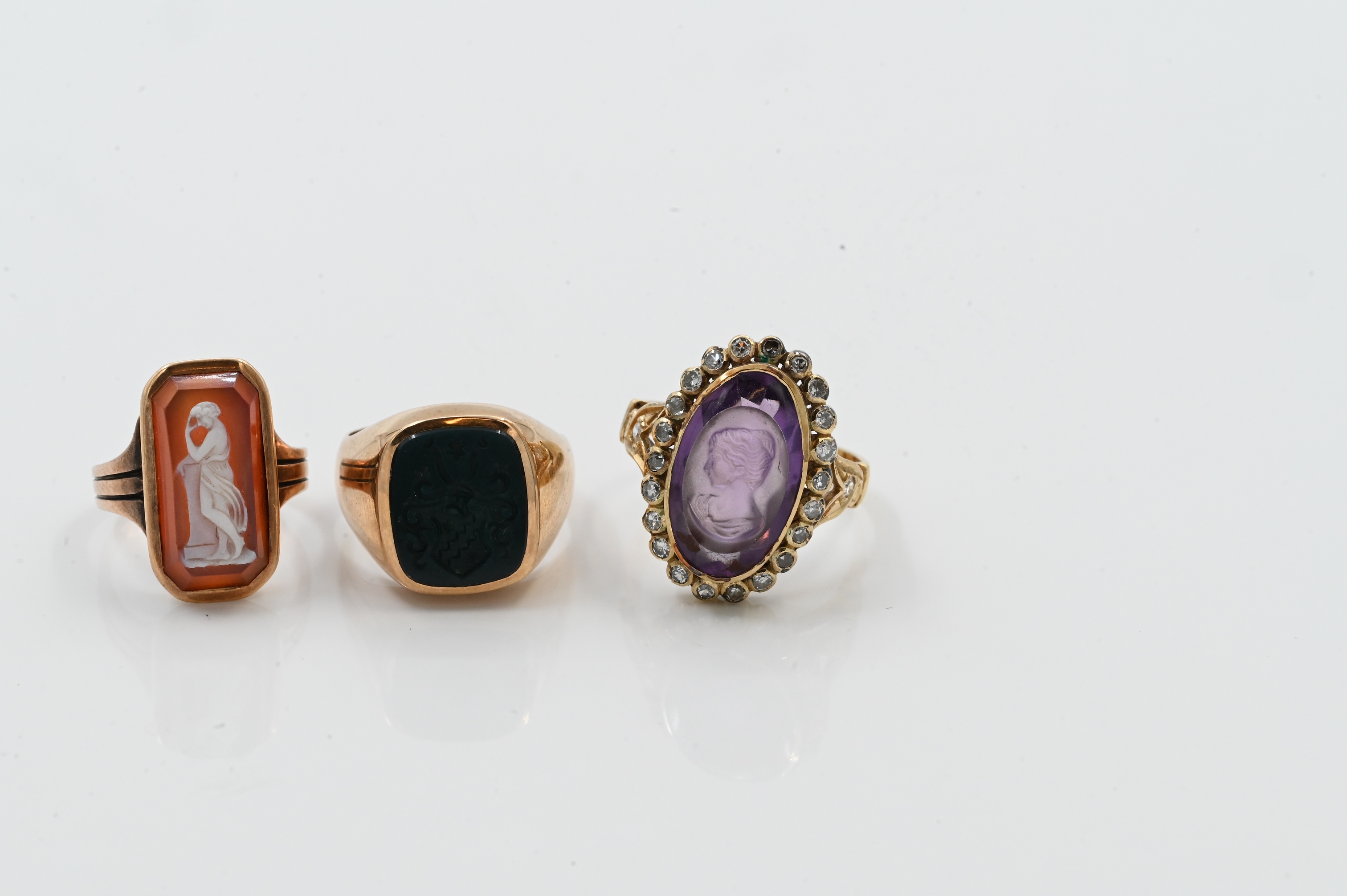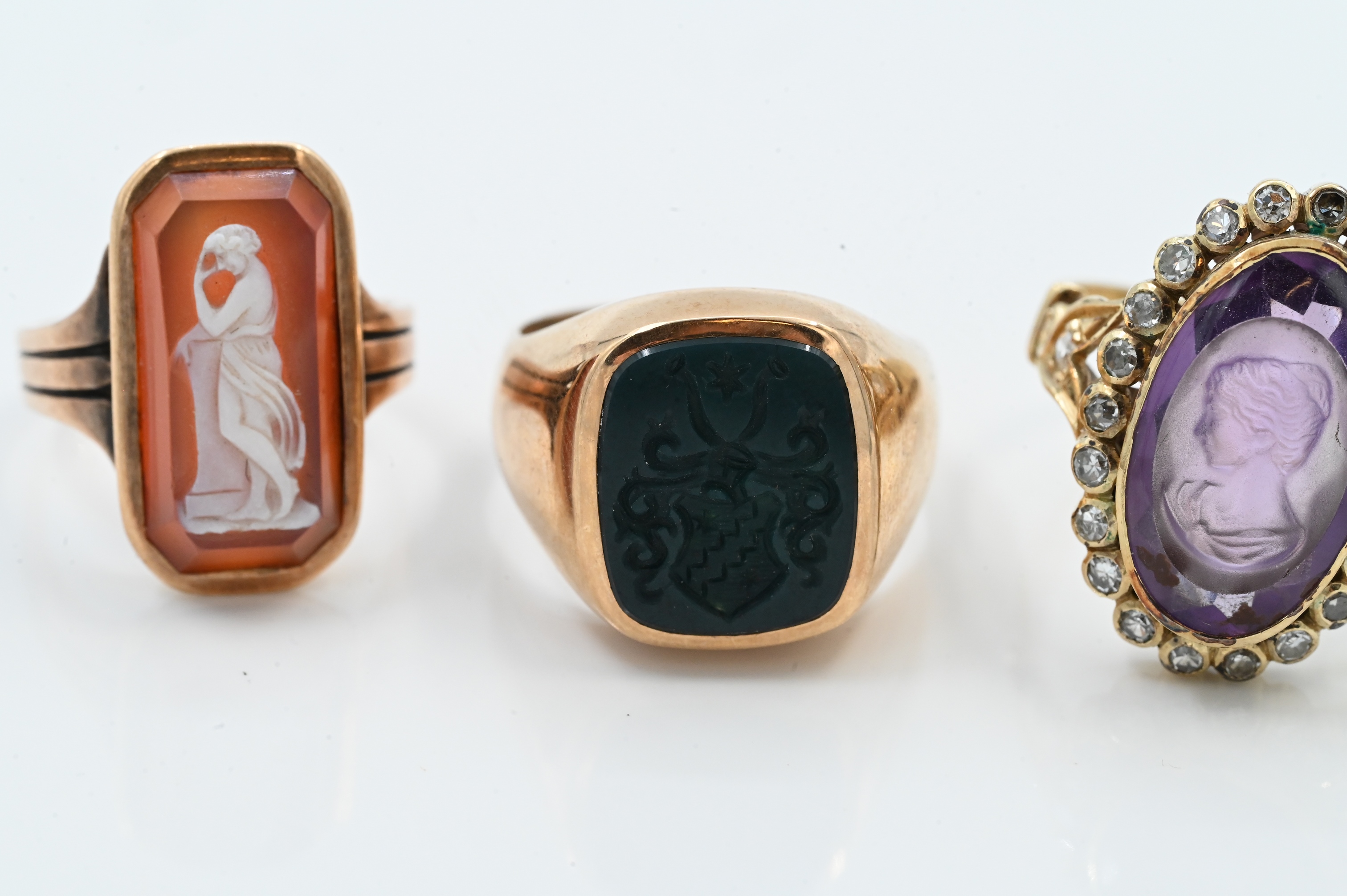 one set with green agate intaglio, one set with amethyst intaglio, and one set with cameo, sizes 3.5-8, 19 grams total weight.