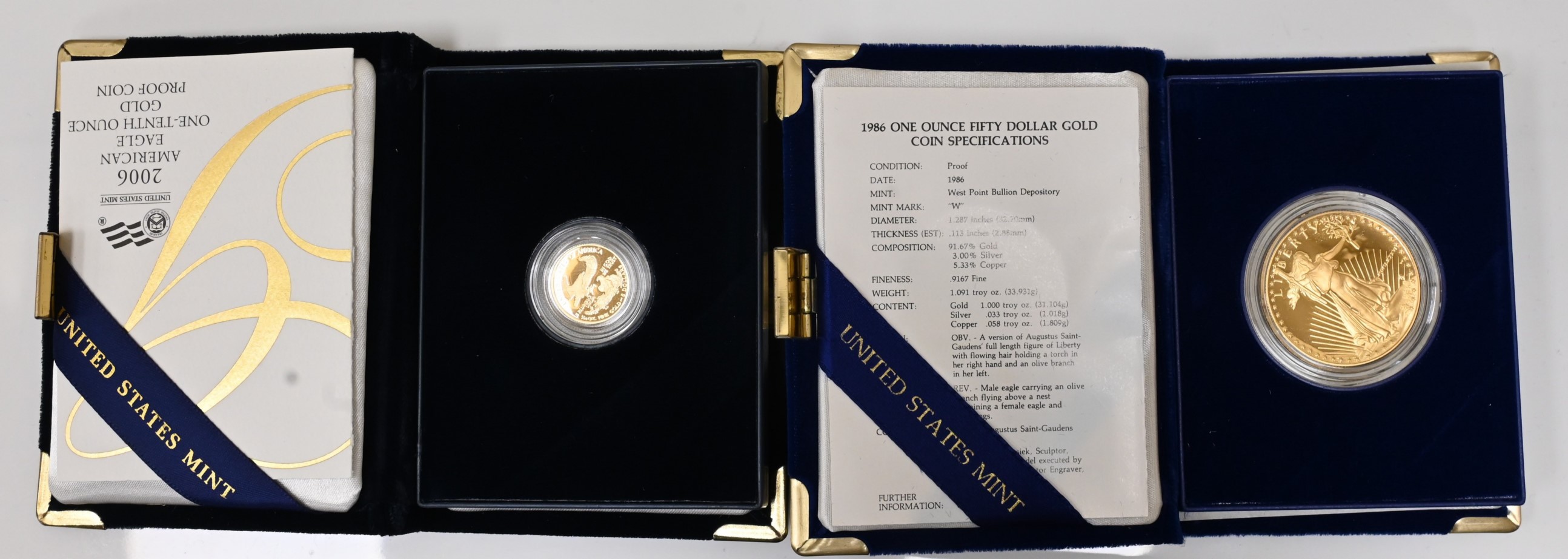 Two Gold Pieces, to include one 1986 proof one ounce Eagle and one 2006 1/10 ounce Eagle in proof.