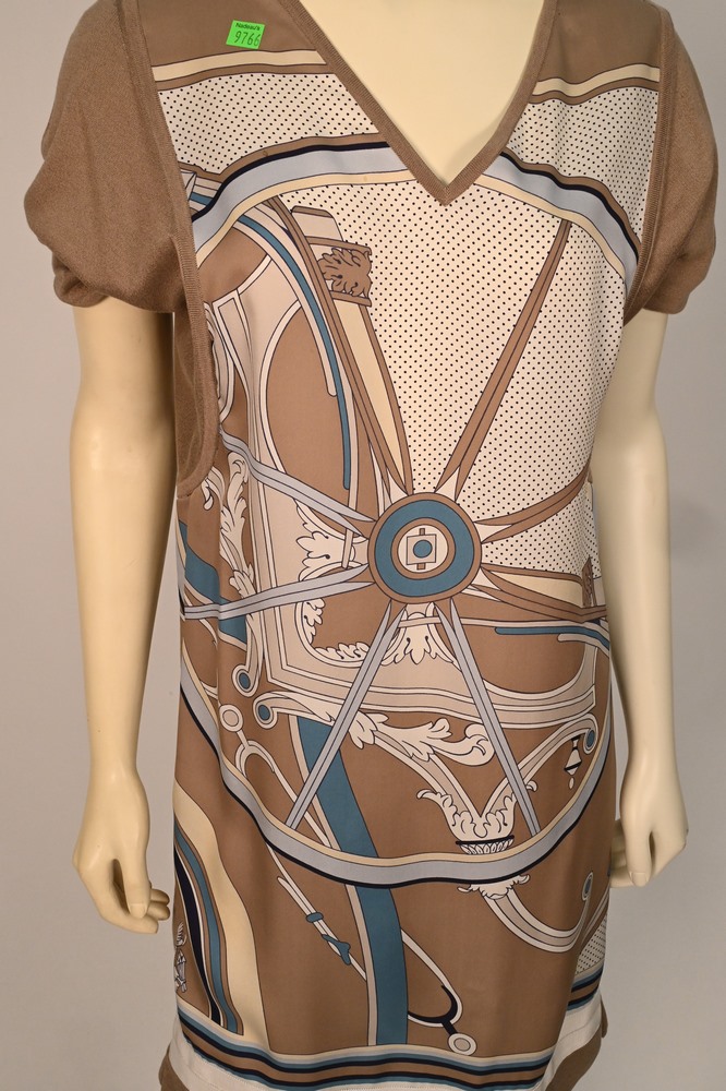 Lot 58: Vintage Hermes Silk and Jersey Knit Dress, 1970’s – 1980’s, v-neck, short sleeve, front silk pattern panel, size medium, slight stai…