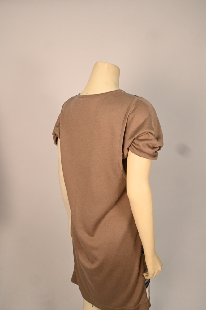 Vintage Hermes Silk and Jersey Knit Dress, 1970’s – 1980’s, v-neck, short sleeve, front silk pattern panel, size medium, slight stains in three places.