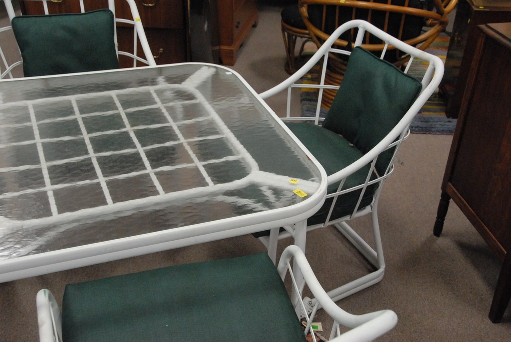 Lot 58: Winston glass top metal table and four chairs with cushions.