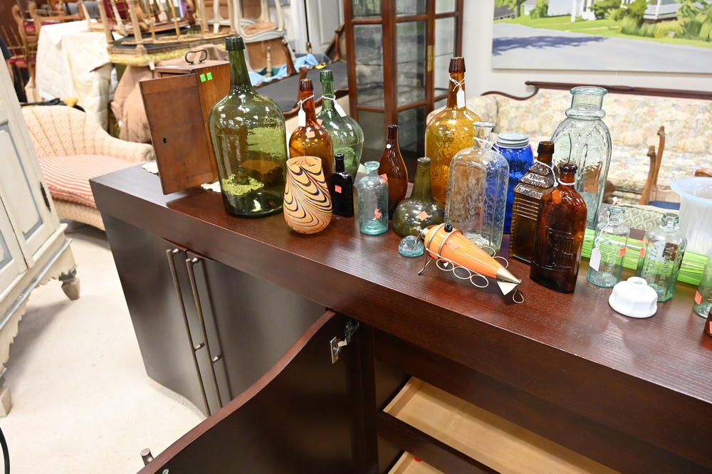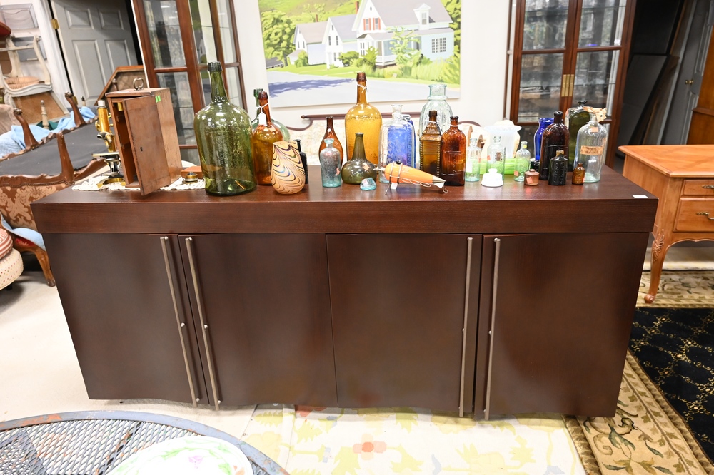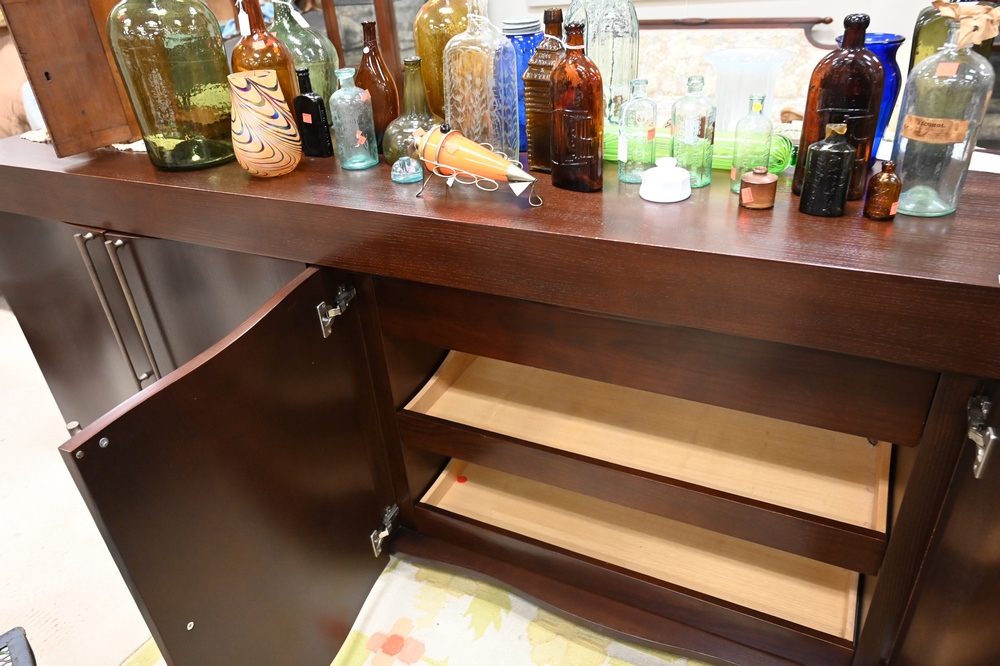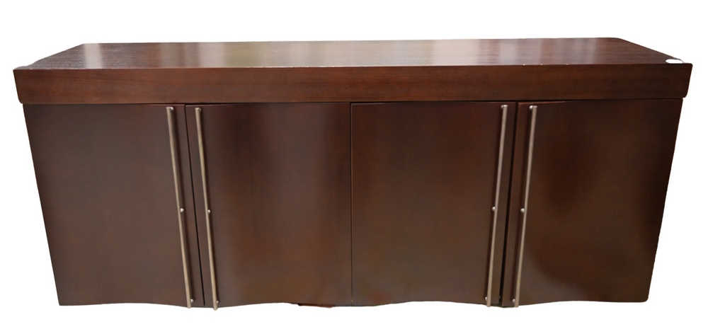 Lot 580: Contemporary Server, having four doors opening to drawers and shelves, height 37 inches, top 21 1/2 x 84 inches.