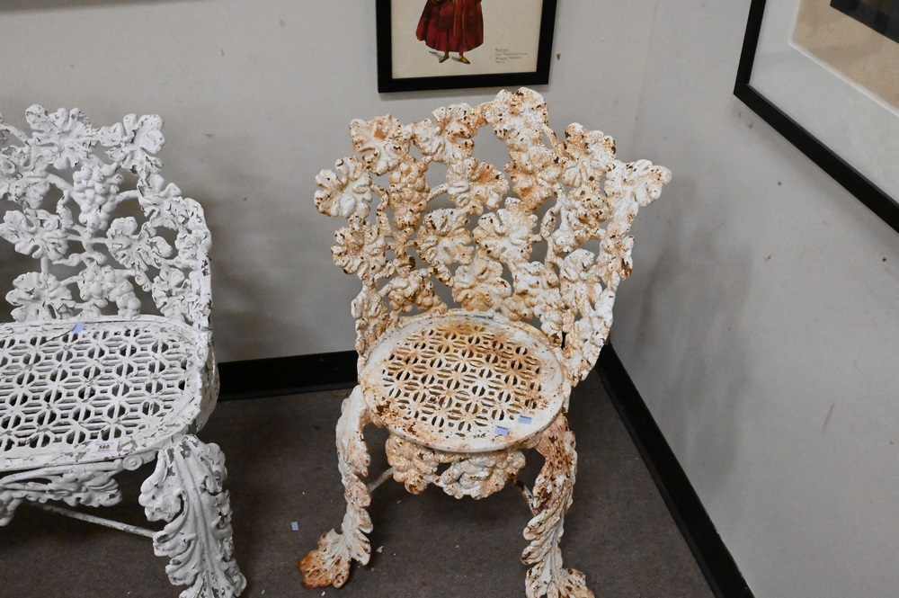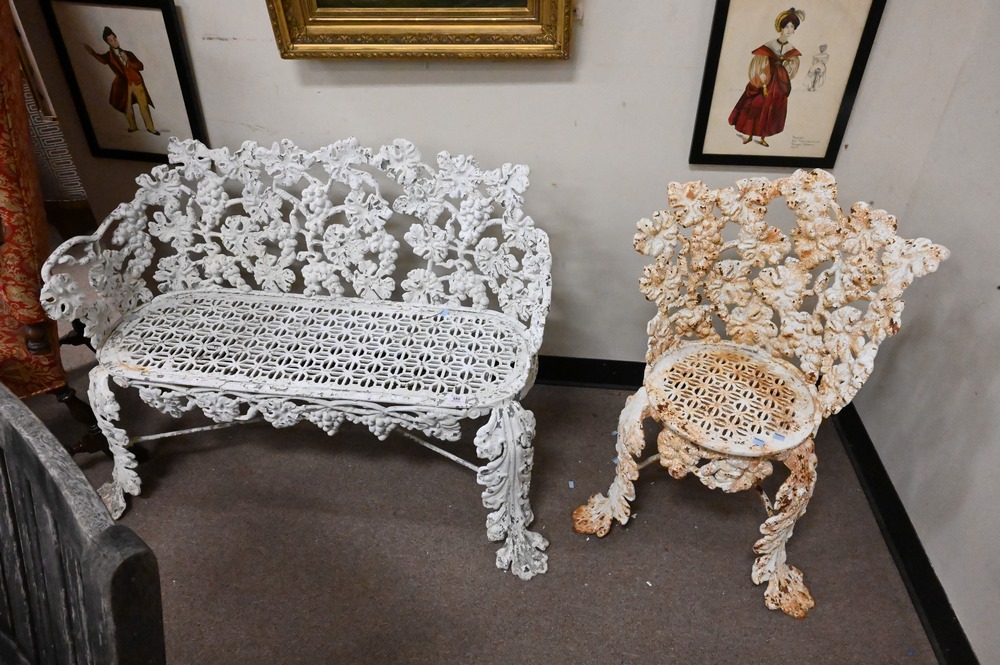 Lot 580: Iron Two-Piece Outdoor Set, to include bench with grape and leaf motif and openwork seat; along with a matching chair; height 31 inches, width 41 inches. Provenance: An estate from Redding, CT.