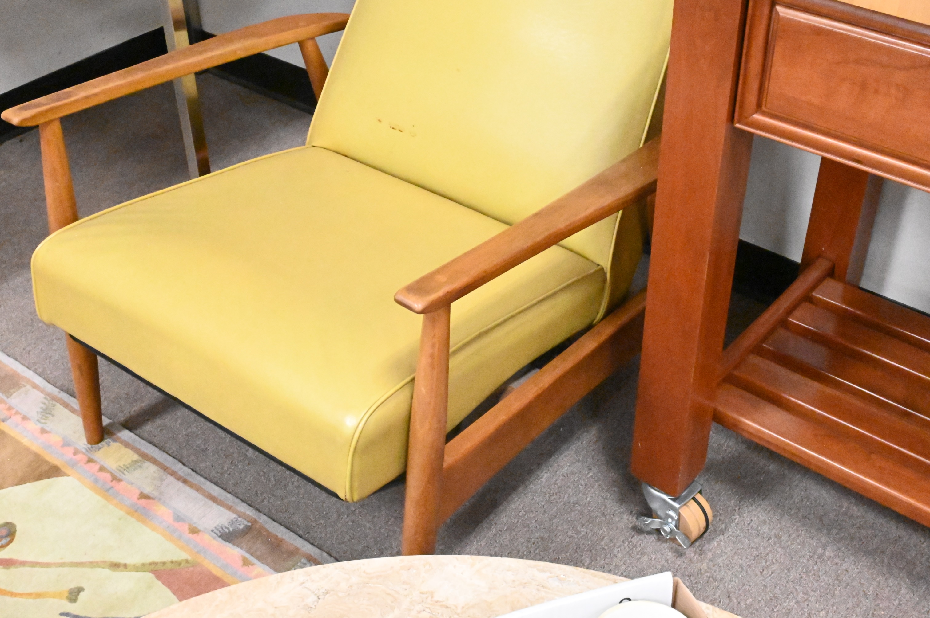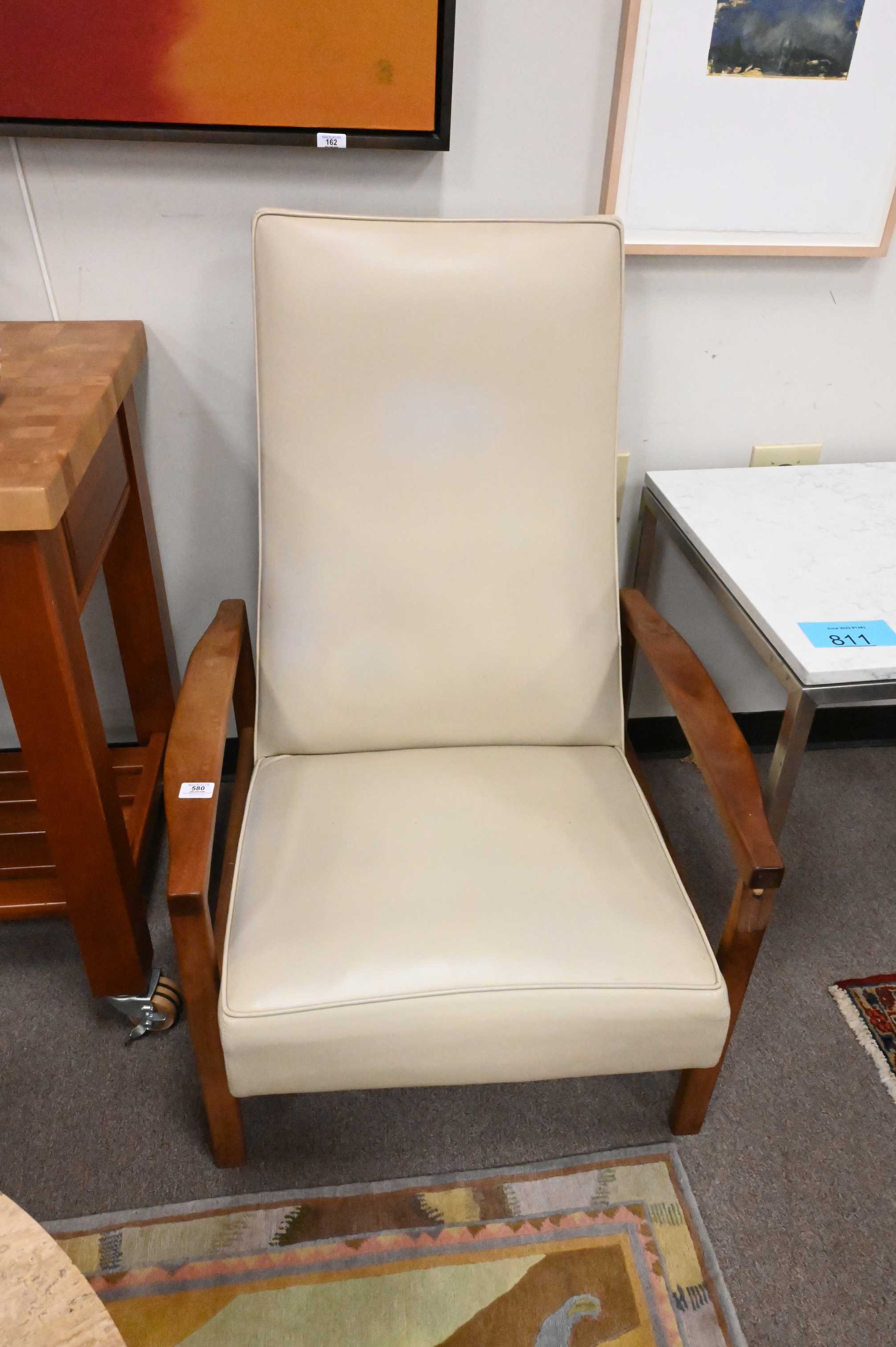Near Pair of Milo Baughman Leather Upholstered Lounge Chairs, one with loss to end of arm, height 42 inches, width 29 inches.