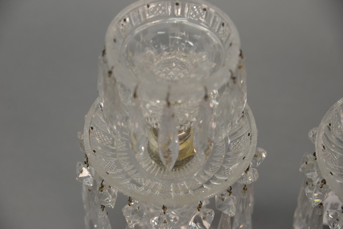 Lot 580: Pair of Anglo Irish Regency crystal candle sticks. one repaired ht. 11 1/2in. Provenance: Tho. Livingston Antiques, San Francis…