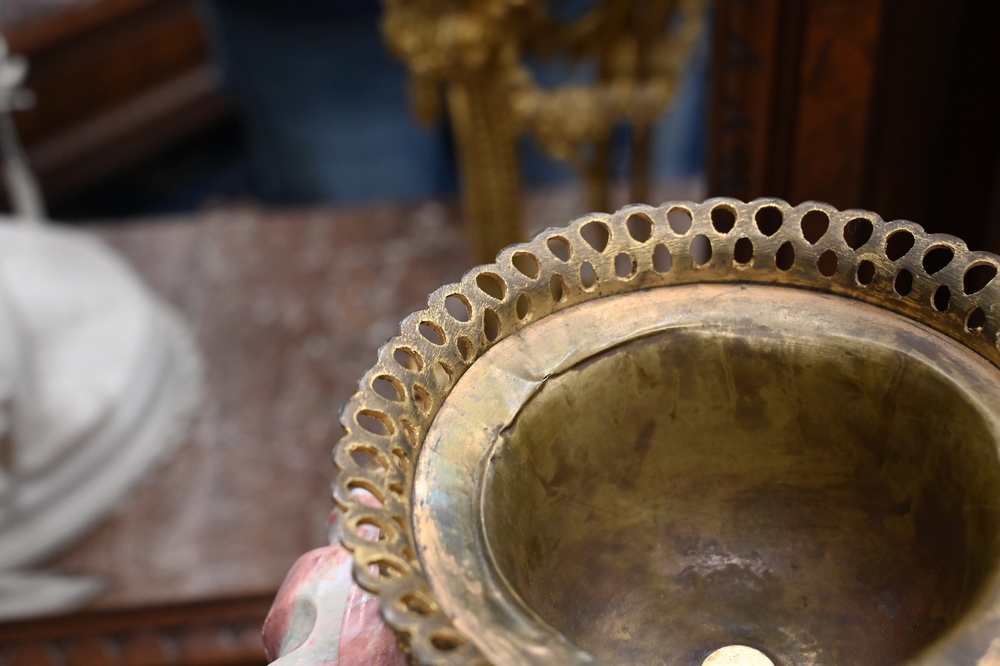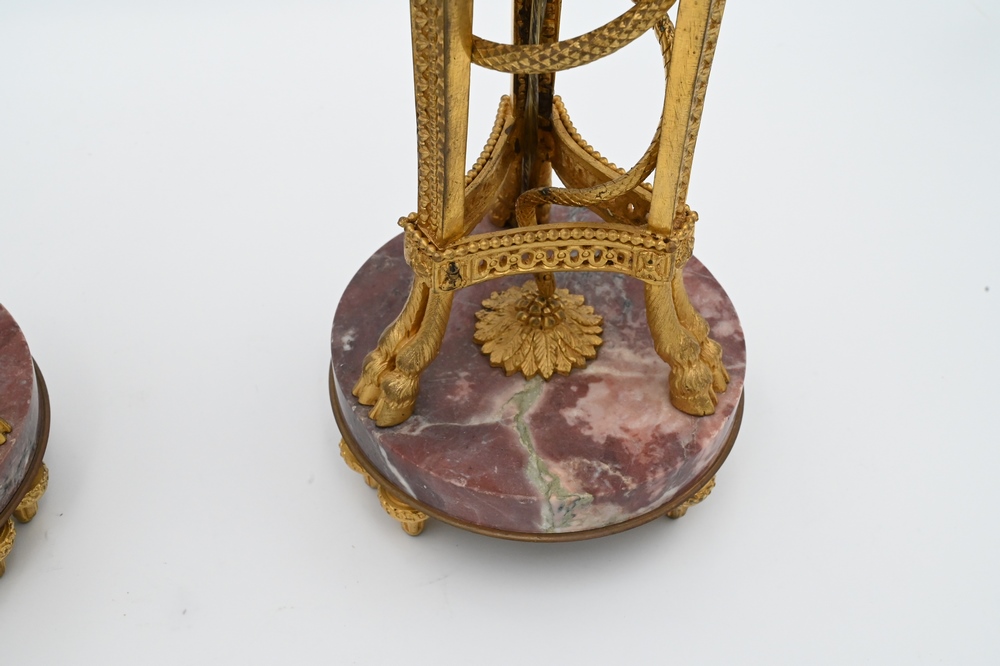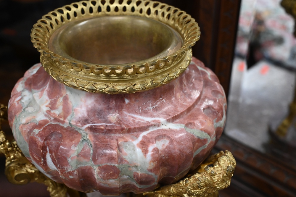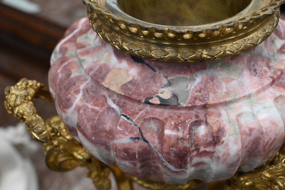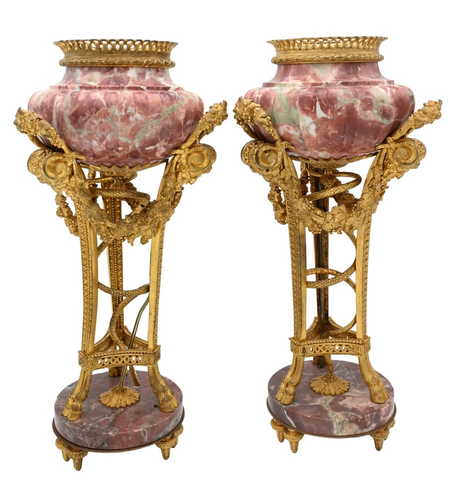 Lot 580: Pair of French Ormolu Mounted Marble Porphyry Cassolette Urns, having bulbous body, foliate ribbon vine swags on triple hoof foot su…