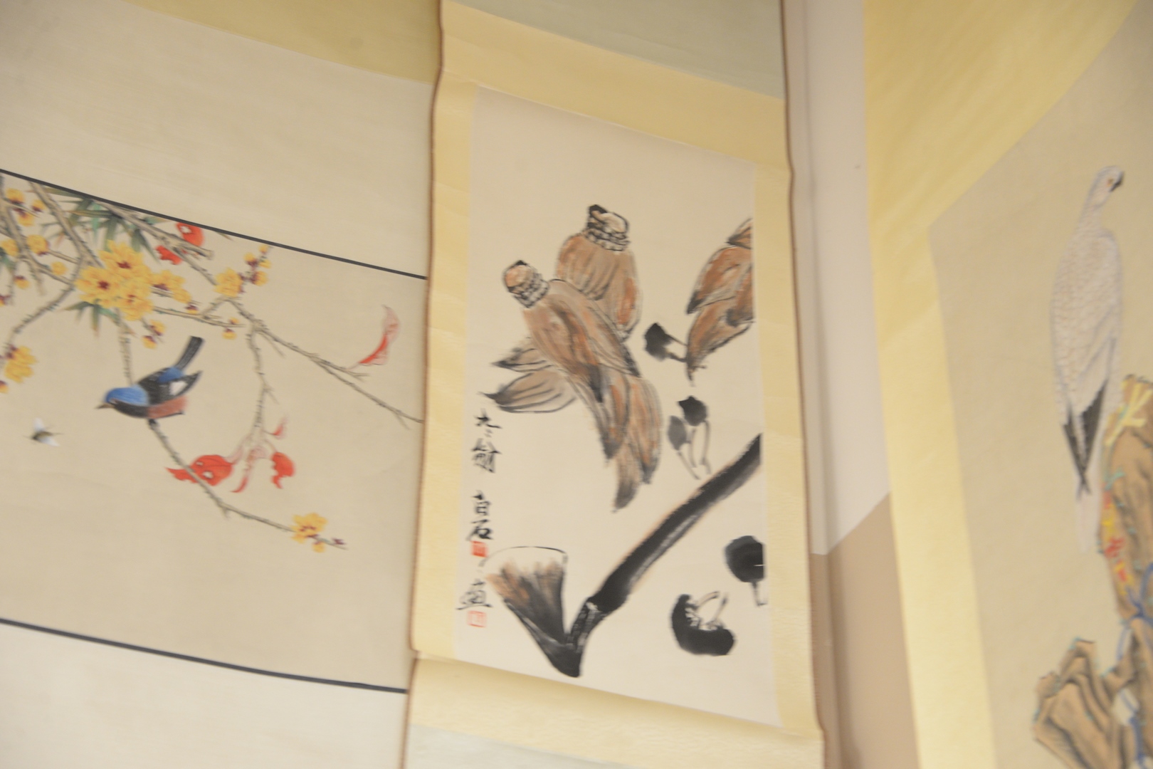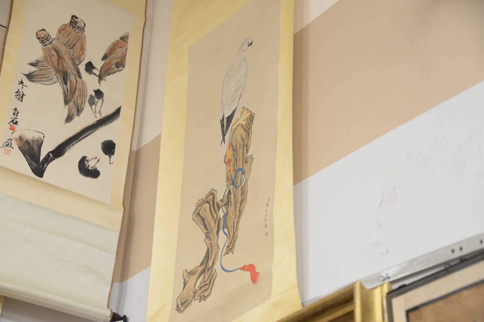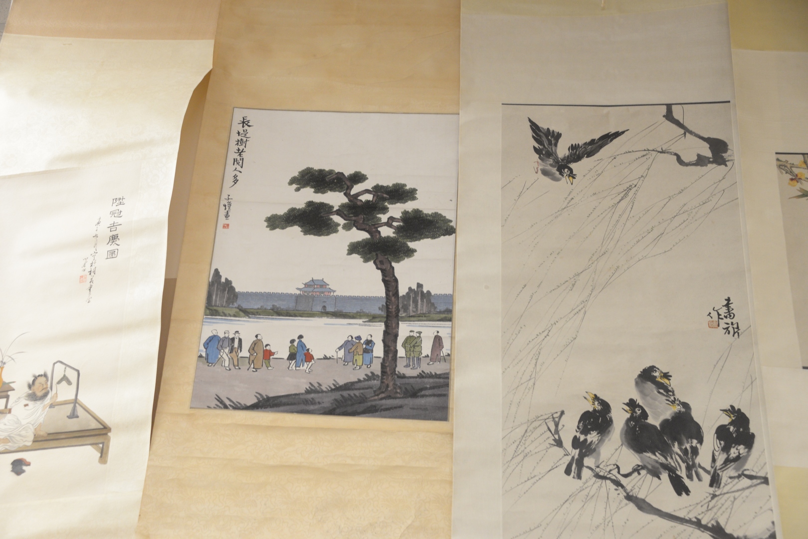 Lot 580: Six Oriental Scrolls to include watercolor Falcon tied to tree 35 x 16, watercolor of man ringing bell 25 x 12, and watercolor of six black birds 27 x 17 along with watercolor on paper landscape 26 x 18, watercolor on paper birds and bug 17